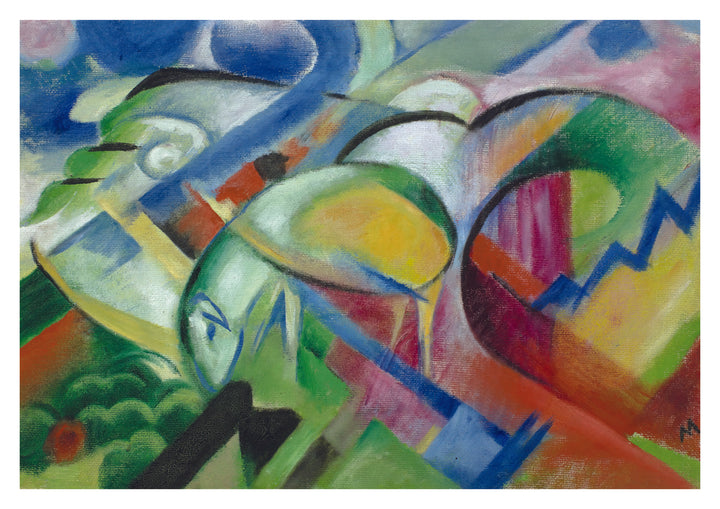 Experience the dynamic energy of "The Sheep" by Franz Marc with this cubism-inspired abstract landscape poster. Vivid geometric forms and vibrant colours blend seamlessly to depict sheep amidst a forest. This artwork's bold use of shapes and hues creates a compelling visual narrative, perfect for those seeking a unique and striking nature-inspired piece.