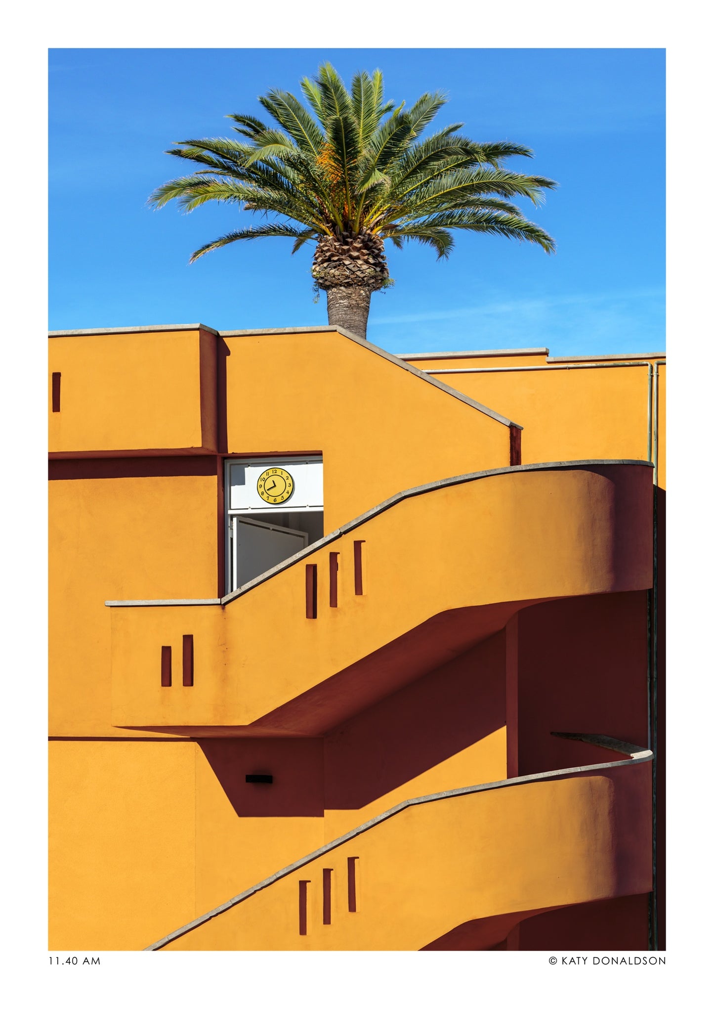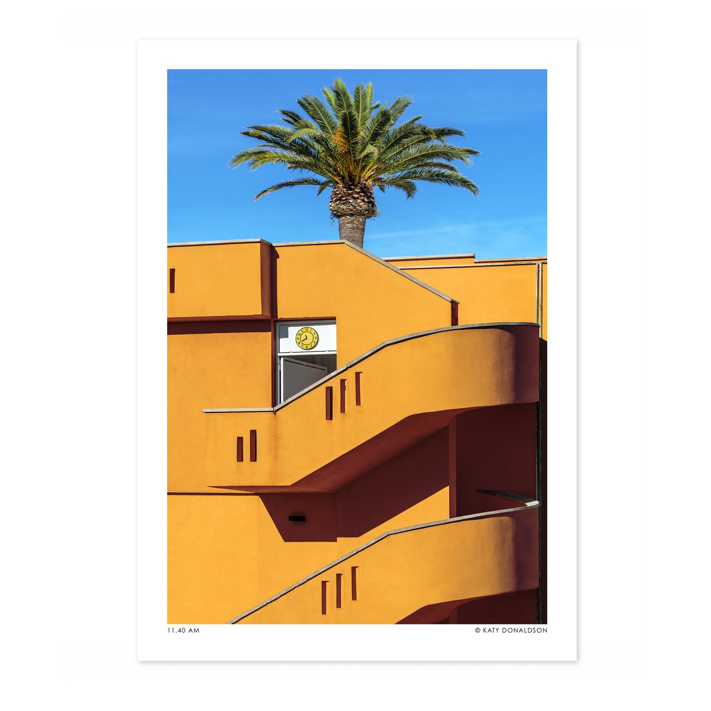 Discover the vibrant photographic poster "11:40" by Katy Donaldson, capturing striking architecture fused with nature. A vivid orange building flaunts geometric staircases against a clear blue sky, crowned by a lush palm tree. An embedded clock adds a unique touch, blending urban design with tropical elements, making this portrait a standout piece for contemporary spaces.