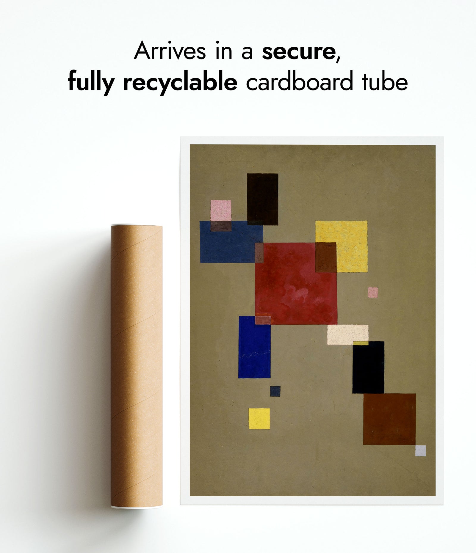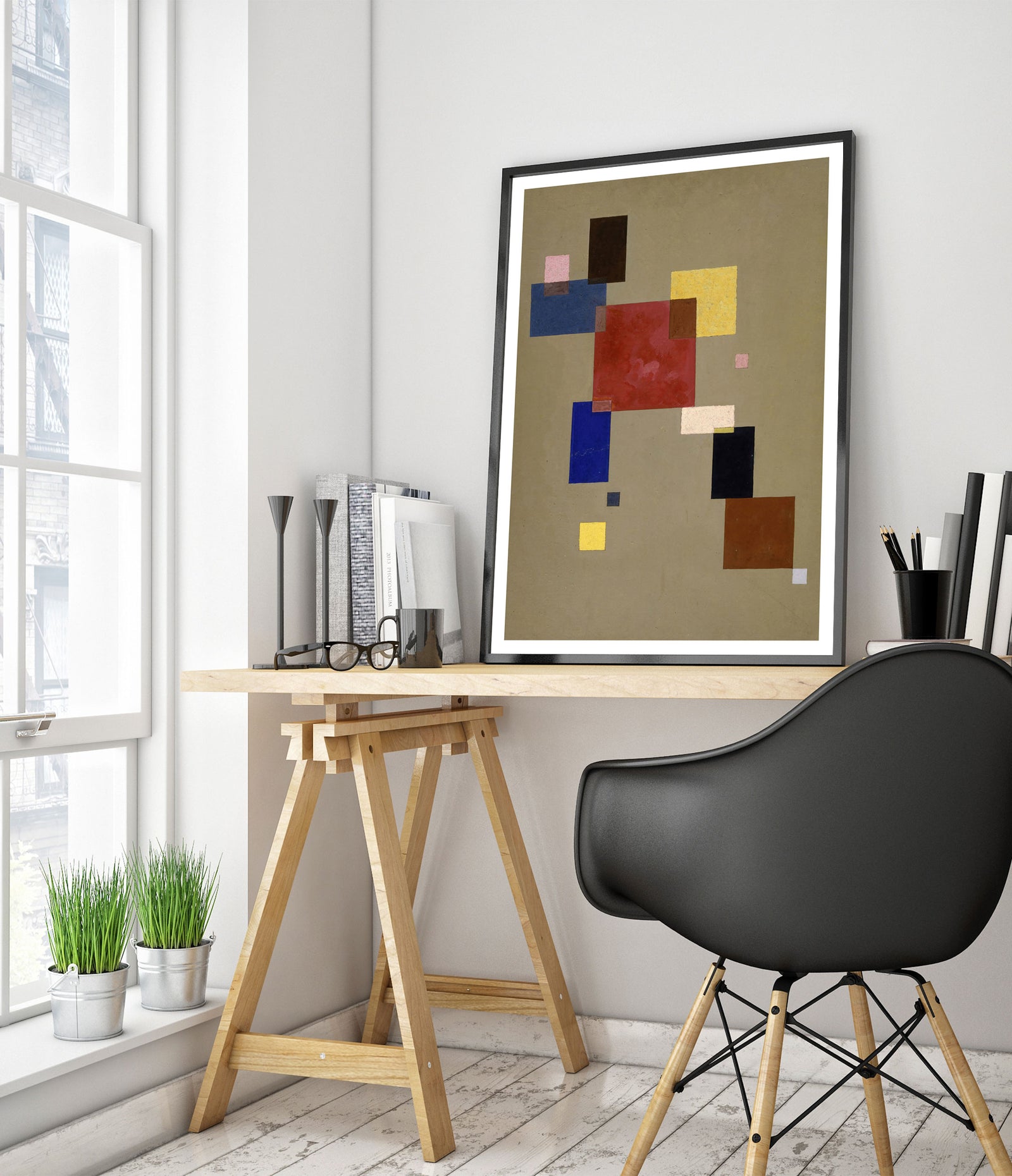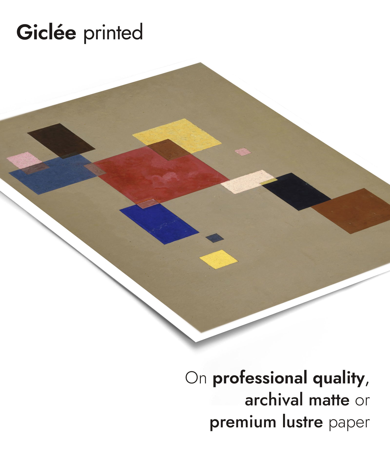 Enhance your space with the "13 Rectangles" poster by Wassily Kandinsky. This minimalist Bauhaus-inspired abstract artwork features an array of overlapping rectangles in primary colours against a muted background. Perfect for adding a touch of mid-century modern flair to any room, this piece embodies geometric precision and artistic harmony.