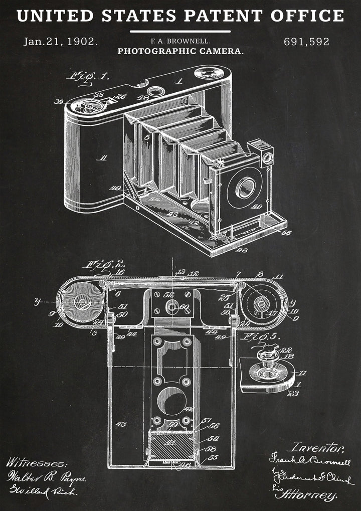 This "1902 Camera" vintage poster showcases the detailed patent schematic of an early photographic camera. Rendered in line art, this illustration captures the intricate mechanics and design by F.A. Brownell, as documented by the United States Patent Office. The monochrome palette and meticulous detailing make it an ideal piece for enthusiasts of vintage technology and photographic history.