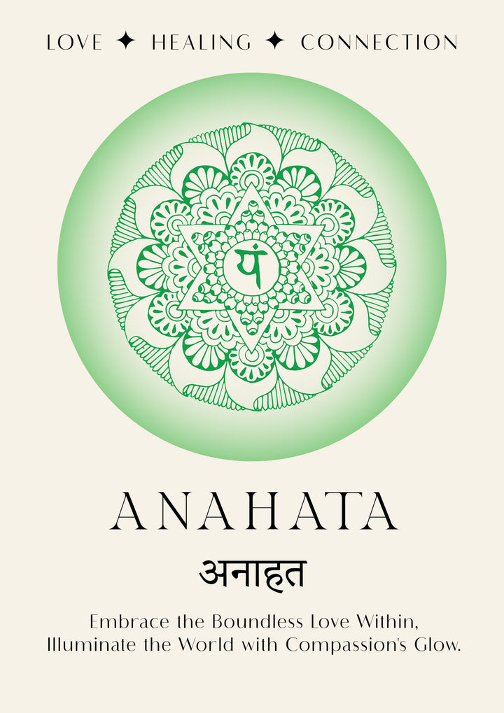 The "Heart Chakra" poster features a detailed, green mandala symbolizing Anahata, the fourth chakra. Centered in soothing, harmonious hues, this spiritual piece emphasizes love, healing, and connection. Ideal for meditation spaces or as a serene decorative element, it's perfect for those interested in Hinduism, Buddhism, and tantric practices. The accompanying mantra text enhances its meditative quality.