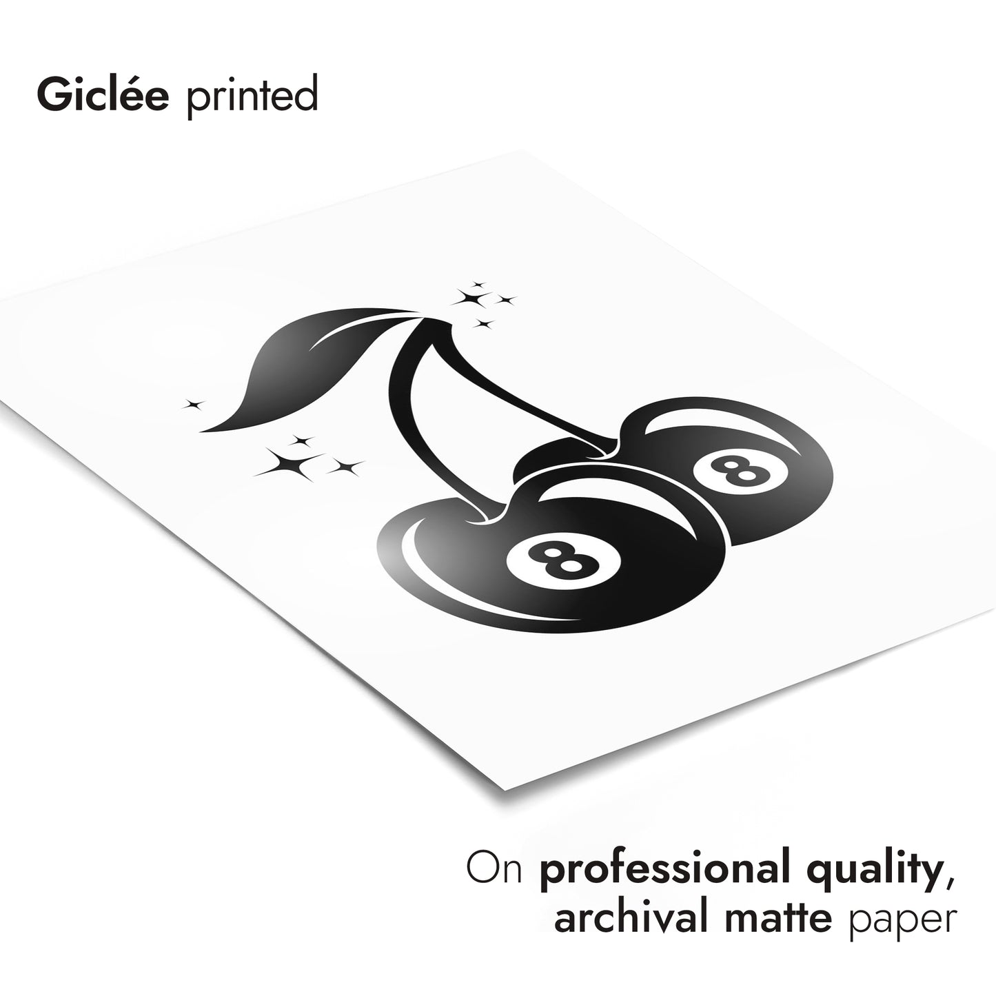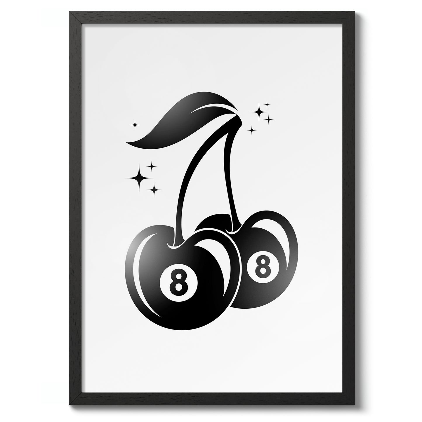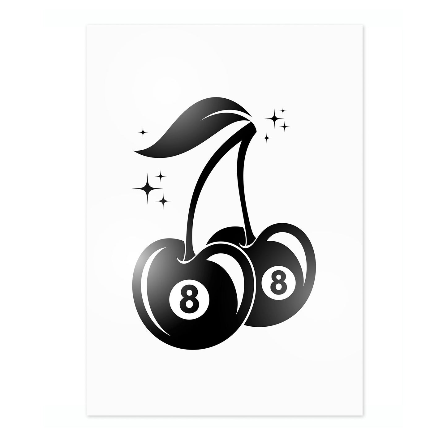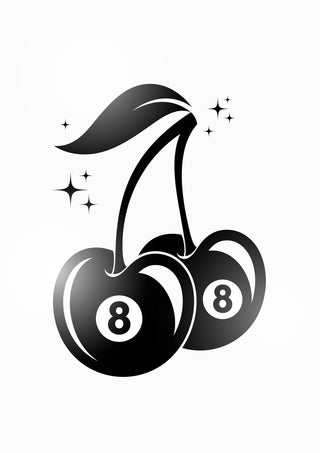 The "8 Ball Cherry" poster combines graphic minimalism with a playful design. Featuring two cherries with 8-ball imagery, this black and white artwork subtly nods to graffiti culture. The sharp, clean lines and vibrant theme make it a striking piece for contemporary spaces, blending fruit symbolism with a billiards reference, perfect for modern decor enthusiasts.