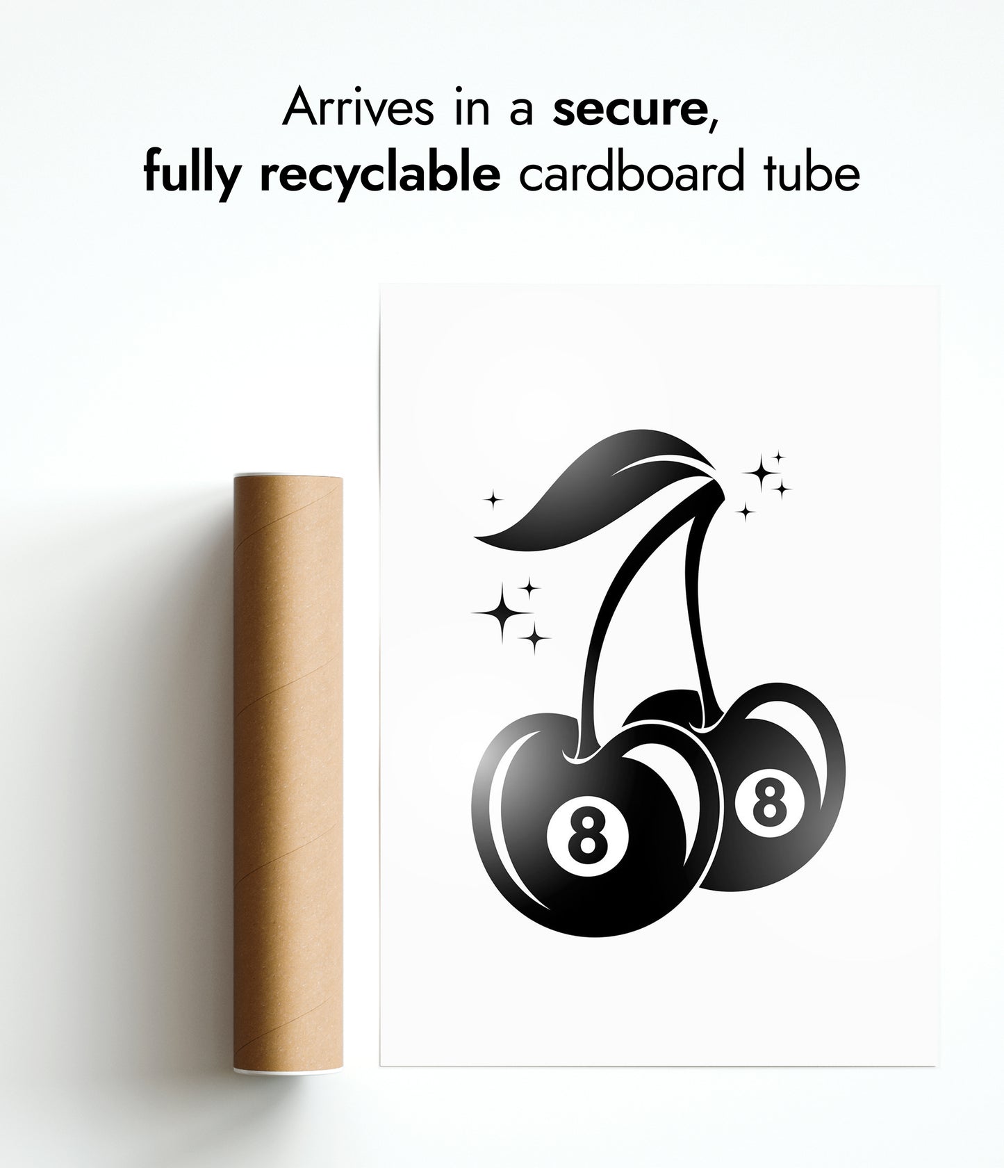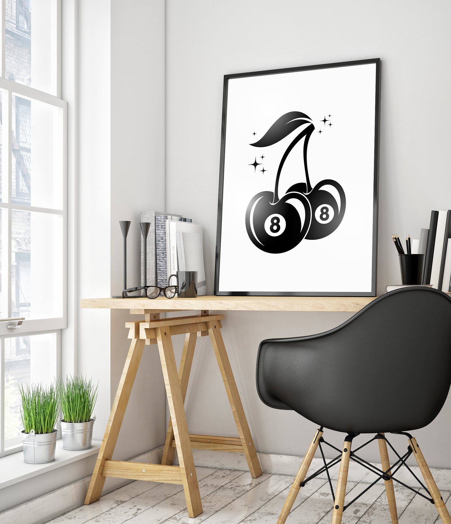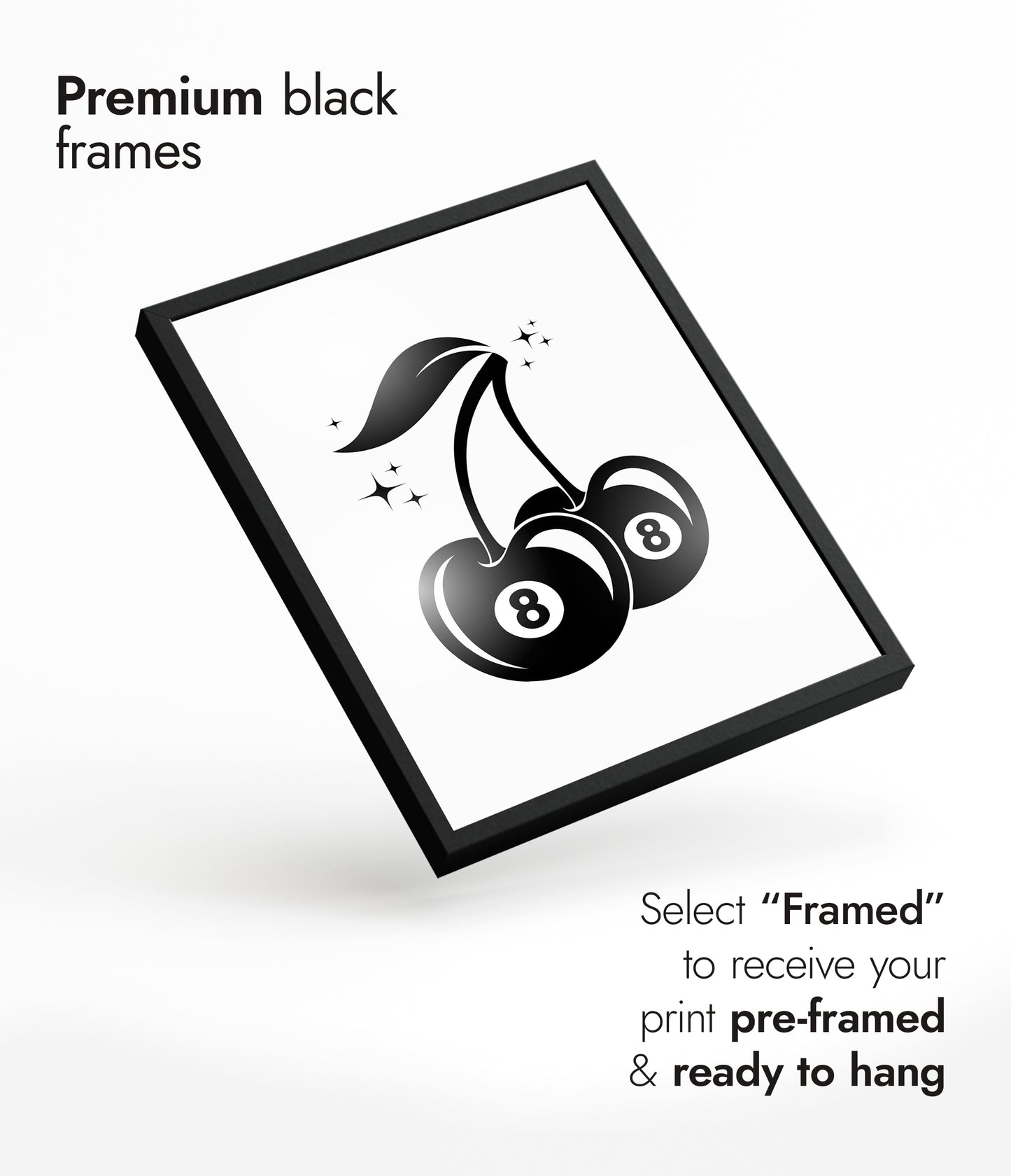 The "8 Ball Cherry" poster combines graphic minimalism with a playful design. Featuring two cherries with 8-ball imagery, this black and white artwork subtly nods to graffiti culture. The sharp, clean lines and vibrant theme make it a striking piece for contemporary spaces, blending fruit symbolism with a billiards reference, perfect for modern decor enthusiasts.