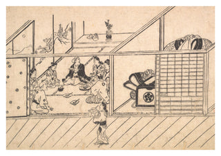 "A Banquet in a Joroya" poster by Hishikawa Moronobu captures a traditional Japanese feast scene inside a joroya. The intricate woodblock illustration features detailed line art, highlighting a sumptuous meal setting within a castle. Ideal for lovers of historical Japanese art, this piece exudes cultural richness, making it a captivating addition to any collection.