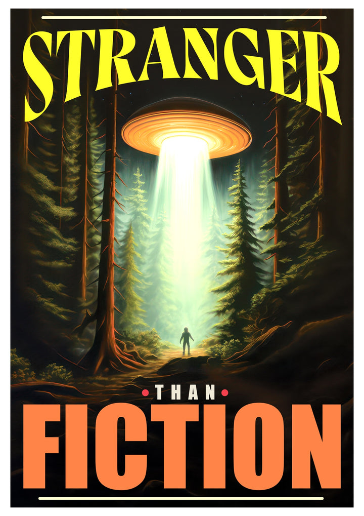 "Stranger Than Fiction" poster depicts a mysterious UFO abduction deep within a dense forest. Illuminated by an eerie beam of light, a lone figure stands surrounded by towering trees. The retro illustration style and bold typography evoke a sci-fi and fantasy atmosphere, perfect for those fascinated by the unknown. Ideal for space and UFO enthusiasts.