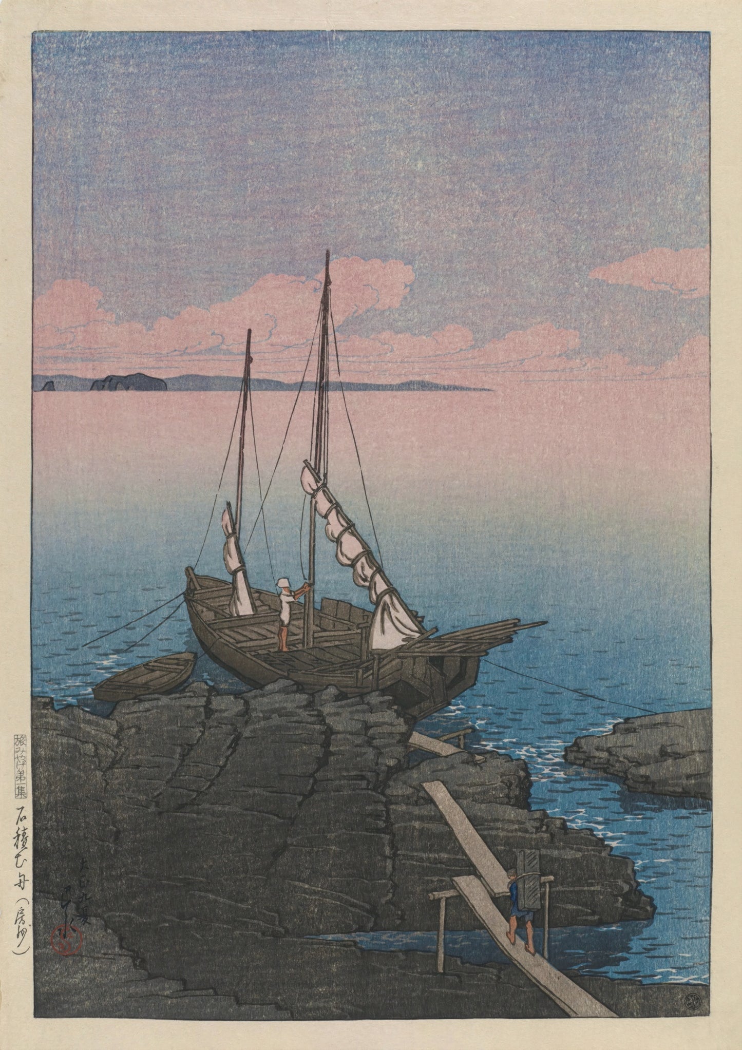 This poster titled "A Boat Laden with Masonry (Boshu)" by Kawase Hasui features a serene, woodblock illustration of a sailboat docked on a rocky shore. The tranquil sea, shown in soft gradations of blue, meets a pastel horizon, creating a calm and peaceful scene evocative of traditional Japanese Ukiyo-e art. Ideal for lovers of maritime and traditional Japanese themes.