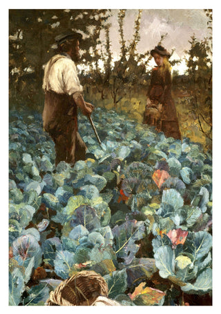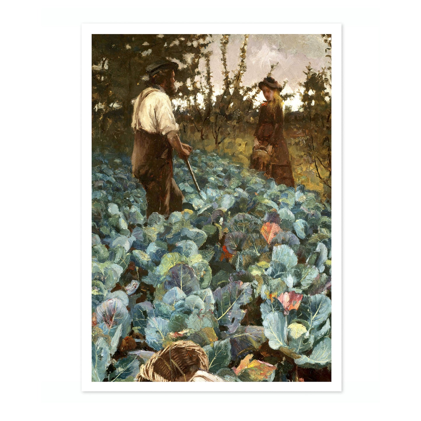 "A Cabbage Garden" poster by Arthur Melville beautifully captures a tranquil rural scene with two farmers tending to a lush field of cabbages. The naturalistic painting emphasizes the earthy tones and detailed foliage, evoking a sense of pastoral serenity. Ideal for adding a touch of countryside charm to any space, this artwork reflects the harmony and simplicity of farm life.