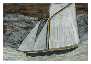 This "Gaff-Rigged Sailing Boat" artwork by Alfred Wallis captures a maritime scene with a primitive, naive style. The poster features a sailboat with distinctive gaff rigging, set against a turbulent, moody sea. Painted with muted tones, this landscape emphasizes the raw and simplistic beauty of maritime life, making it a striking nautical piece for any space.
