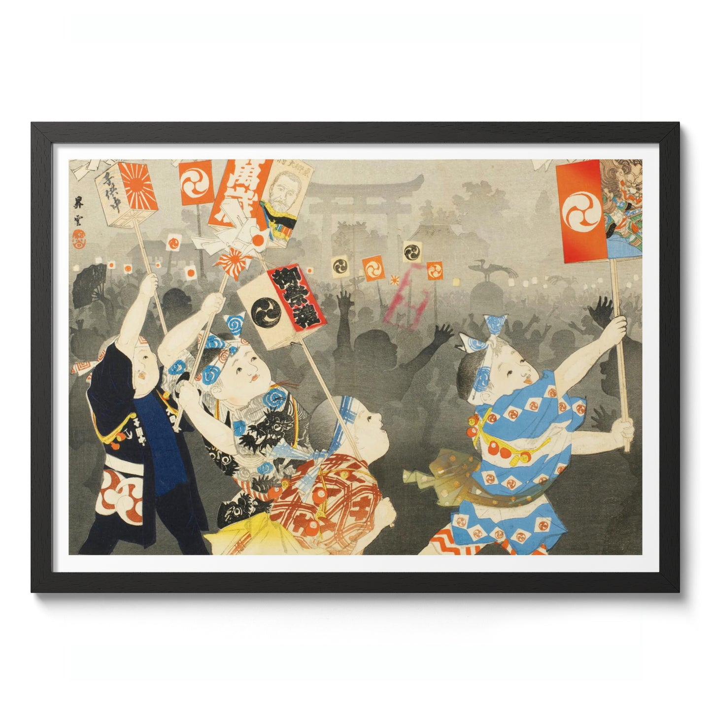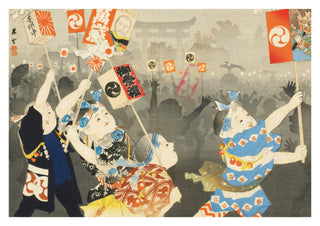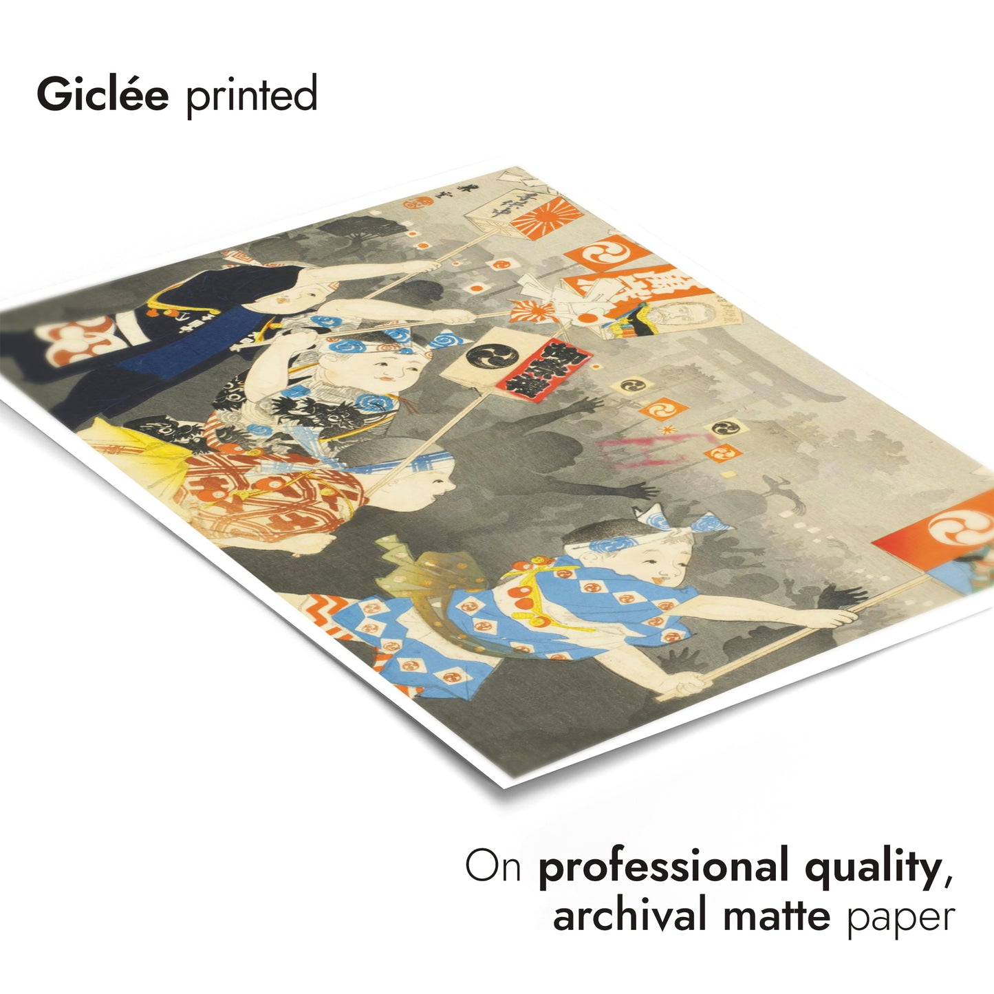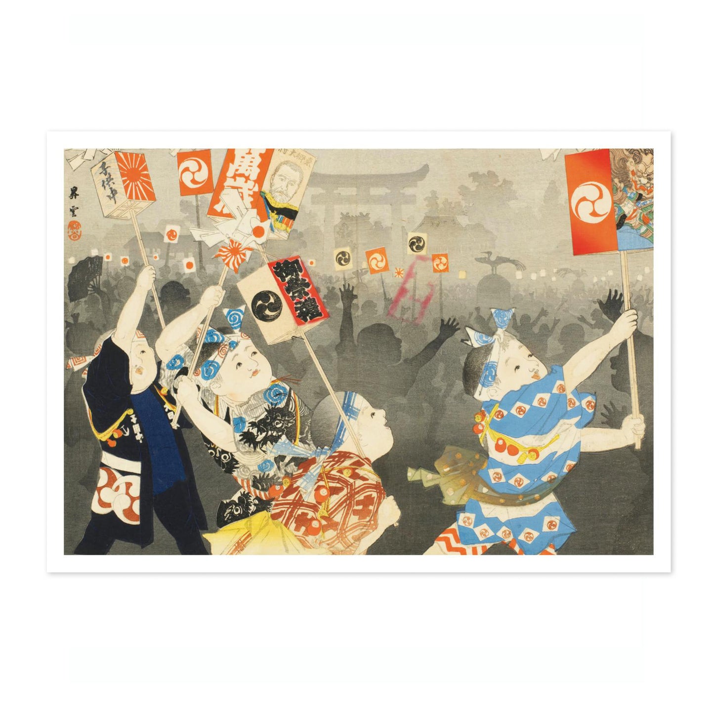 This lively Japanese woodblock print, "A Picture Album of Children Playing III" by Yamamoto Shoun, captures a vibrant festival scene. Children joyfully parade with flags and lanterns, dressed in traditional attire. The artwork's dynamic composition and vibrant hues of red and blue contrast against a muted grey background, embodying a festive spirit. Ideal as a cultural and traditional Japanese poster.