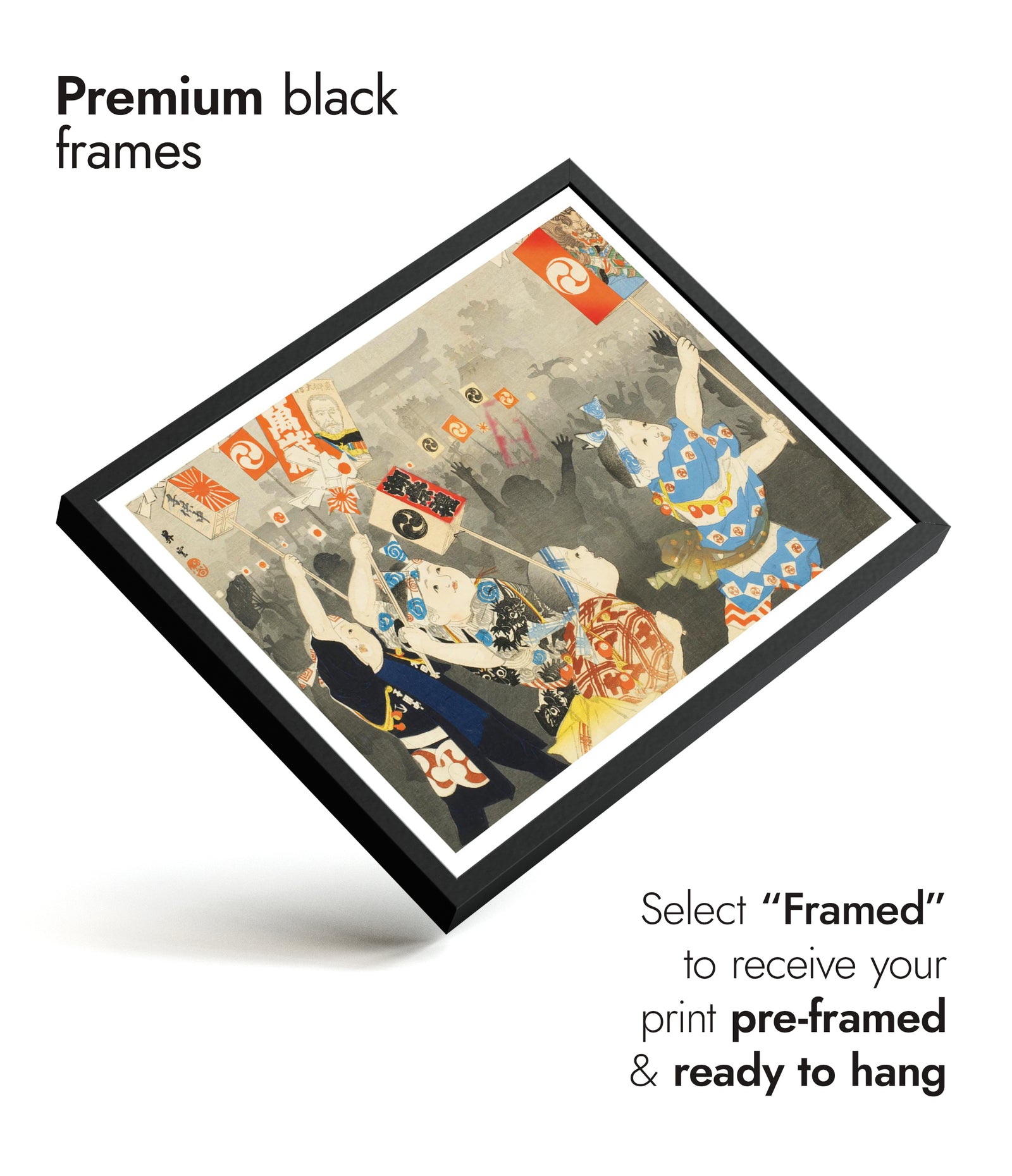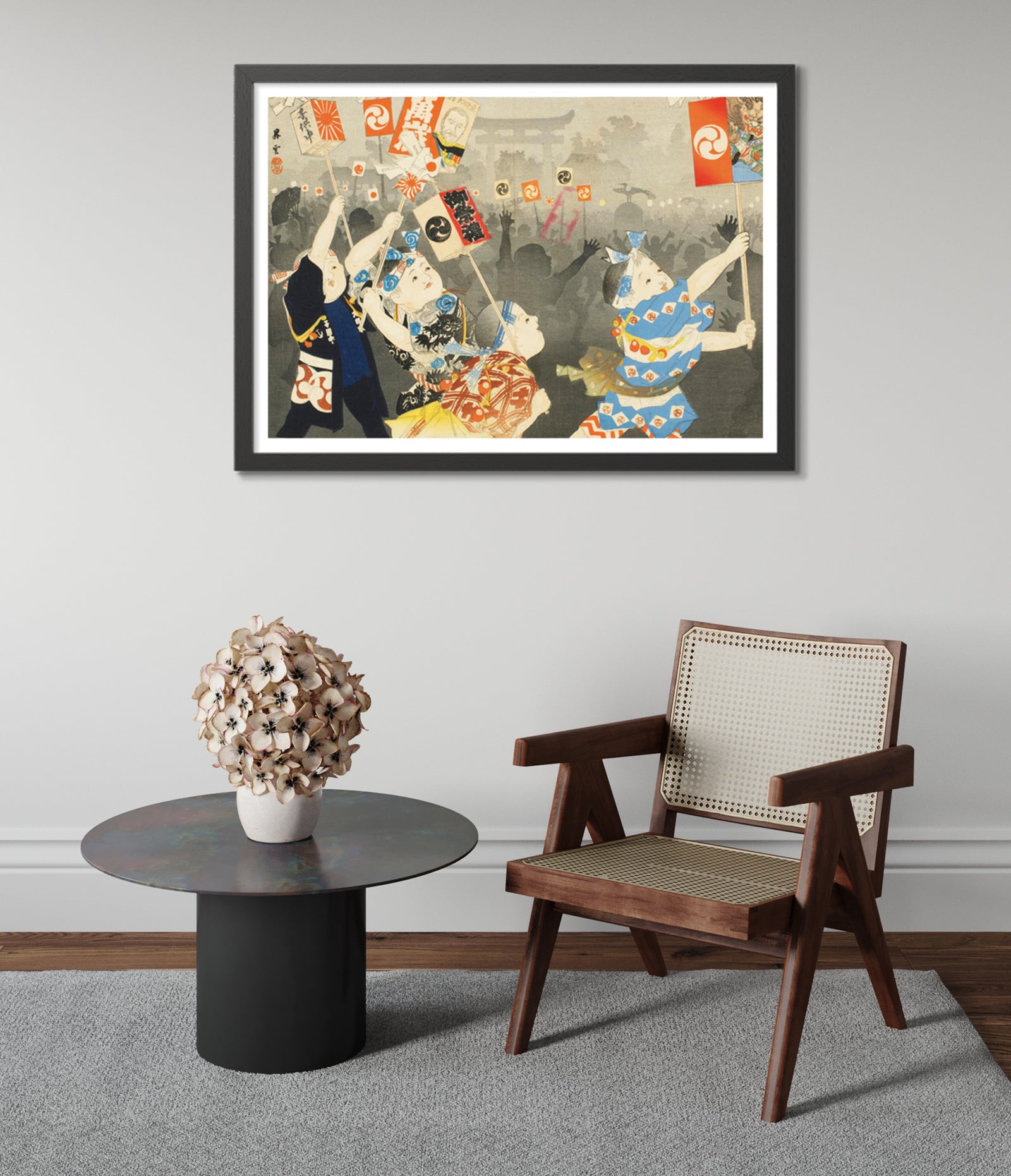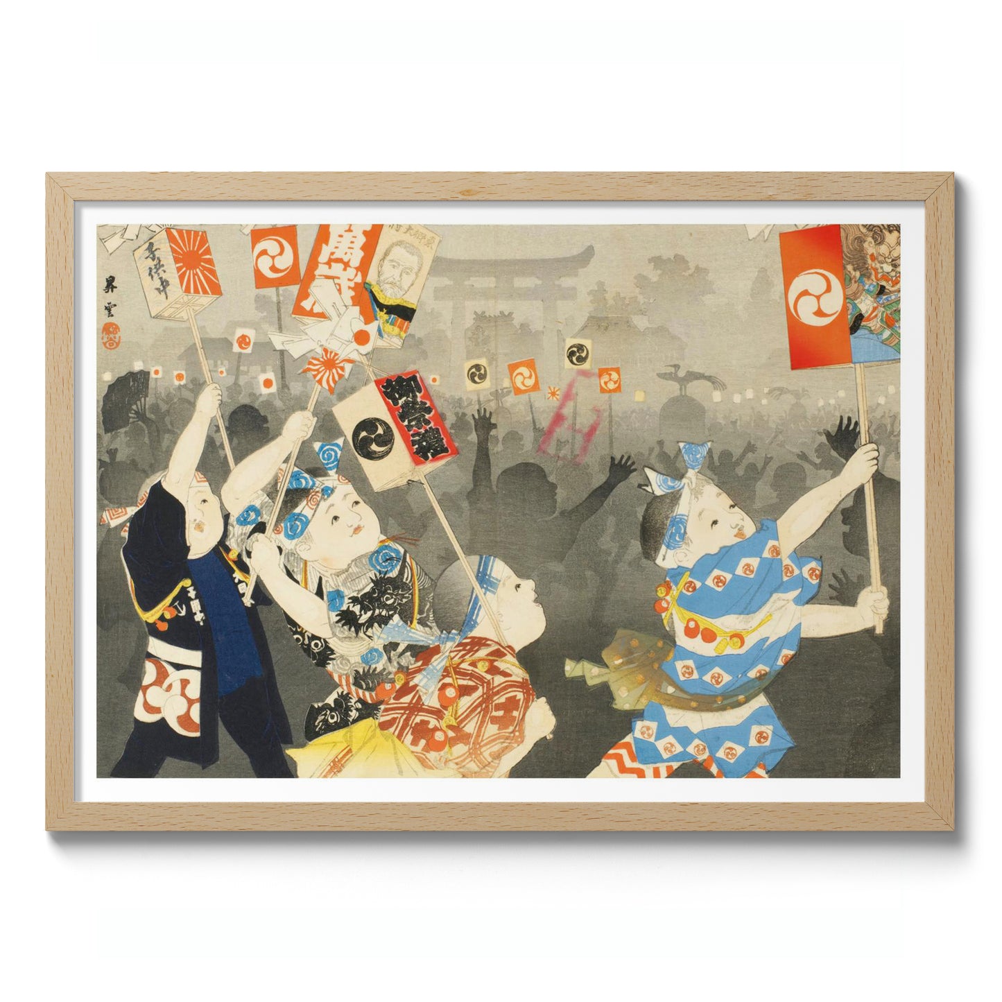This lively Japanese woodblock print, "A Picture Album of Children Playing III" by Yamamoto Shoun, captures a vibrant festival scene. Children joyfully parade with flags and lanterns, dressed in traditional attire. The artwork's dynamic composition and vibrant hues of red and blue contrast against a muted grey background, embodying a festive spirit. Ideal as a cultural and traditional Japanese poster.