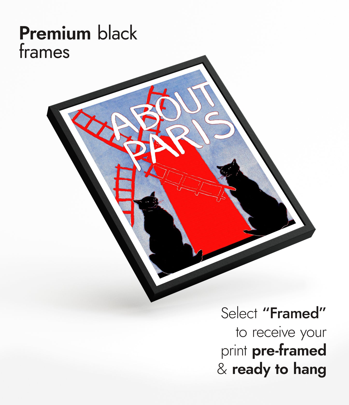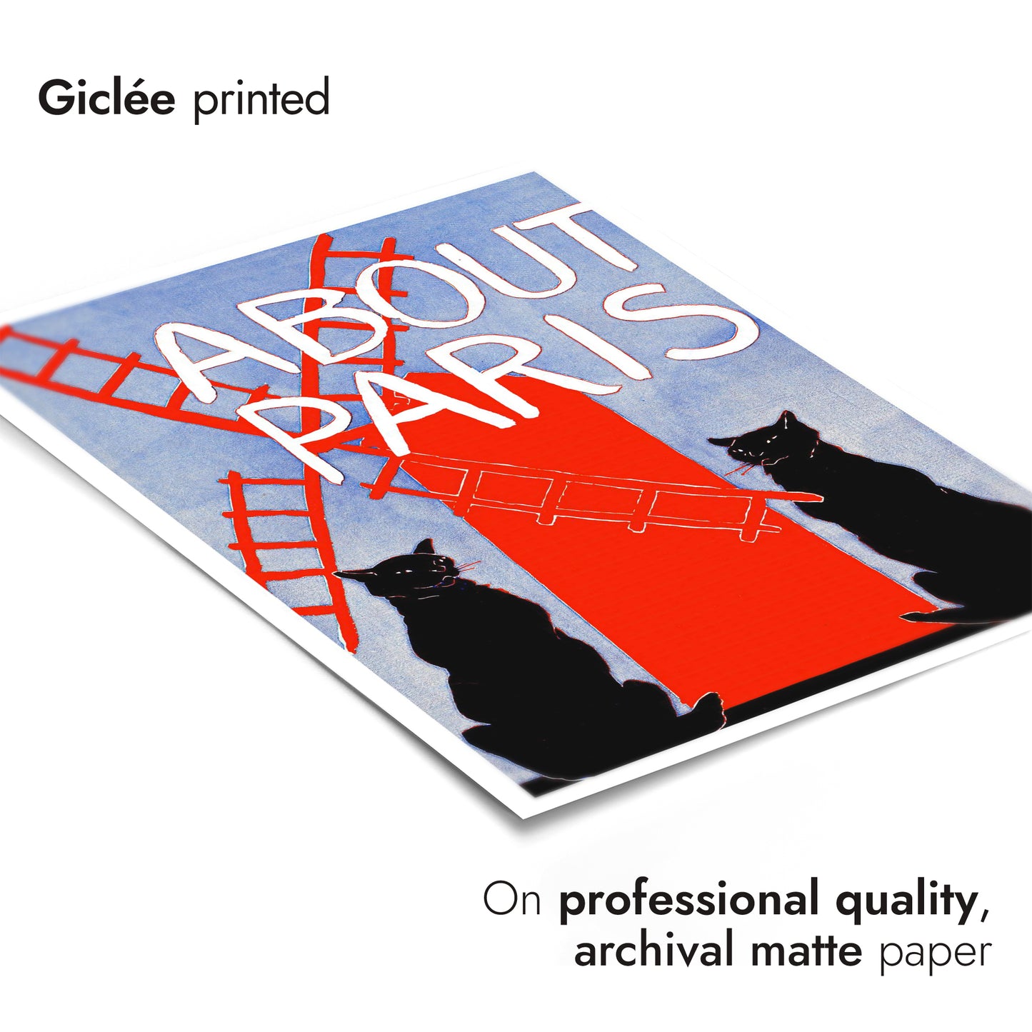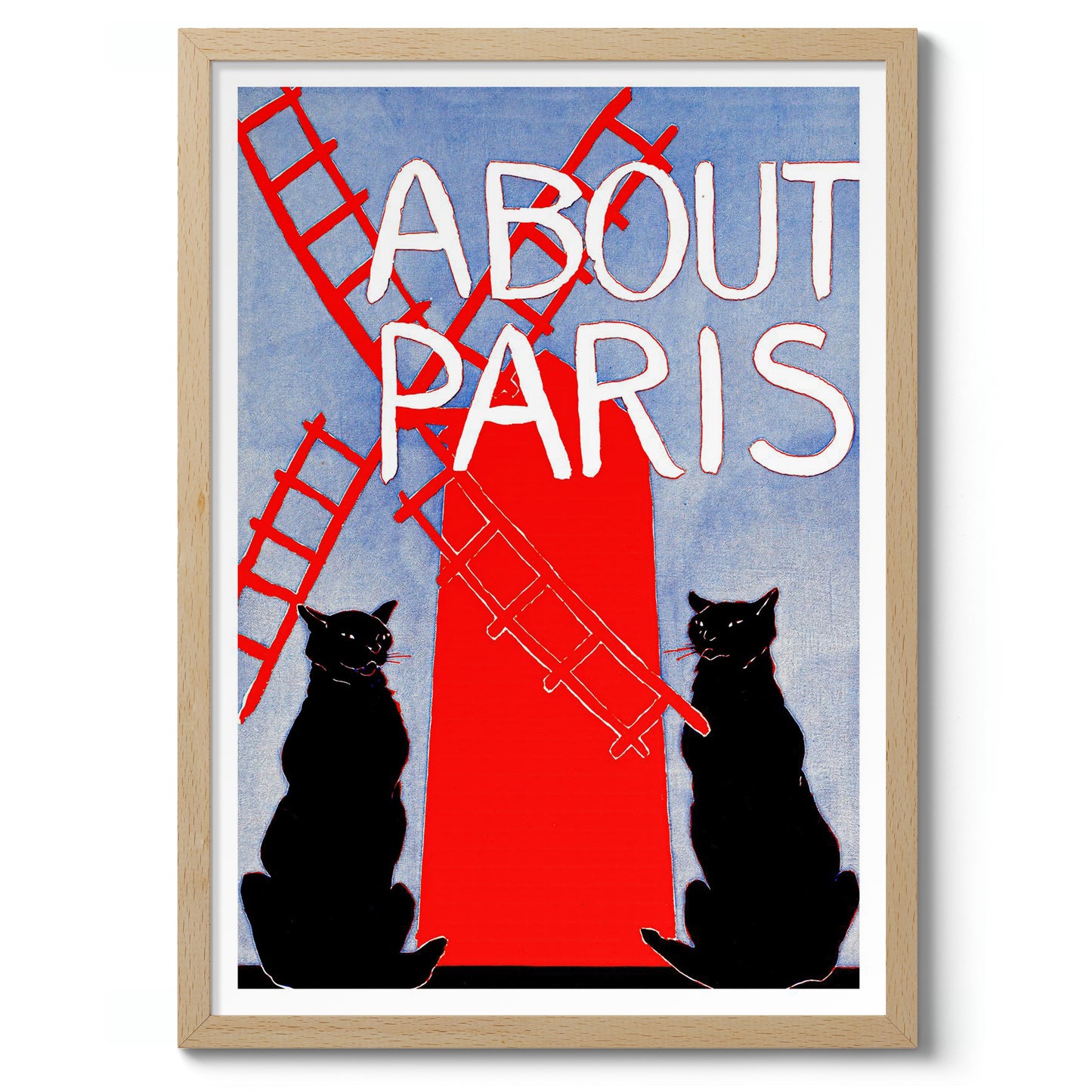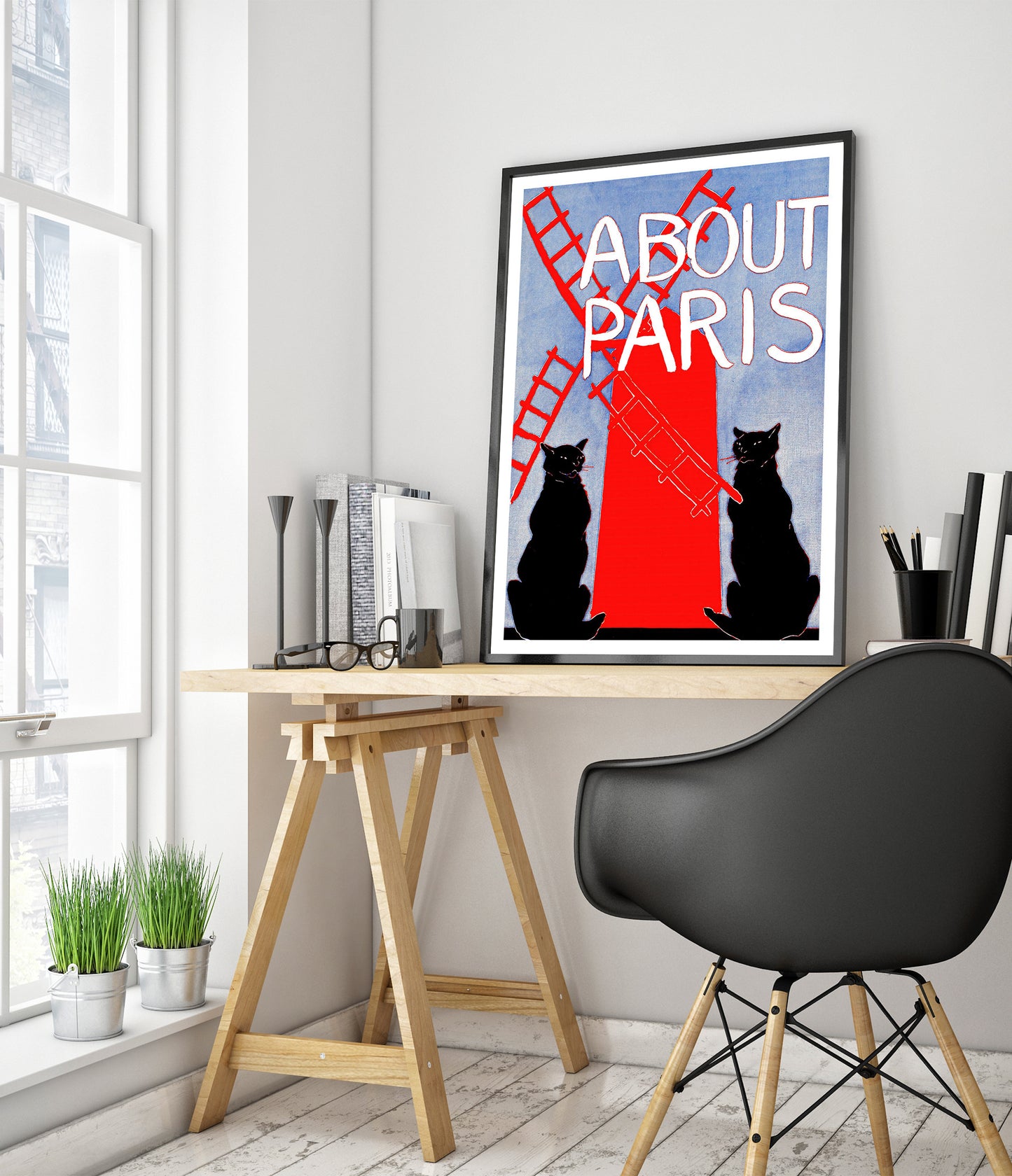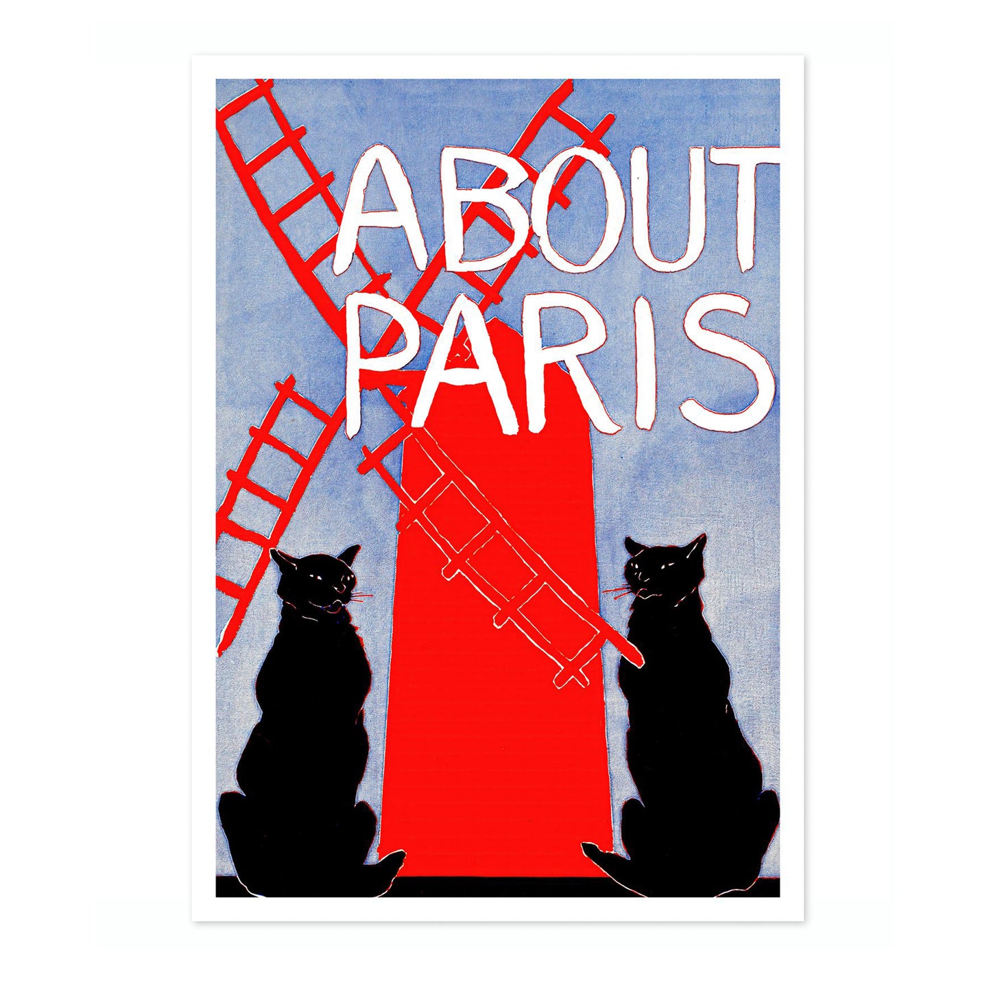 This vintage poster, titled "About Paris," features two black cats sitting in front of a striking red windmill, set against a blue backdrop. The bold, vintage illustration evokes the lively spirit of Parisian cabaret culture. Perfect for cat lovers and travel enthusiasts seeking nostalgic European flair in art prints. Ideal for adding character to any space.