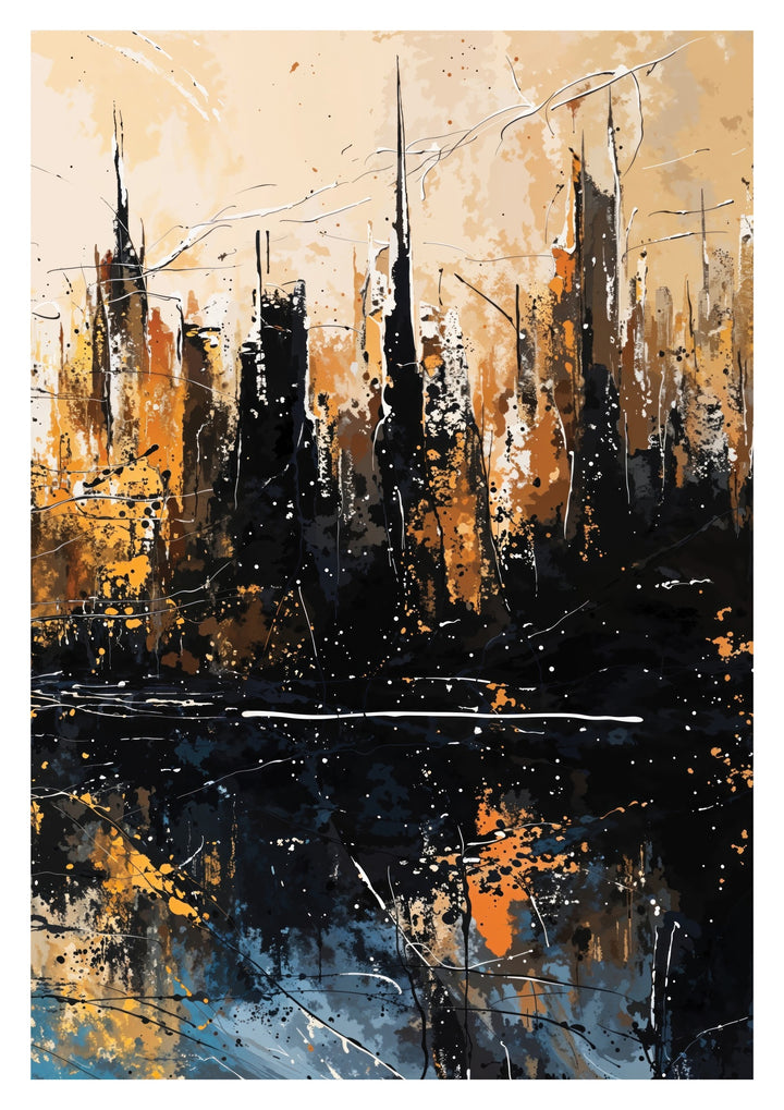 Abstract Cityscape III Poster showcases a dynamic portrayal of an urban skyline, blending sharp black silhouettes with splashes of orange and blue. This abstract art piece captures the essence of modern city life through expressive brushstrokes and vivid contrasts. Ideal for adding a contemporary touch to any space, it's perfect for abstract landscape and cityscape enthusiasts.