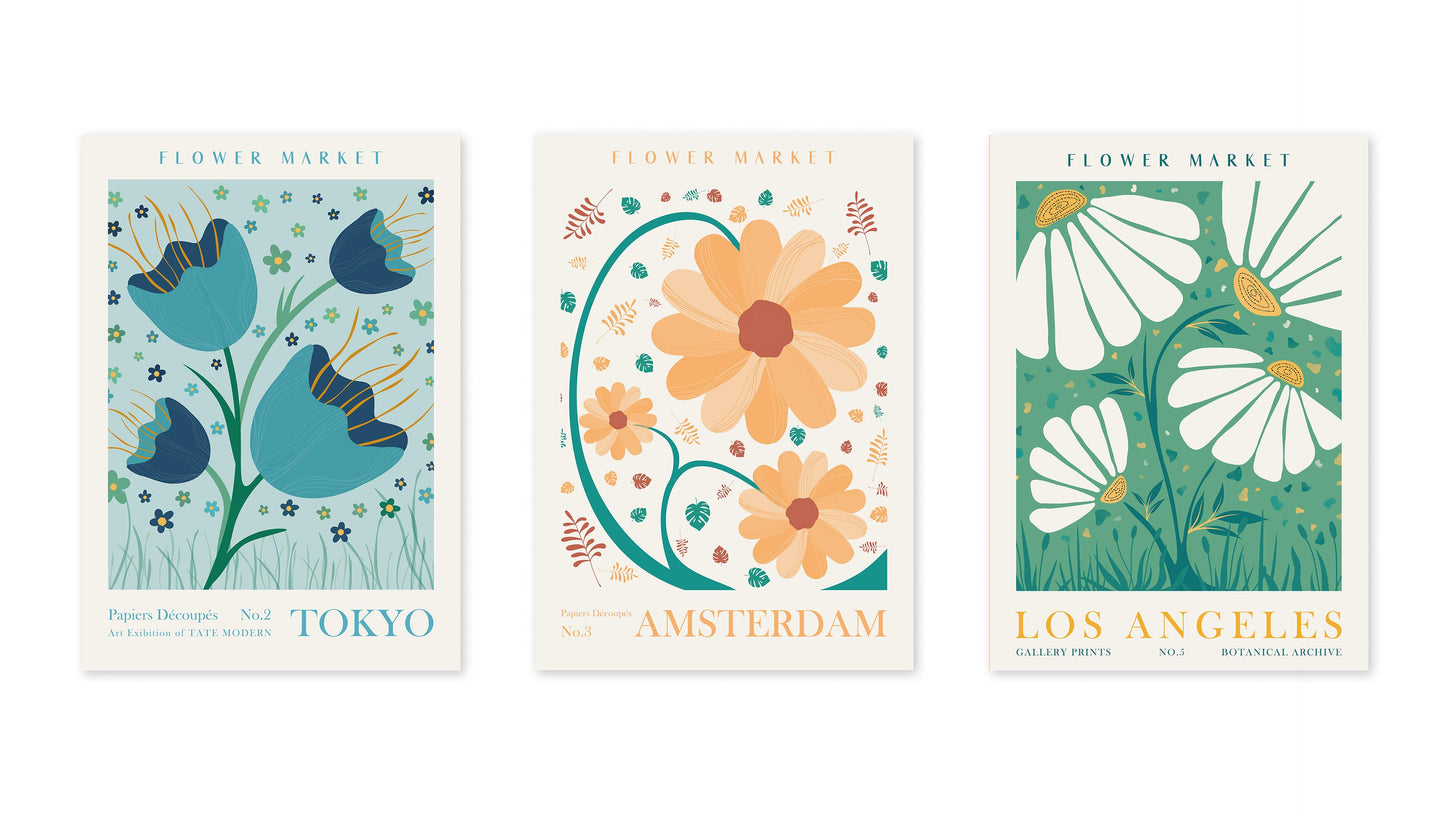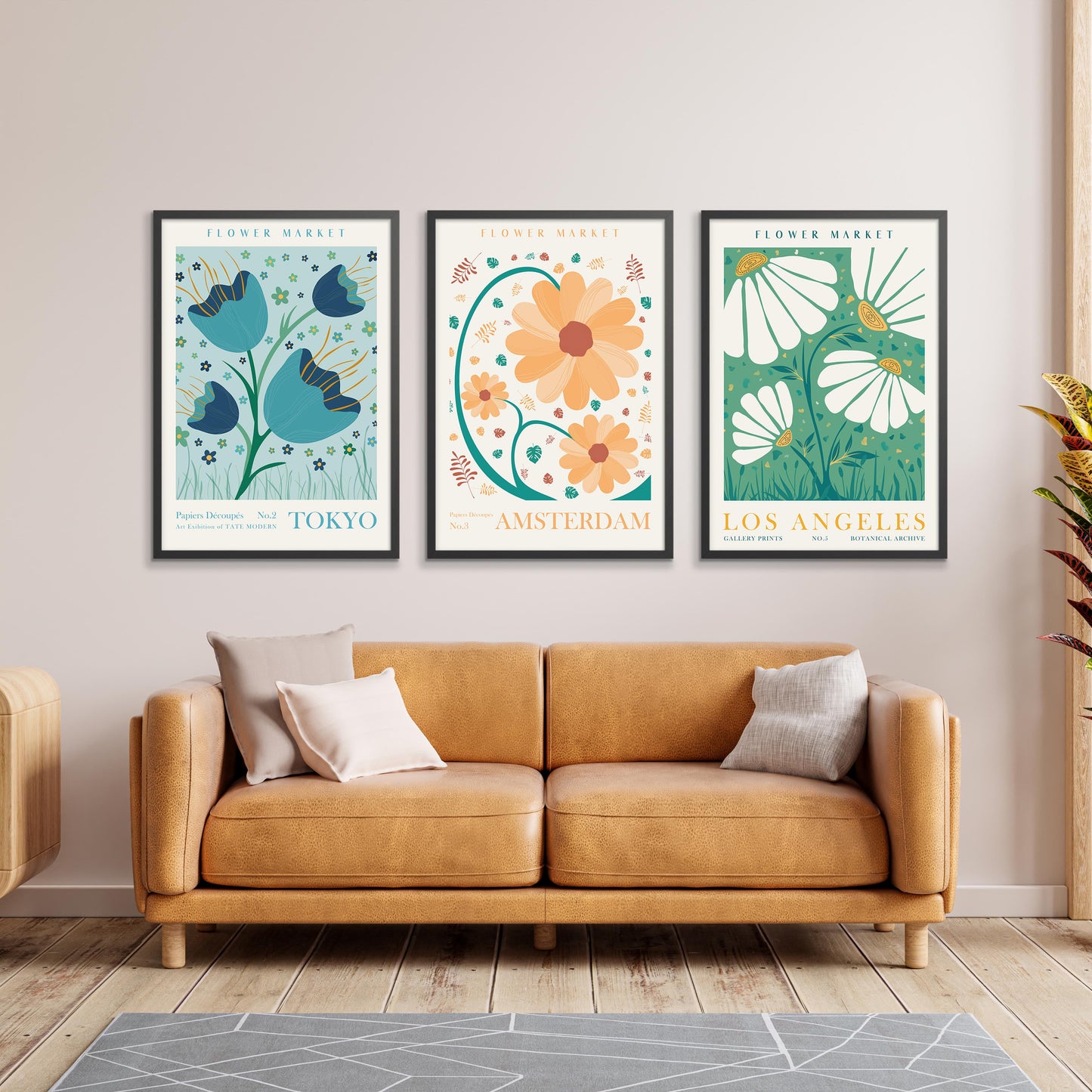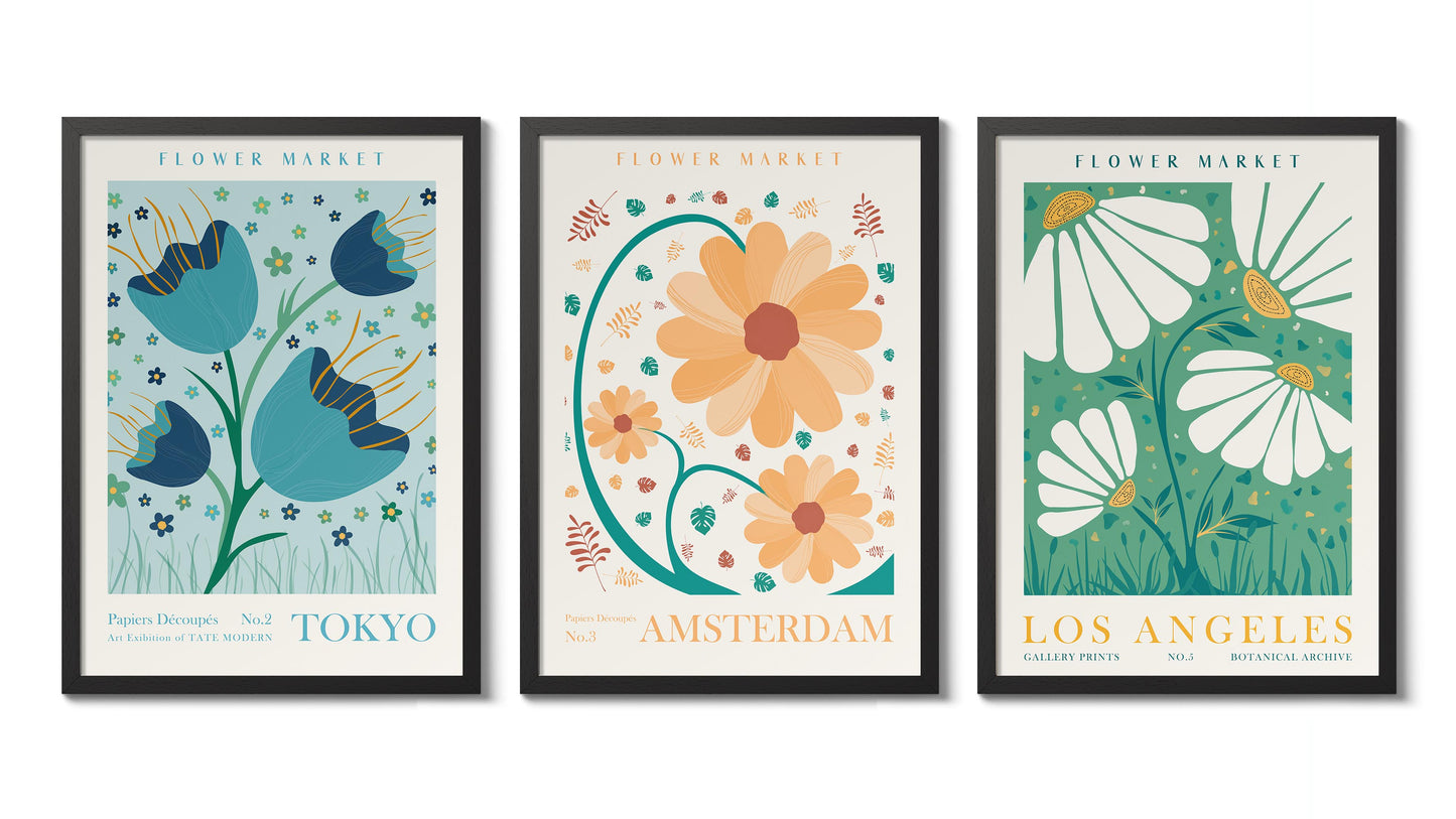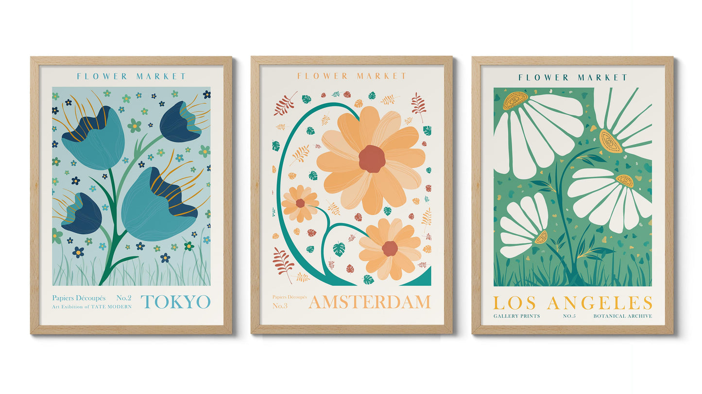This vibrant and abstract "Flower Market" poster series visually celebrates the floral essence of Tokyo, Amsterdam, and Los Angeles. The artwork features graphic illustrations with bold floral designs in soothing shades of blue and orange. Ideal for nature enthusiasts and art lovers, these pieces bring a modern botanical touch to any space, encapsulating each city's unique floral market charm.