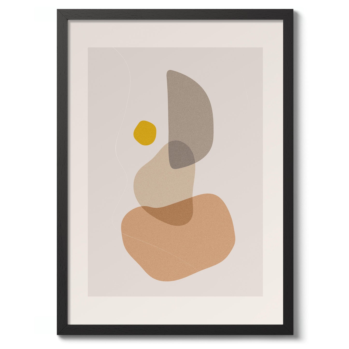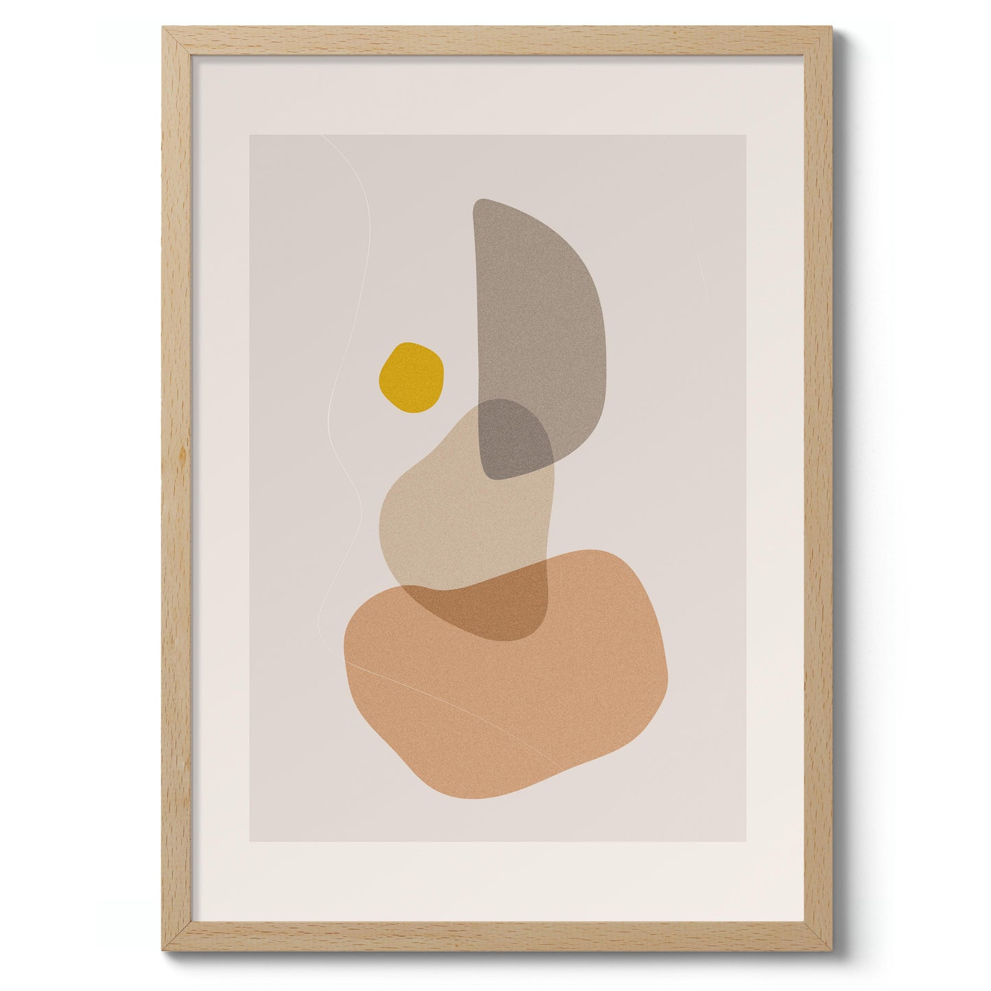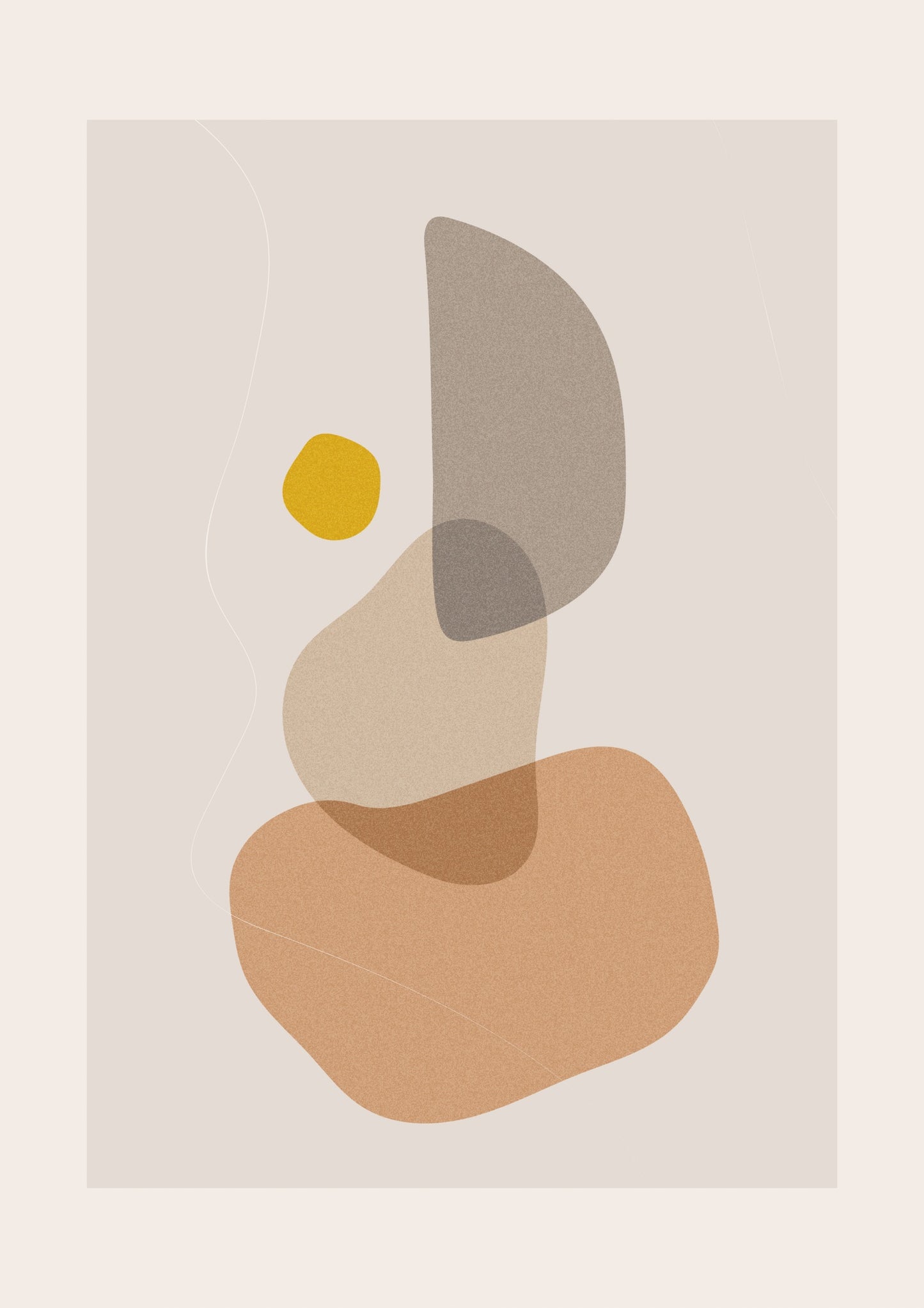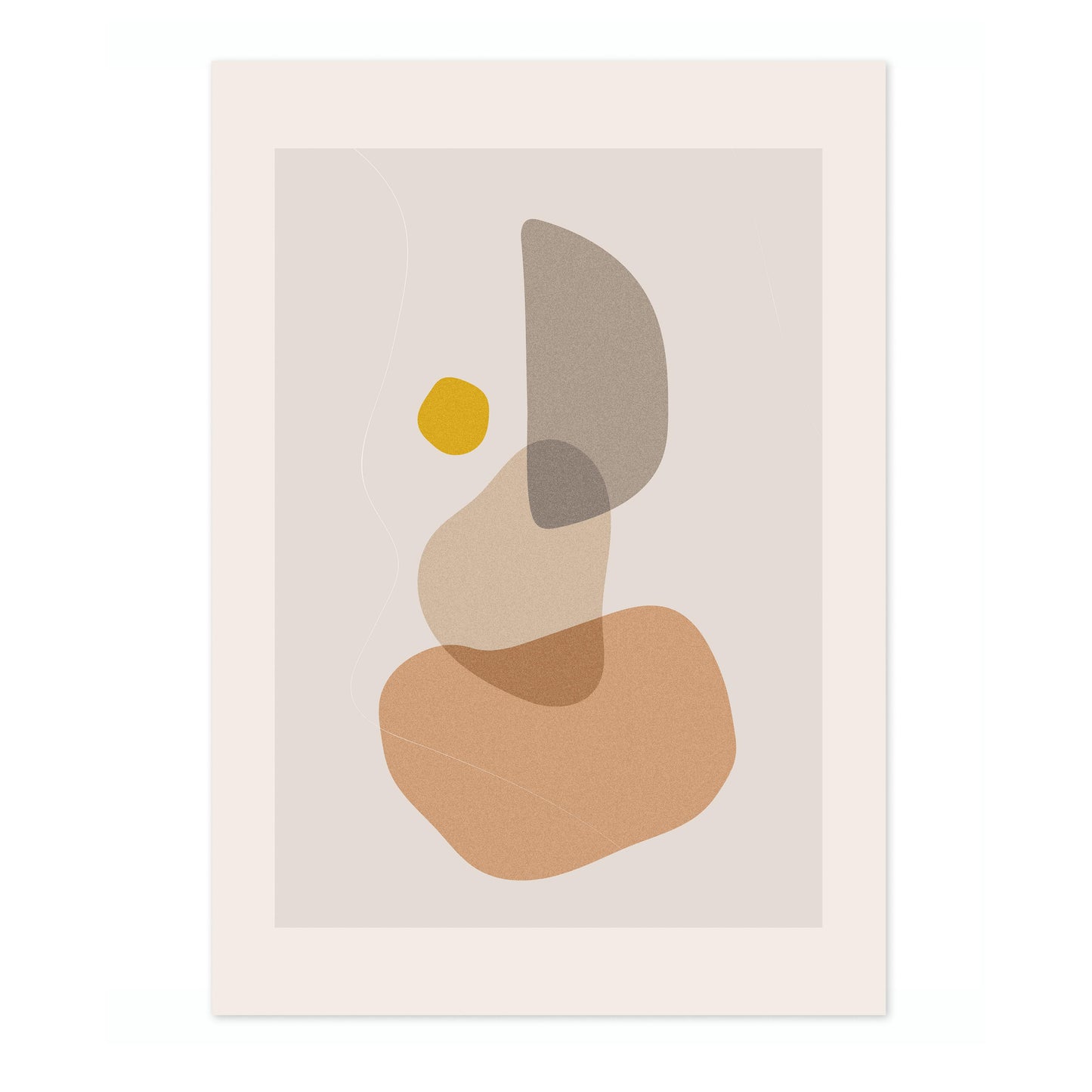 The "Abstract Shapes" poster features a minimalist arrangement of organic, overlapping forms in muted earth tones with a pop of mustard yellow. This graphic and abstract artwork, part of the Boho theme, offers a serene and modern aesthetic that complements contemporary interiors. The visually balanced composition is ideal for adding a touch of sophistication to your space.