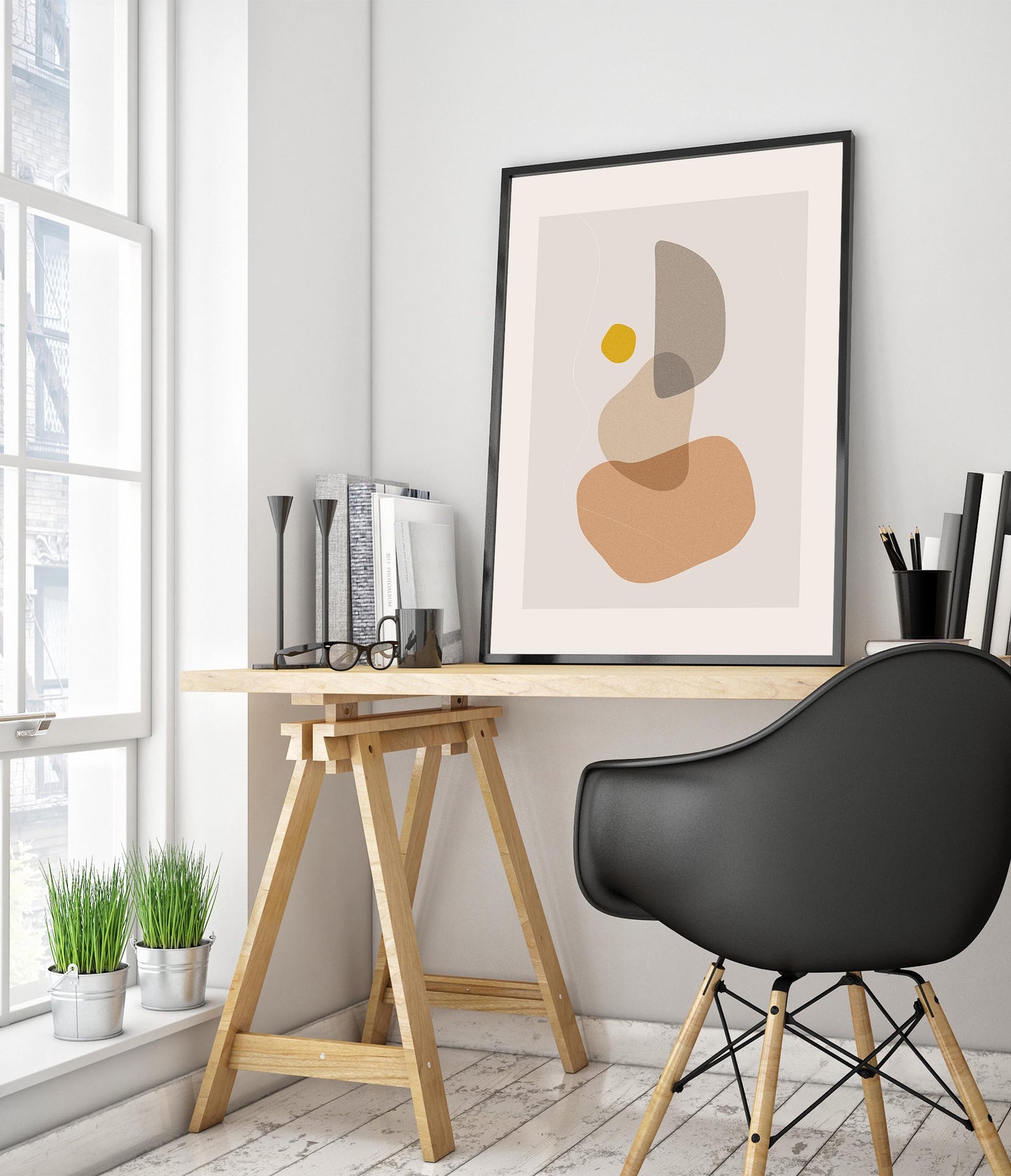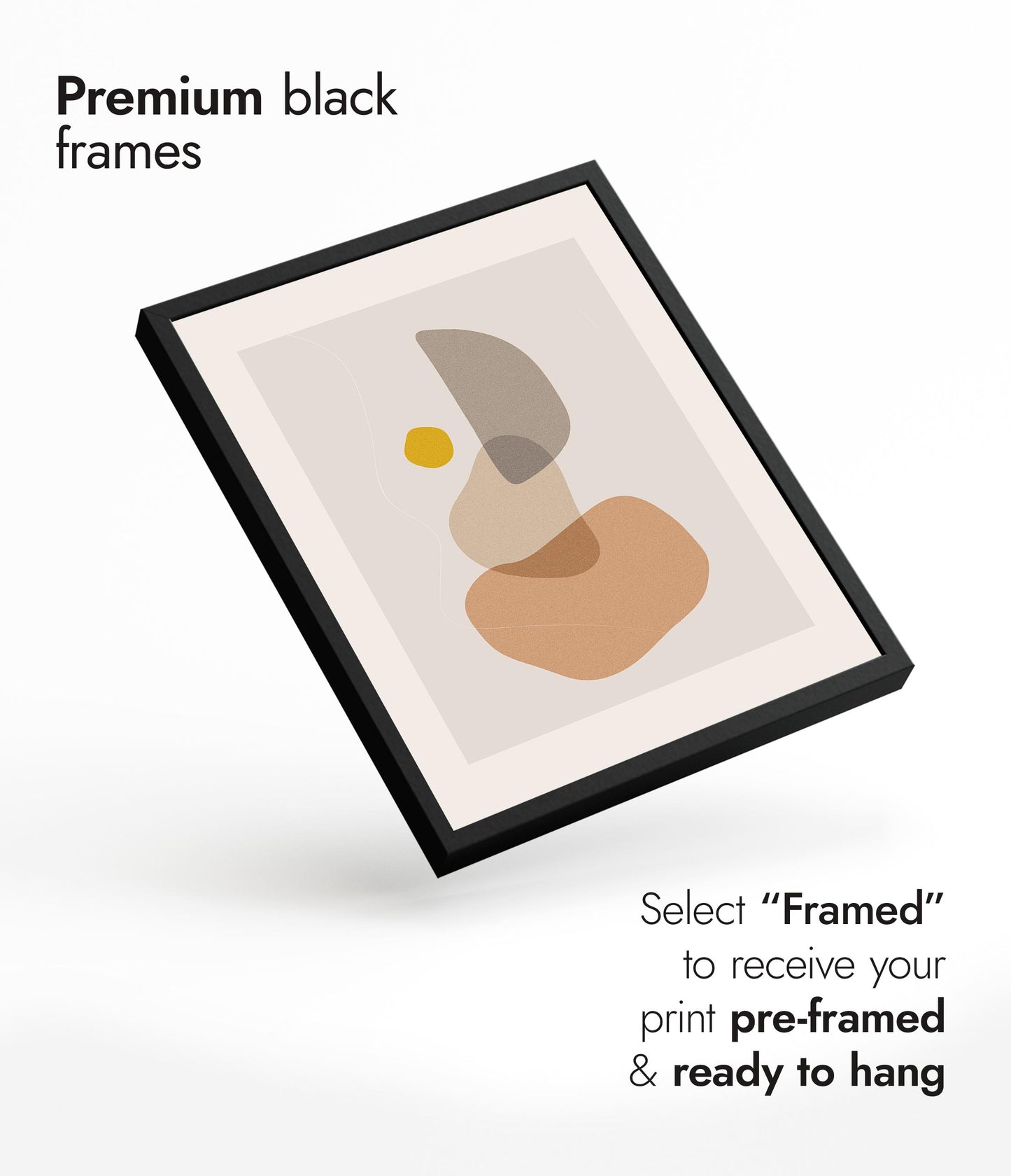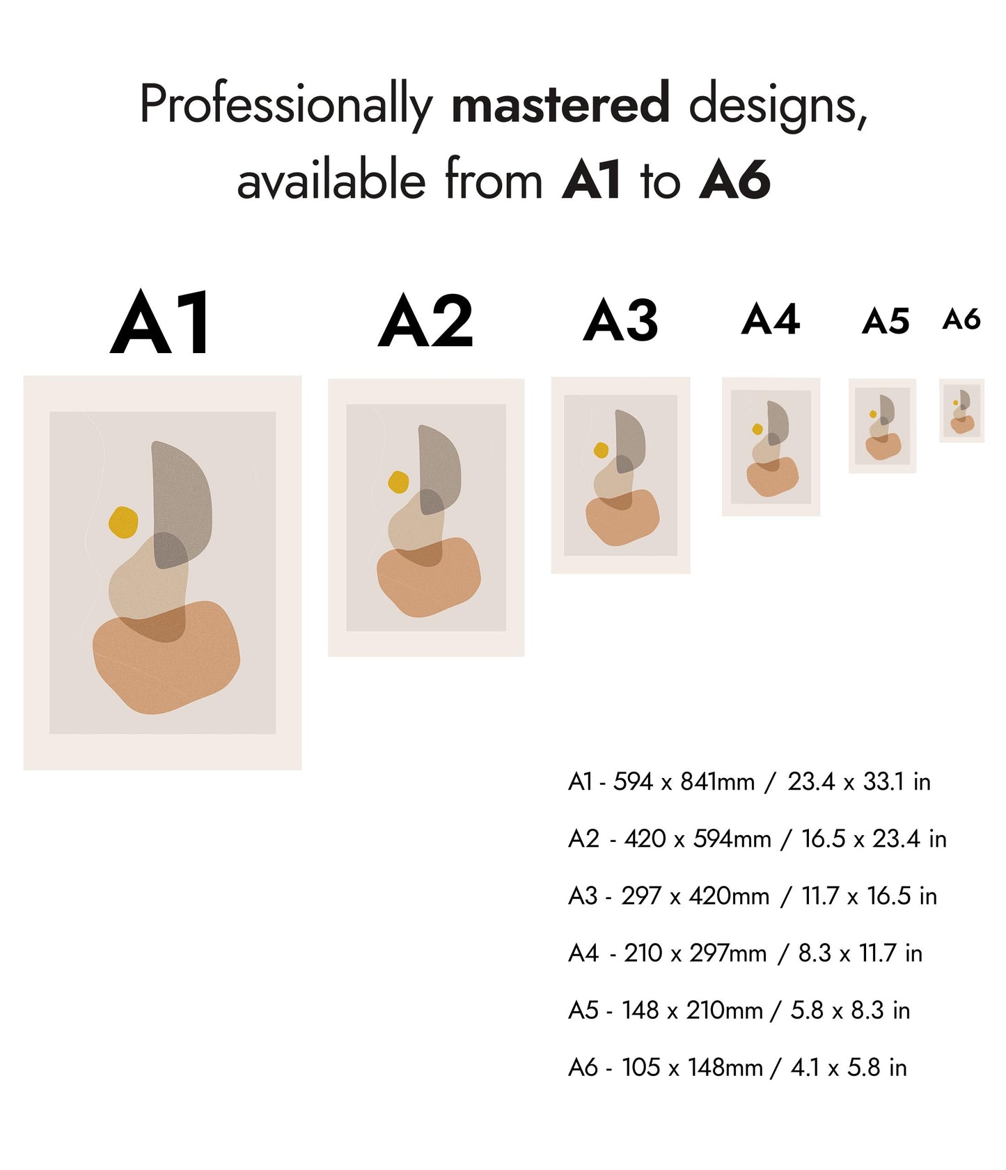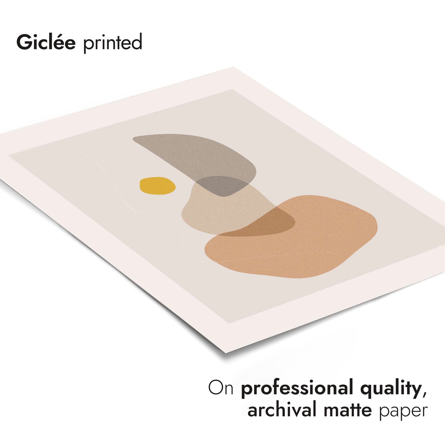 The "Abstract Shapes" poster features a minimalist arrangement of organic, overlapping forms in muted earth tones with a pop of mustard yellow. This graphic and abstract artwork, part of the Boho theme, offers a serene and modern aesthetic that complements contemporary interiors. The visually balanced composition is ideal for adding a touch of sophistication to your space.