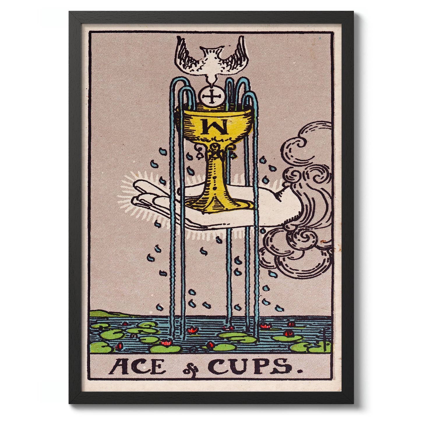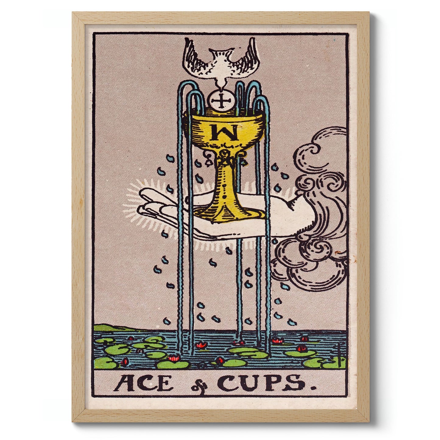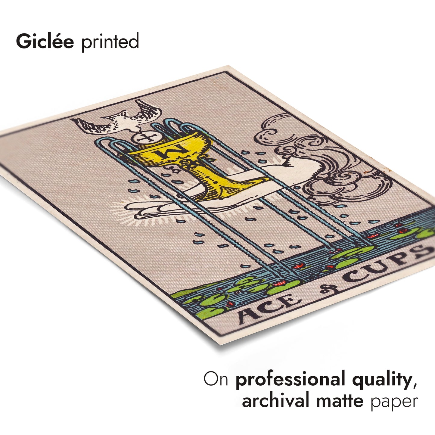 The Ace of Cups poster features a classic tarot illustration showcasing a hand emerging from a cloud, holding a golden cup symbolizing divine love and spirituality. Above the cup, a dove descends, signifying peace and purity. Surrounded by serene water lilies, this vintage-themed art print in beige and yellow captures spiritual symbolism and mystical elements, perfect for spiritual enthusiasts.