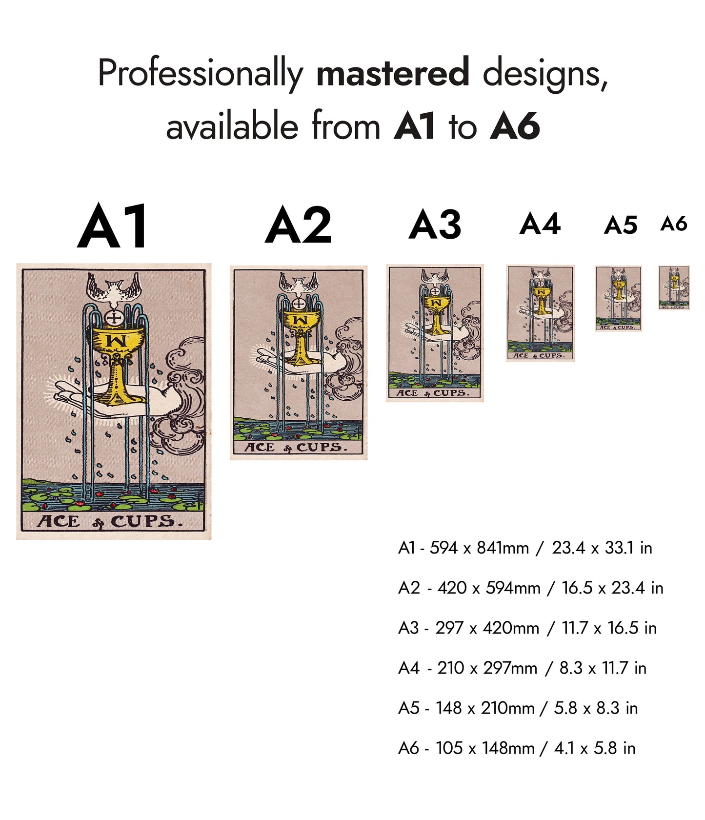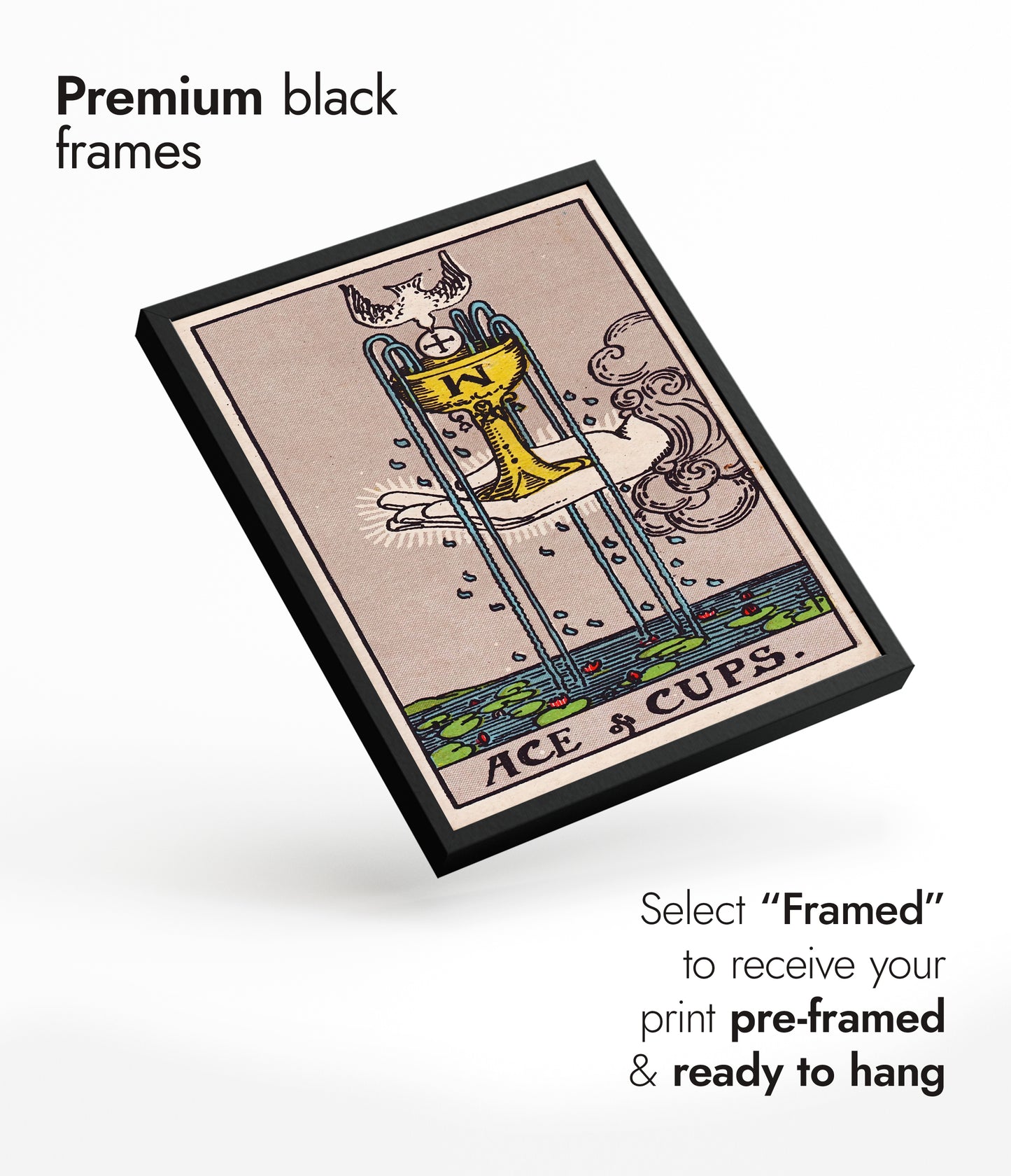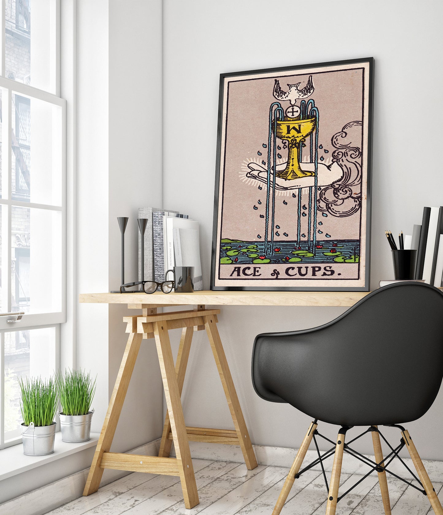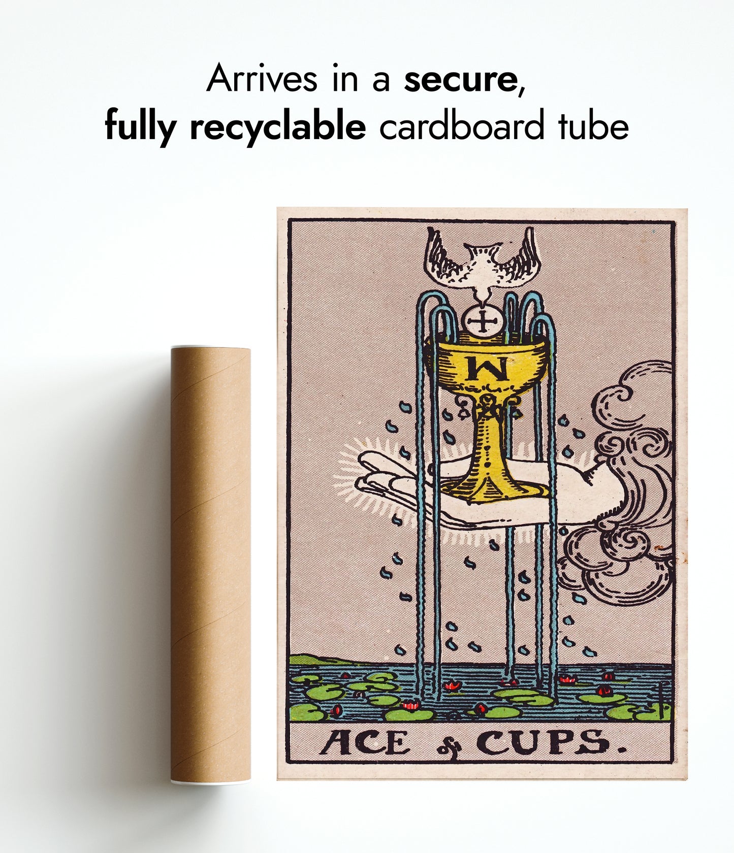 The Ace of Cups poster features a classic tarot illustration showcasing a hand emerging from a cloud, holding a golden cup symbolizing divine love and spirituality. Above the cup, a dove descends, signifying peace and purity. Surrounded by serene water lilies, this vintage-themed art print in beige and yellow captures spiritual symbolism and mystical elements, perfect for spiritual enthusiasts.