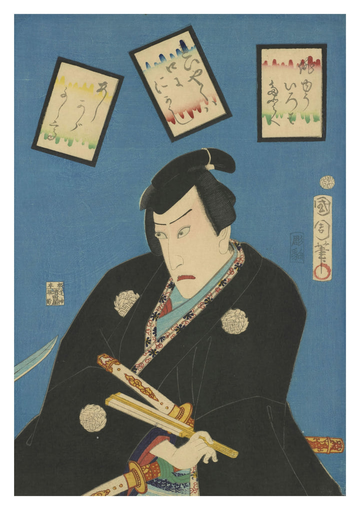 This striking poster features a traditional Japanese woodblock print by Toyohara Kunichika. Showcasing an intense samurai actor gripping his sword, the vibrant blue background is adorned with script-filled banners. Intricate details in the warrior's attire and expressive facial features bring theatrical drama to any space. Ideal for those interested in Japanese art, theatre, and historical warriors.