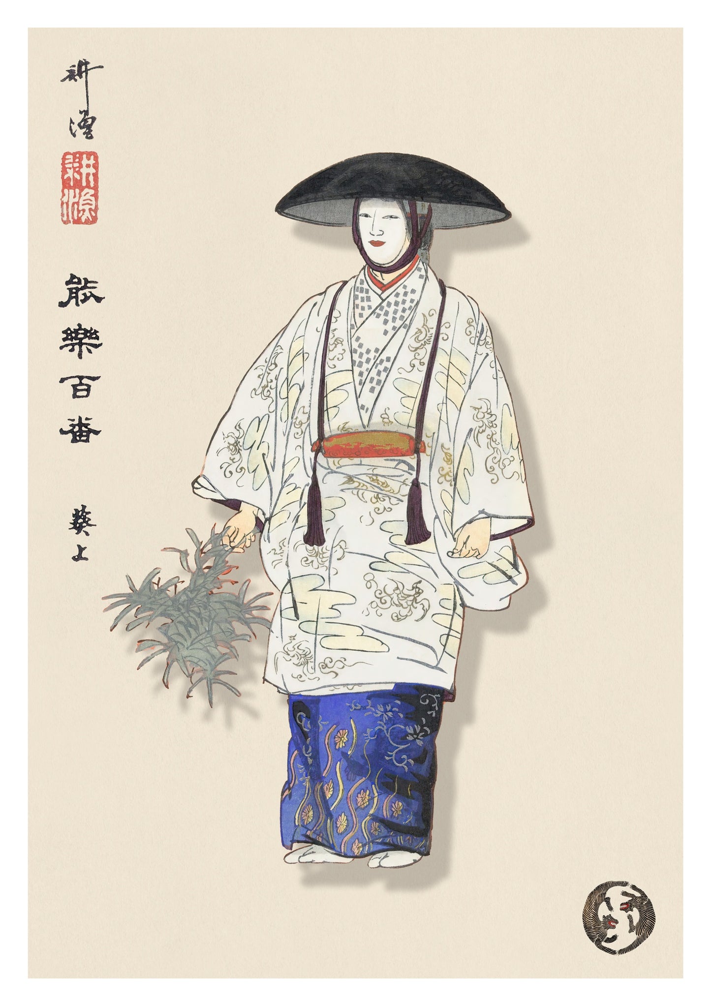 This poster, "Actor in the Noh Play Hanagatami" by Kogyo Tsukioka, features a traditional woodblock portrait of a Japanese Noh actor. The figure is dressed in ornate, historical attire with a striking floral accessory, capturing the essence of classical Japanese theater. Ideal for lovers of traditional Japanese art and woodblock prints, this piece embodies the elegance of Ukiyo-E style.