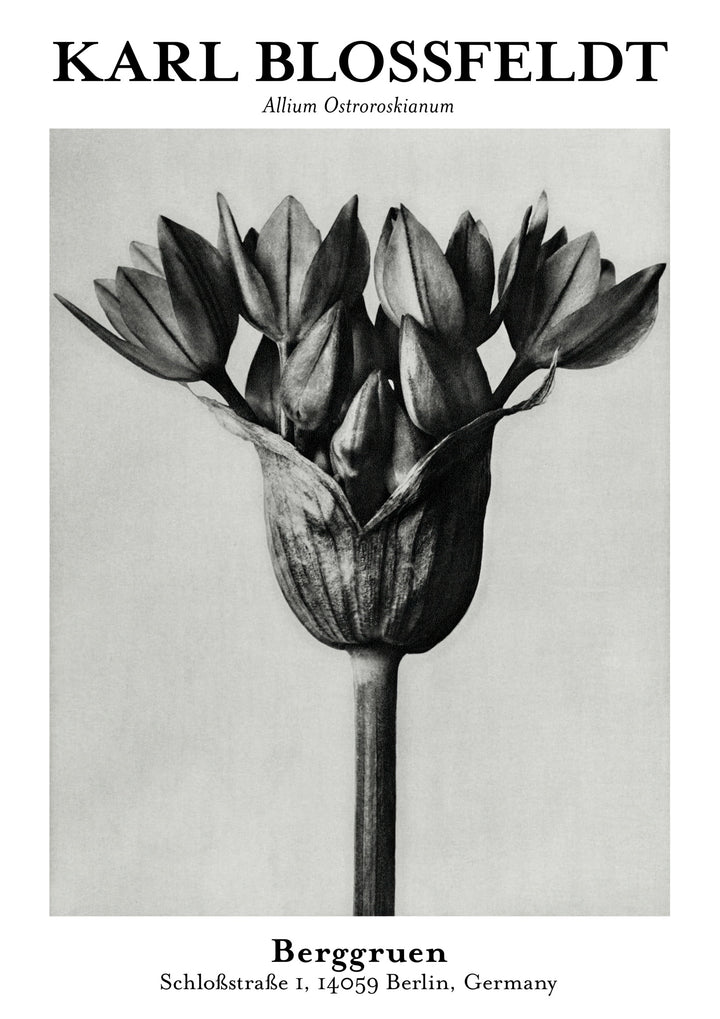 This striking poster features Karl Blossfeldt's "Allium Ostroroskianum," capturing the intricate details of this botanical marvel. The black-and-white floral photograph emphasizes texture and form, embodying a minimalist and vintage aesthetic. Ideal for nature enthusiasts, it adds an elegant touch to any space. The well-defined structure of the plant conveys Blossfeldt's mastery in still life photography.