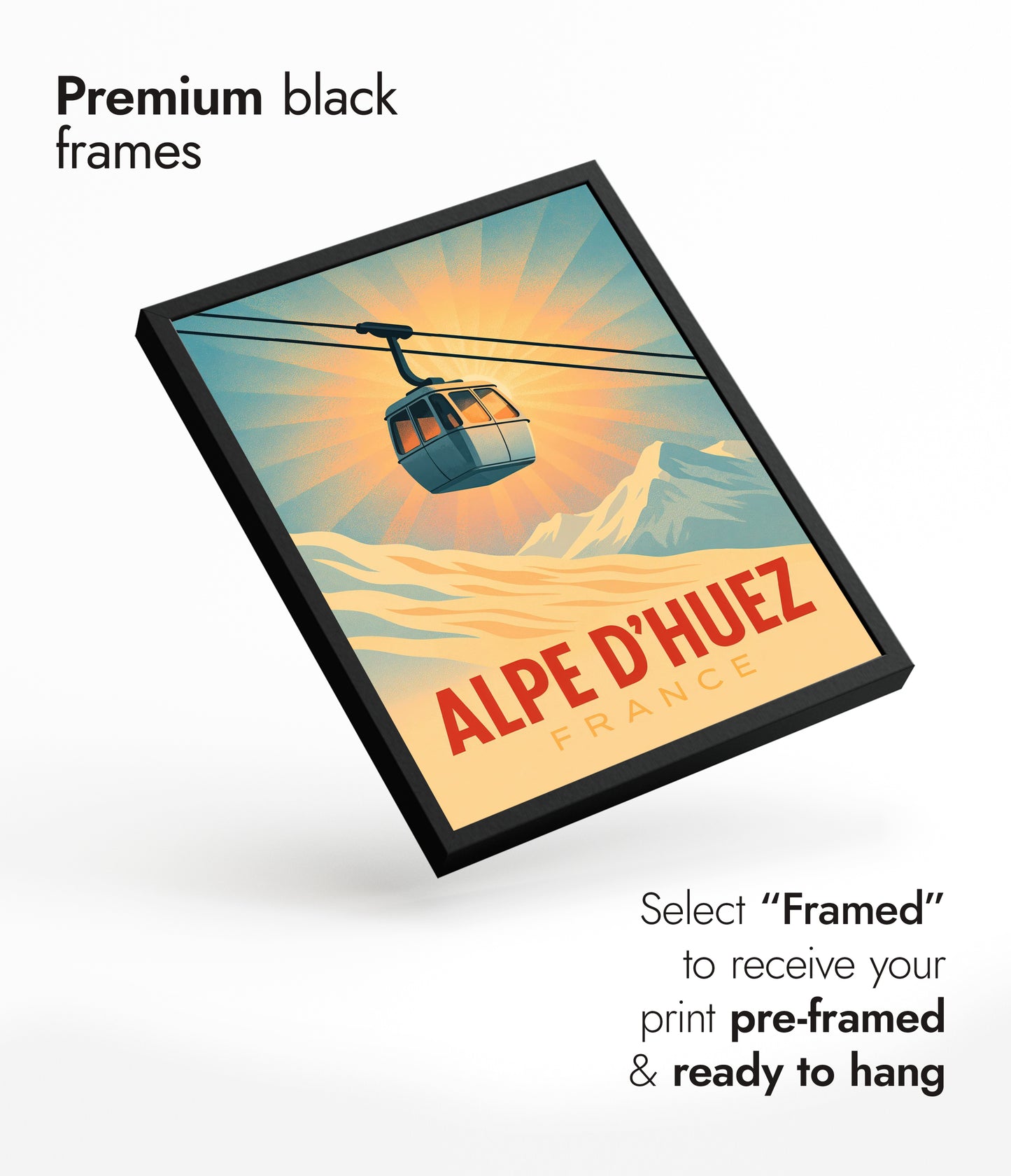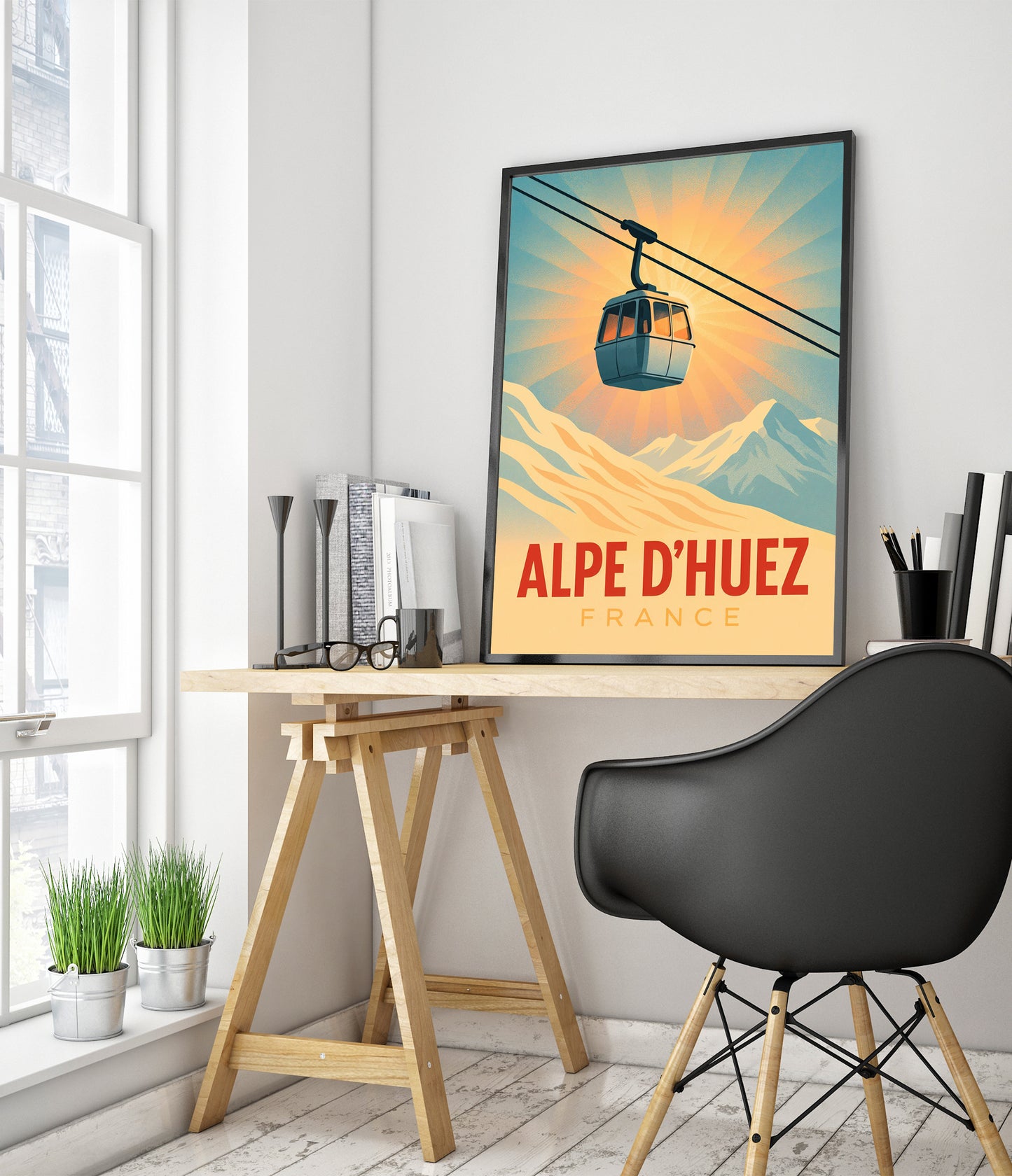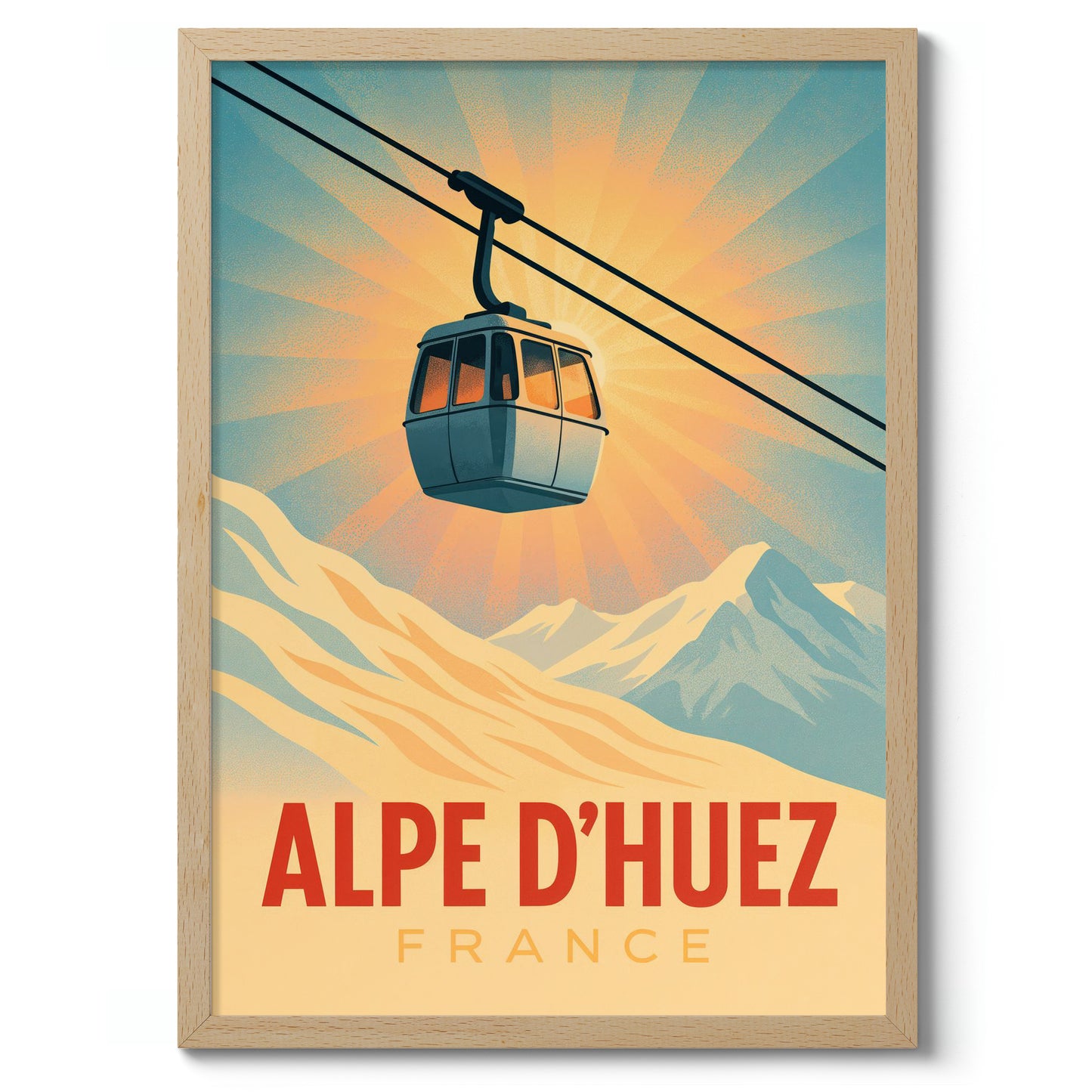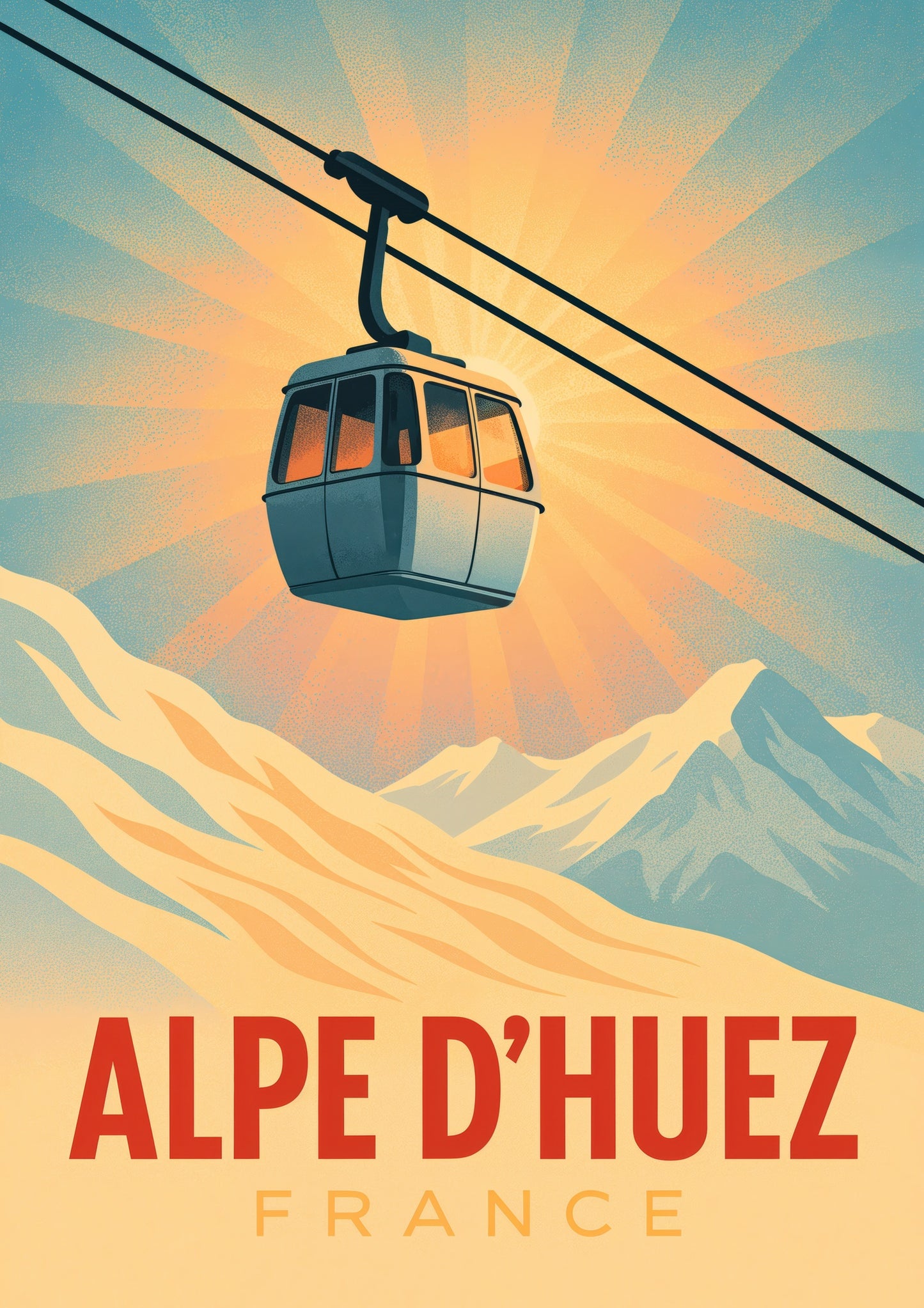 This vintage-style Alpe D'Huez poster artfully captures the serene beauty of the French Alps. Featuring a cable car against a backdrop of snow-capped mountains, the sun casts a warm, inviting glow across the scene. Ideal for skiers and travel enthusiasts, this graphic poster evokes the timeless allure of alpine adventure in one of France's renowned skiing destinations.