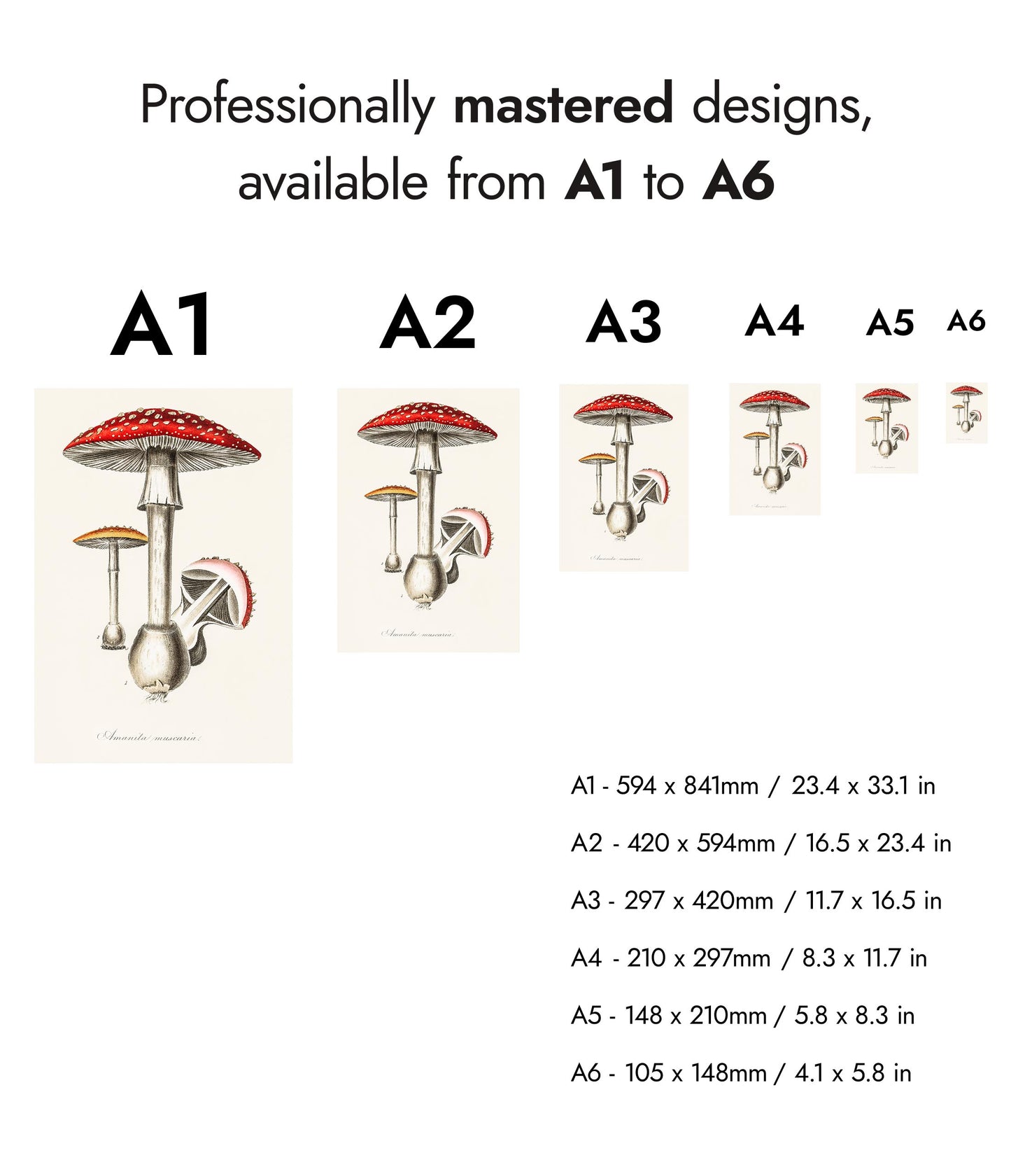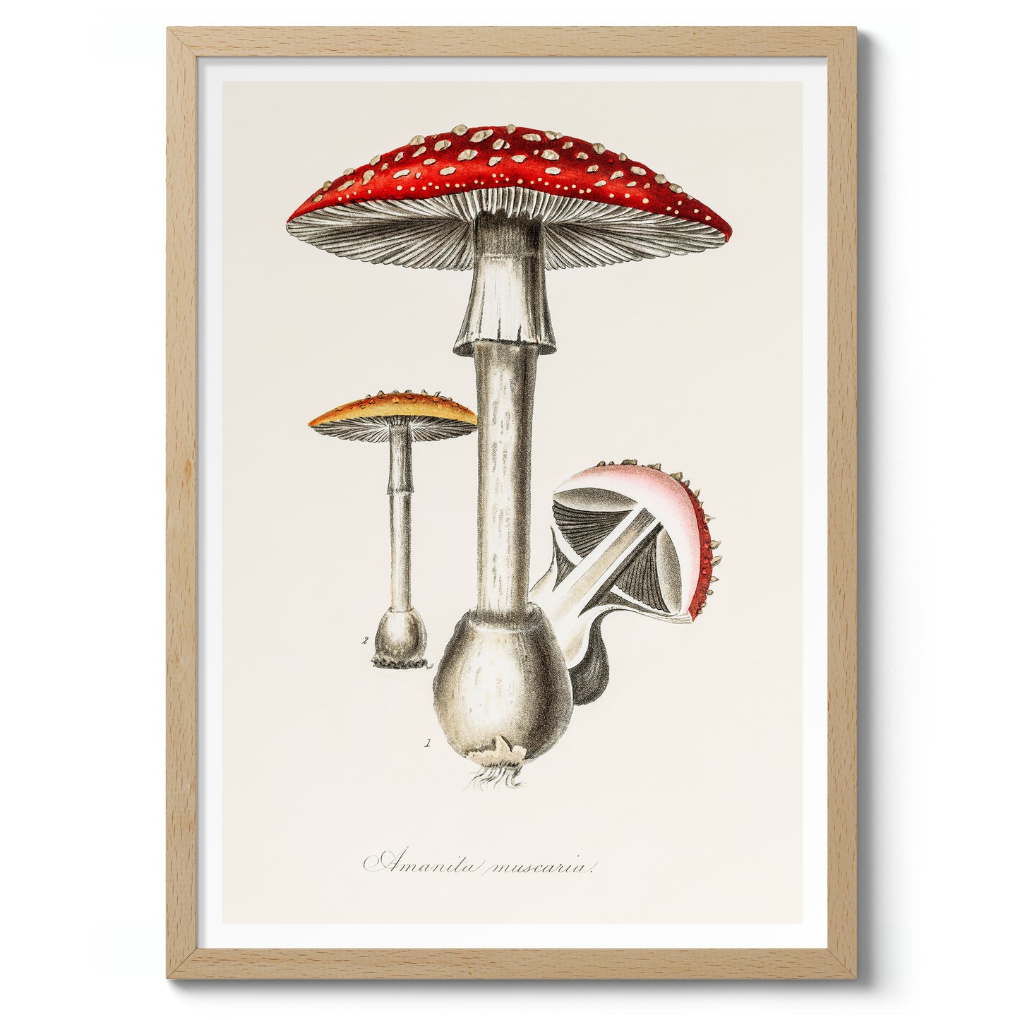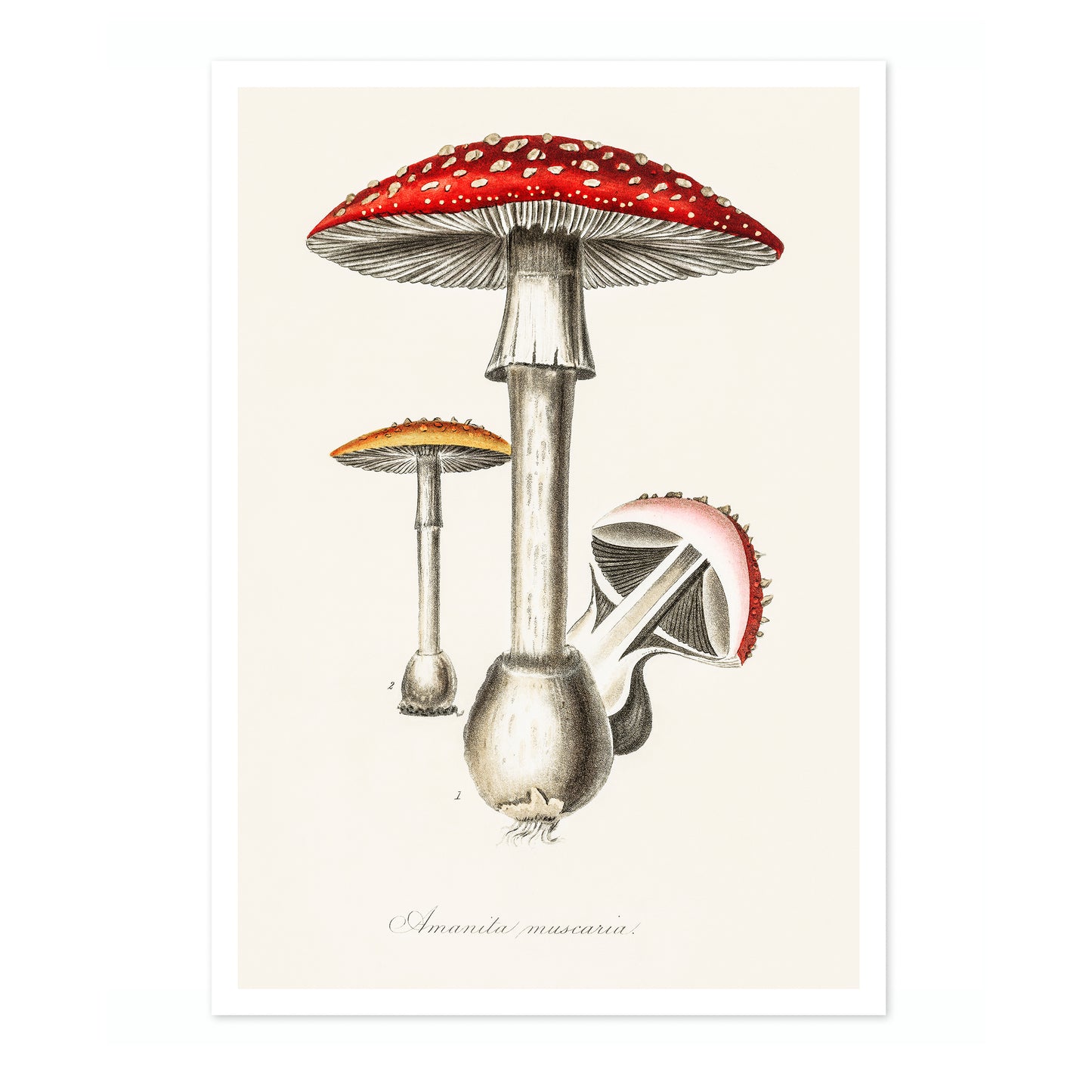 This vintage-style portrait poster features a detailed illustration of Amanita muscaria mushrooms, showcasing the striking red caps with white spots. The botanical artwork captures the beauty and intricacy of these mushrooms, rendered in meticulous detail. Ideal for nature enthusiasts, this poster adds a touch of elegance to any wall space.