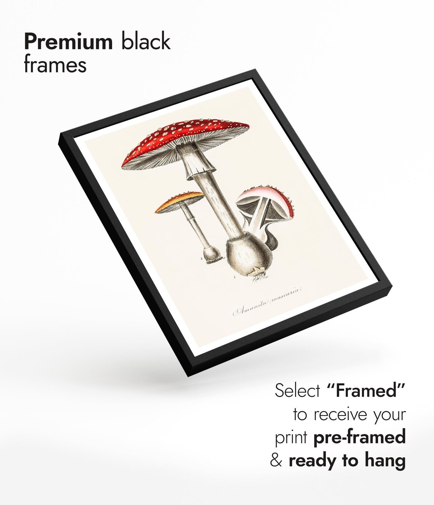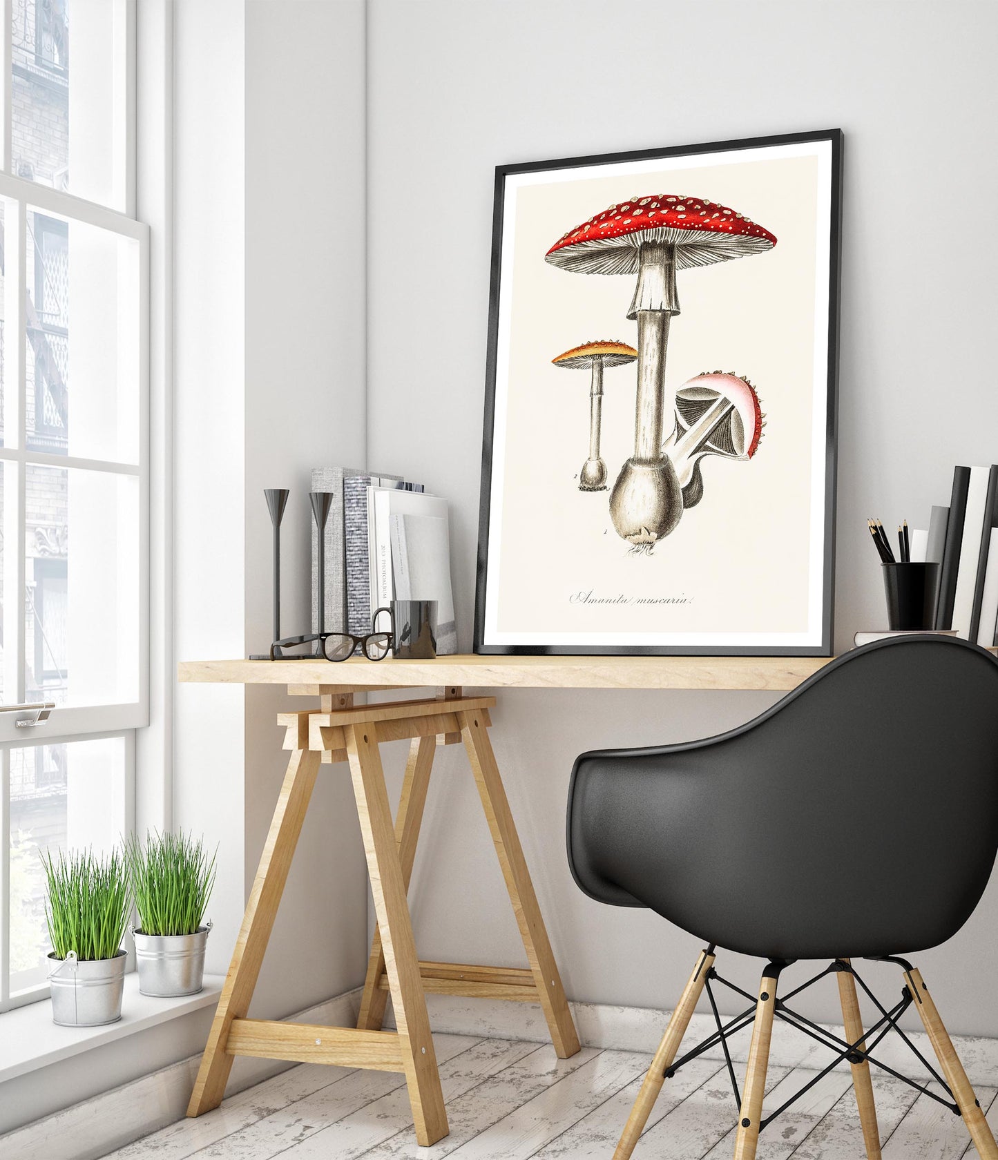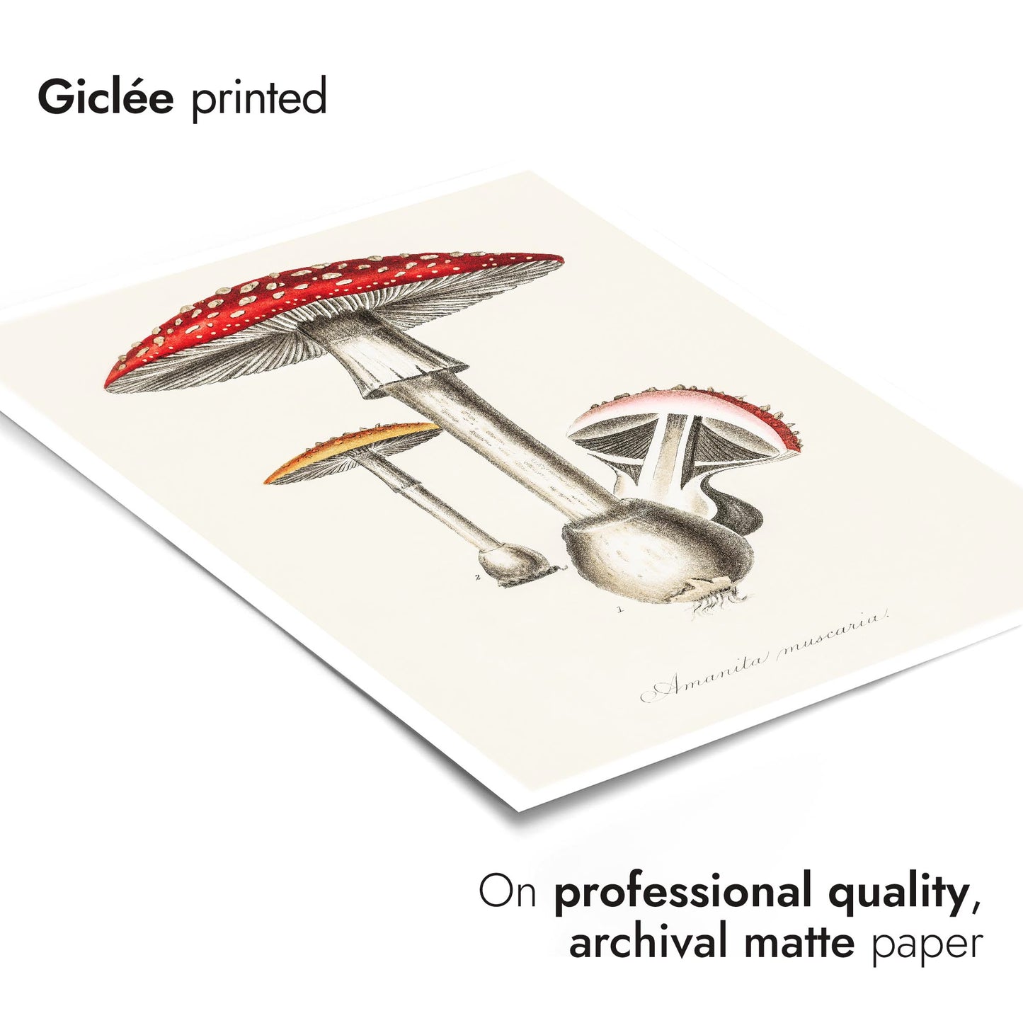 This vintage-style portrait poster features a detailed illustration of Amanita muscaria mushrooms, showcasing the striking red caps with white spots. The botanical artwork captures the beauty and intricacy of these mushrooms, rendered in meticulous detail. Ideal for nature enthusiasts, this poster adds a touch of elegance to any wall space.