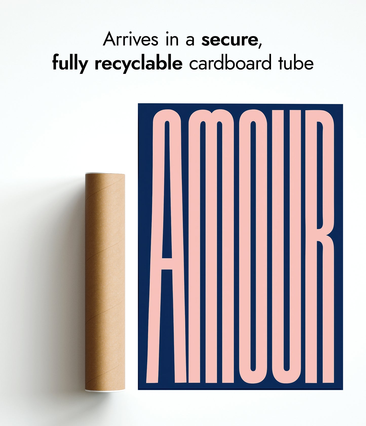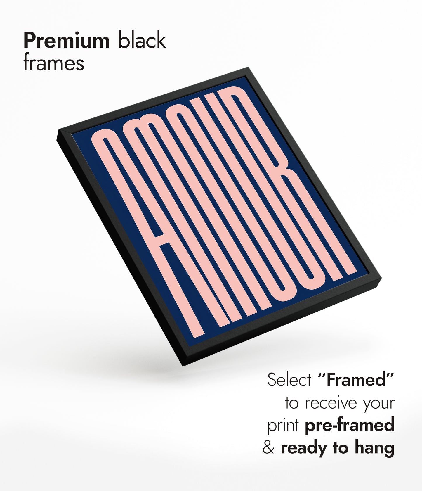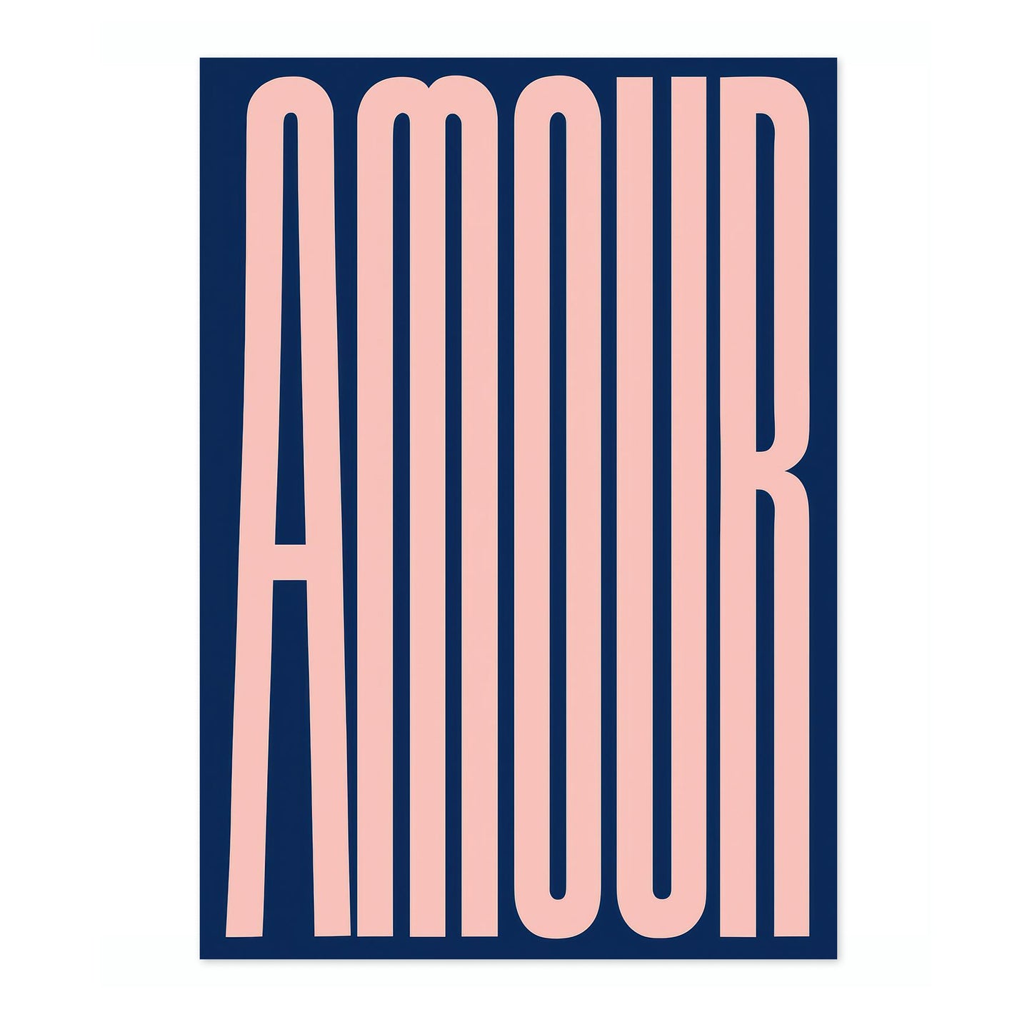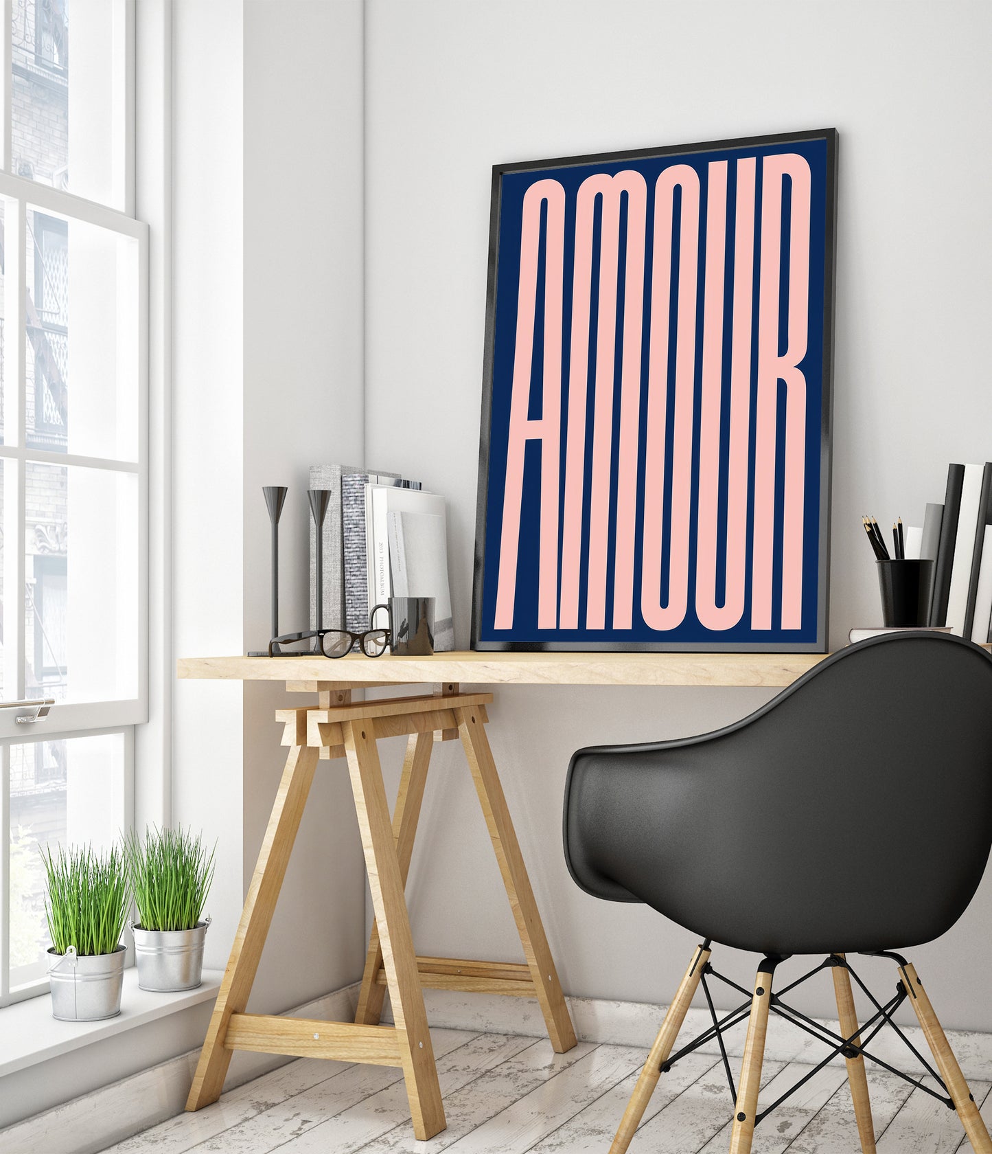 This striking "Amour" poster features a bold typographic design in a soft pink against a deep blue backdrop. The elongated letters imbue a sense of modern elegance, perfectly capturing the essence of love with a minimalist flair. Ideal for lovers of French aesthetics, this graphic poster adds a touch of romance to any space.