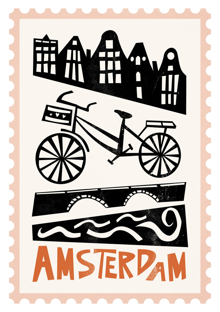 Capture the charm of the Dutch capital with this striking Amsterdam poster. Featuring minimalist black and white illustrations of iconic canal houses, a bicycle, and swirling canals, all set against a soft beige background. This graphic collage beautifully encapsulates the essence of Amsterdam’s architecture and vibrant cycling culture, making it a perfect addition for travel enthusiasts and art lovers alike.