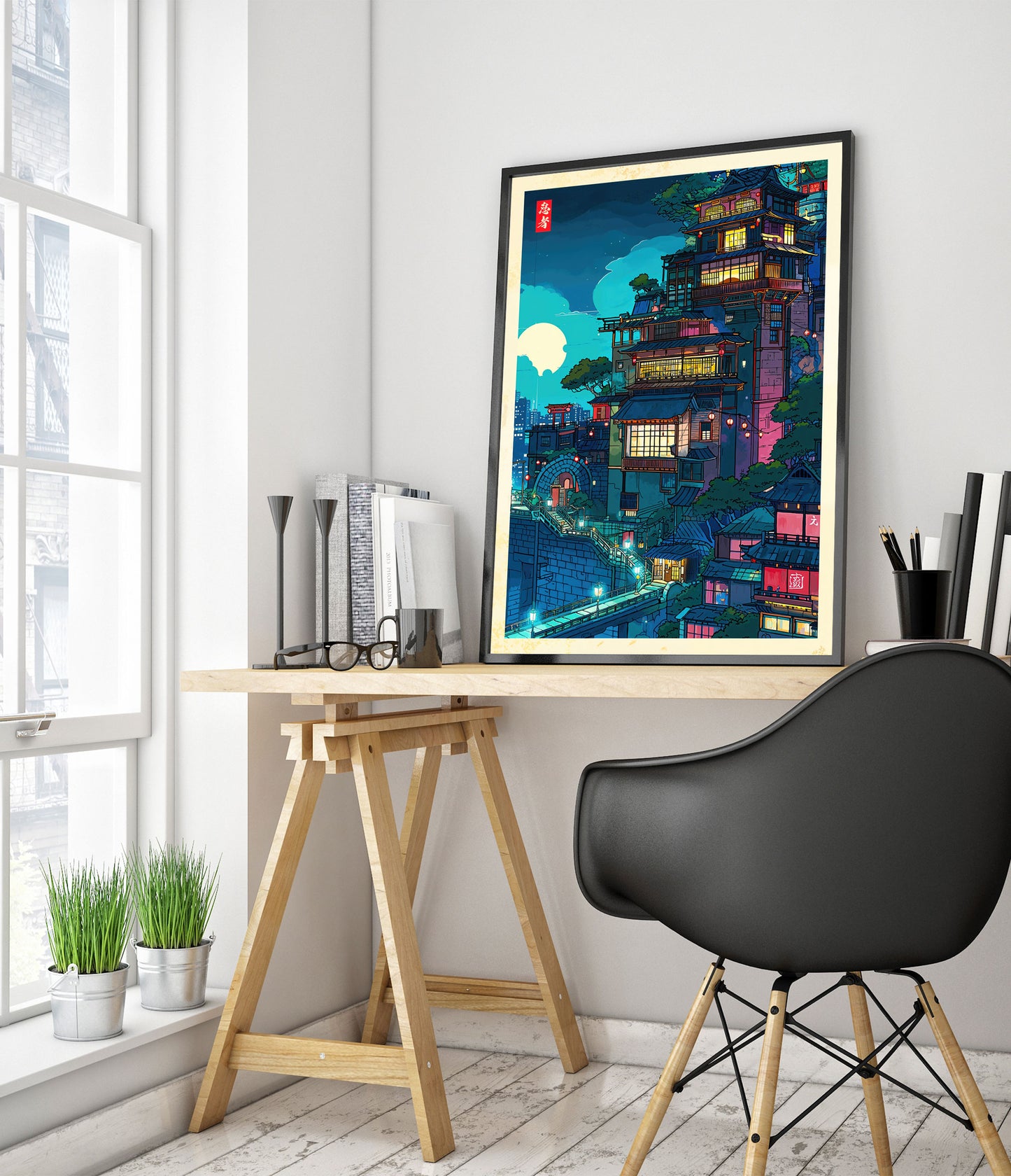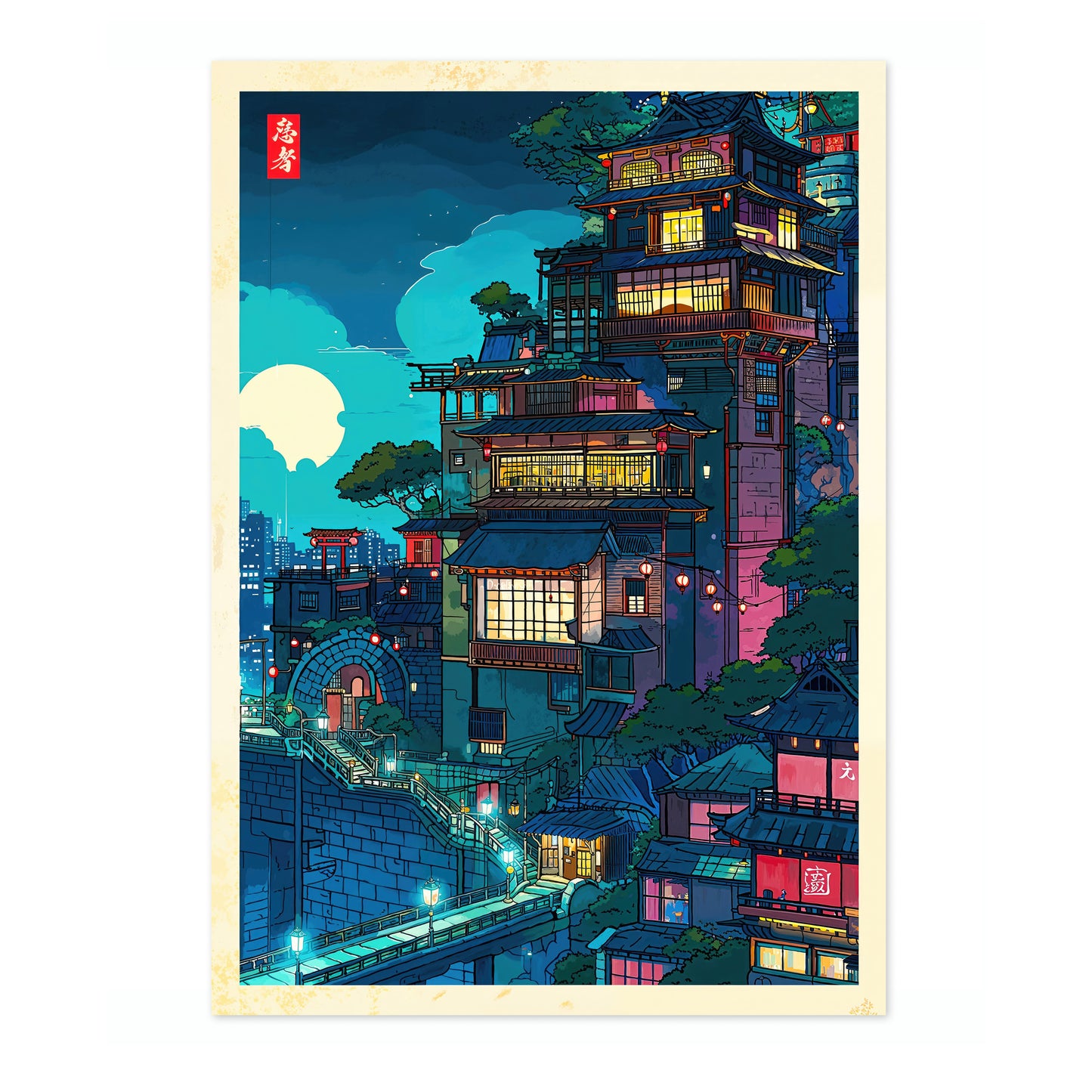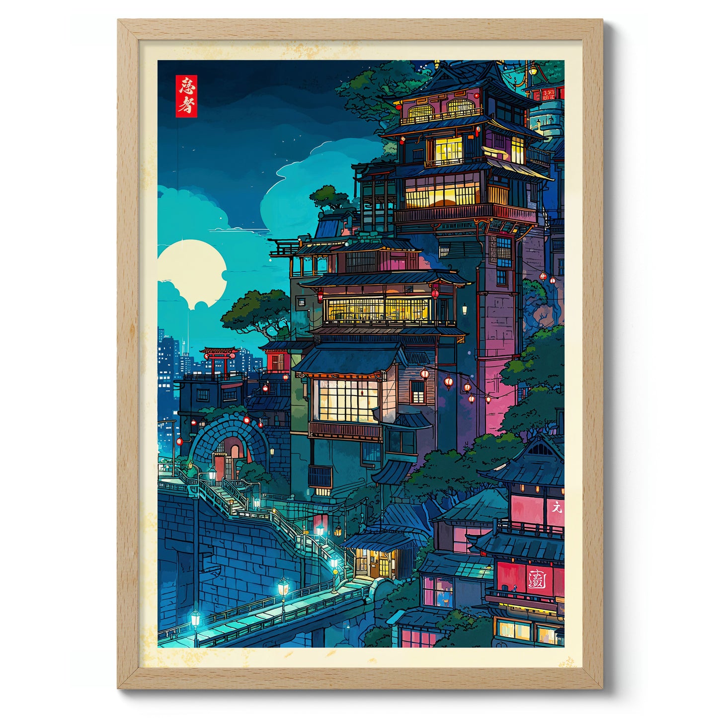 This vibrant anime city poster captures a mesmerizing night scene of a traditional Japanese urban landscape. Intricate, multistory buildings with glowing windows rise under a serene blue sky and full moon. The captivating architecture, combined with lush greenery and an illuminated bridge, showcases the detailed influence of woodblock and Ukiyo-E styles, offering a picturesque night view ideal for anime art enthusiasts.
