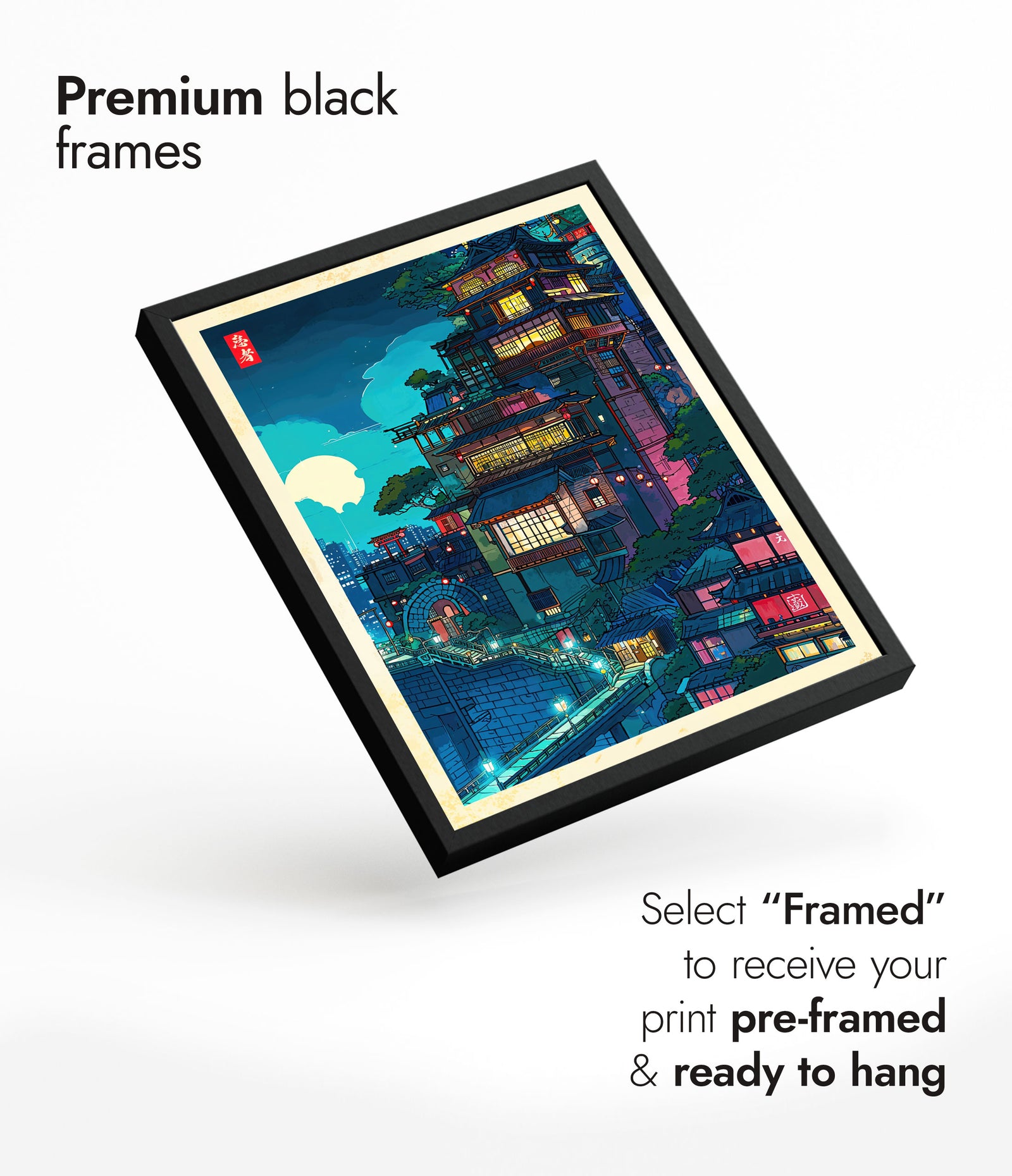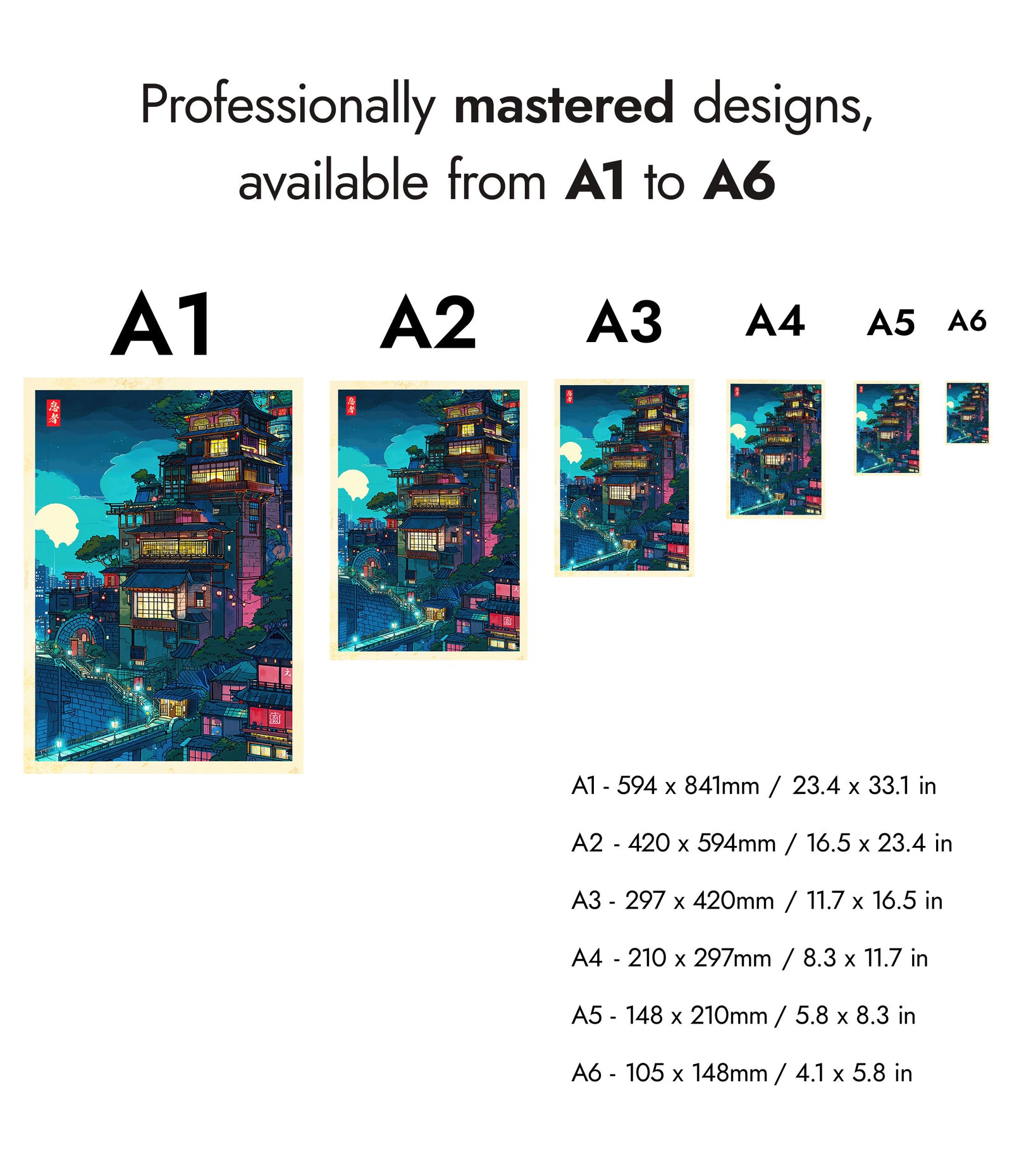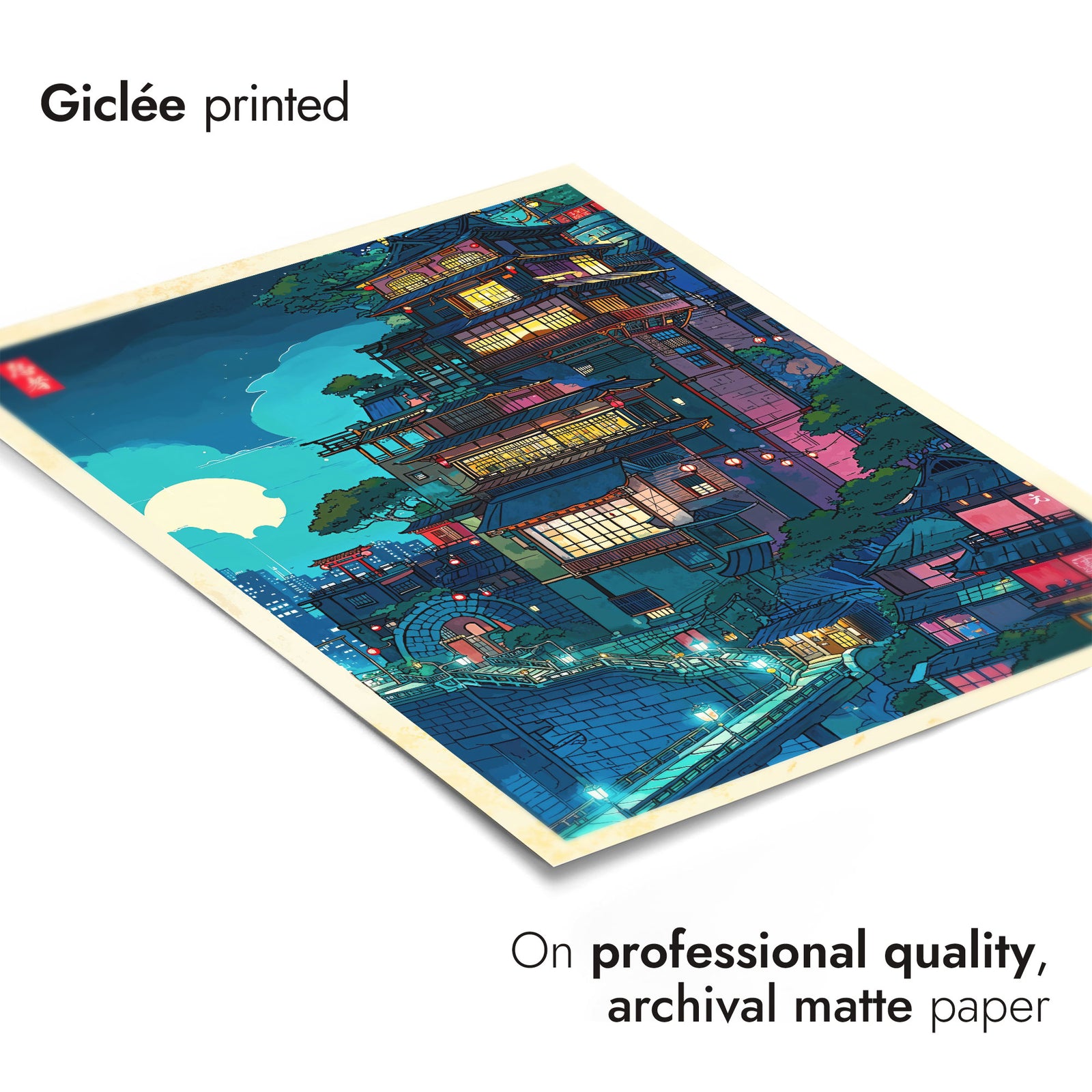This vibrant anime city poster captures a mesmerizing night scene of a traditional Japanese urban landscape. Intricate, multistory buildings with glowing windows rise under a serene blue sky and full moon. The captivating architecture, combined with lush greenery and an illuminated bridge, showcases the detailed influence of woodblock and Ukiyo-E styles, offering a picturesque night view ideal for anime art enthusiasts.