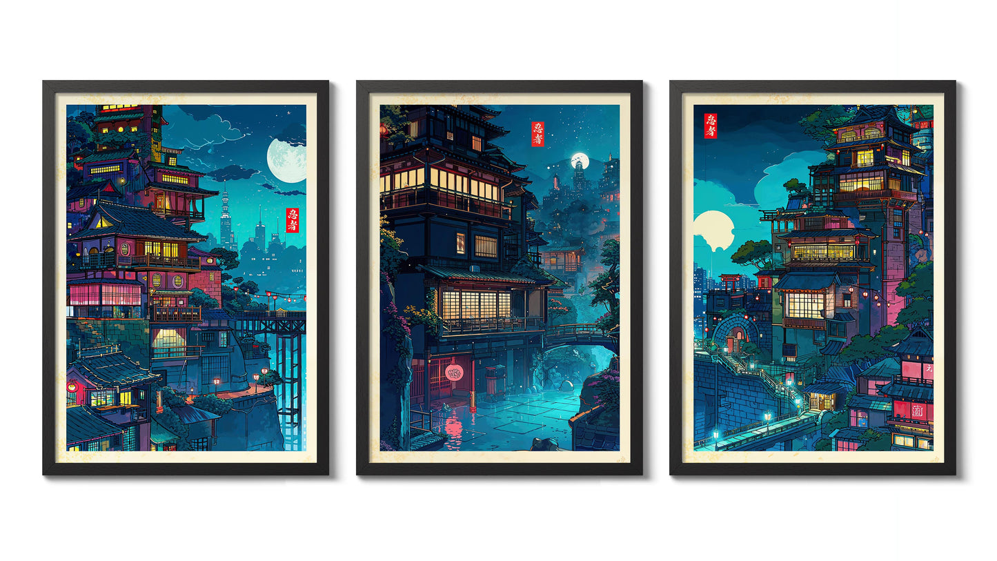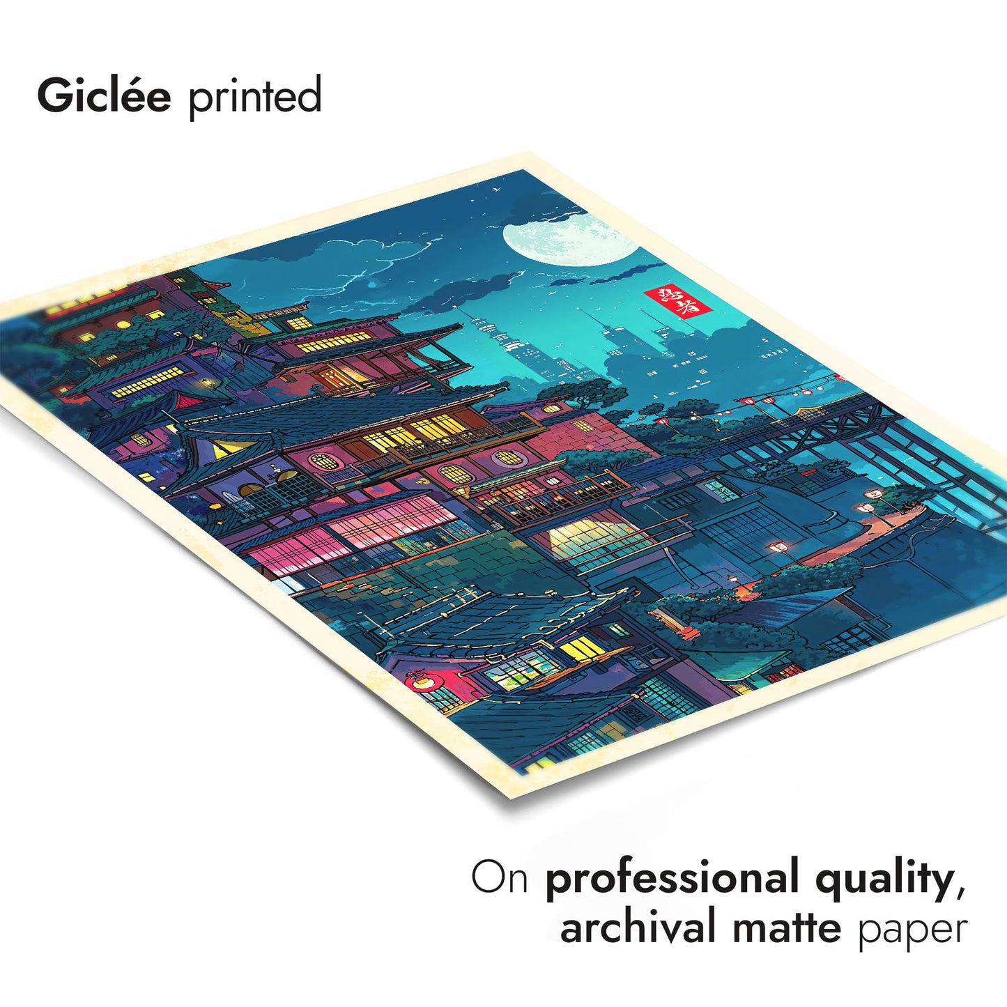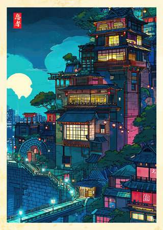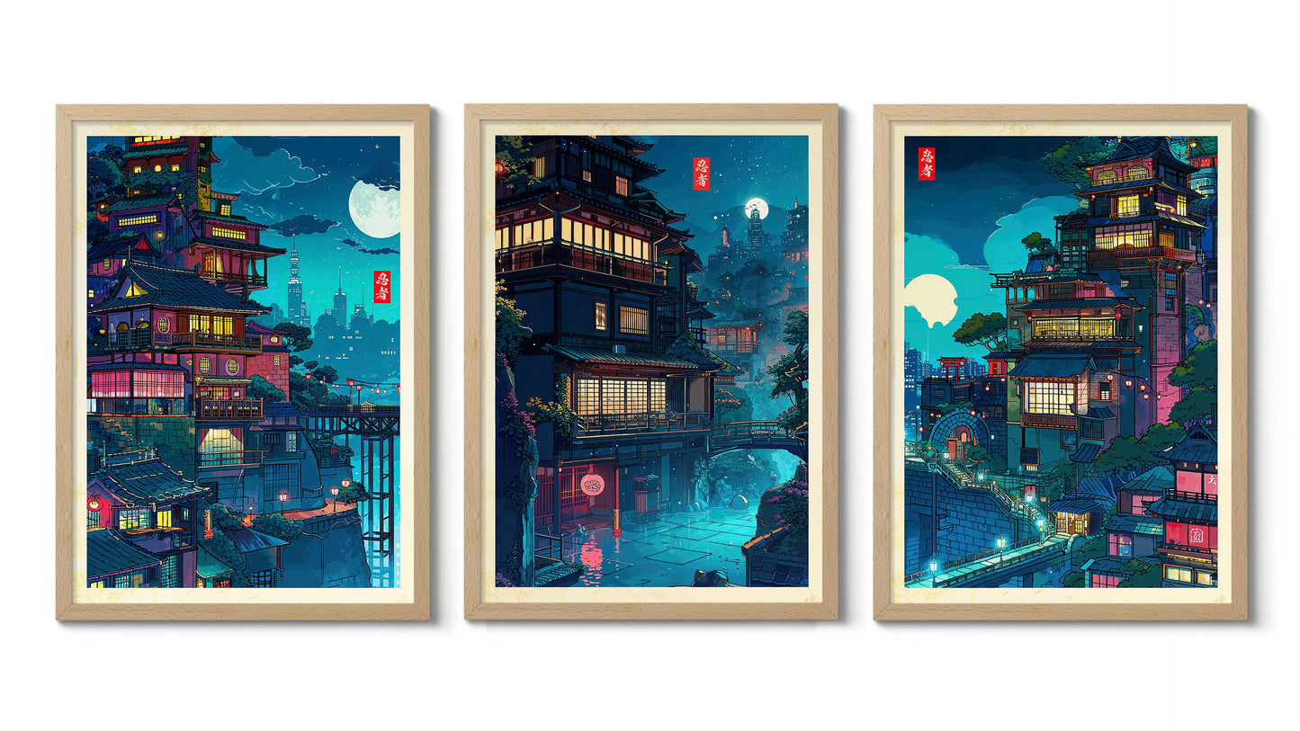 This Anime City Woodblocks poster set vividly depicts a serene Japanese cityscape at night, with vibrant neon lights shimmering in the rain-soaked streets. The intricate woodblock-style illustration captures traditional teahouses and temples under the glow of a full moon, blending graphic and anime influences to create a captivating visual experience. Ideal for fans of Japanese architecture and atmospheric night scenes.