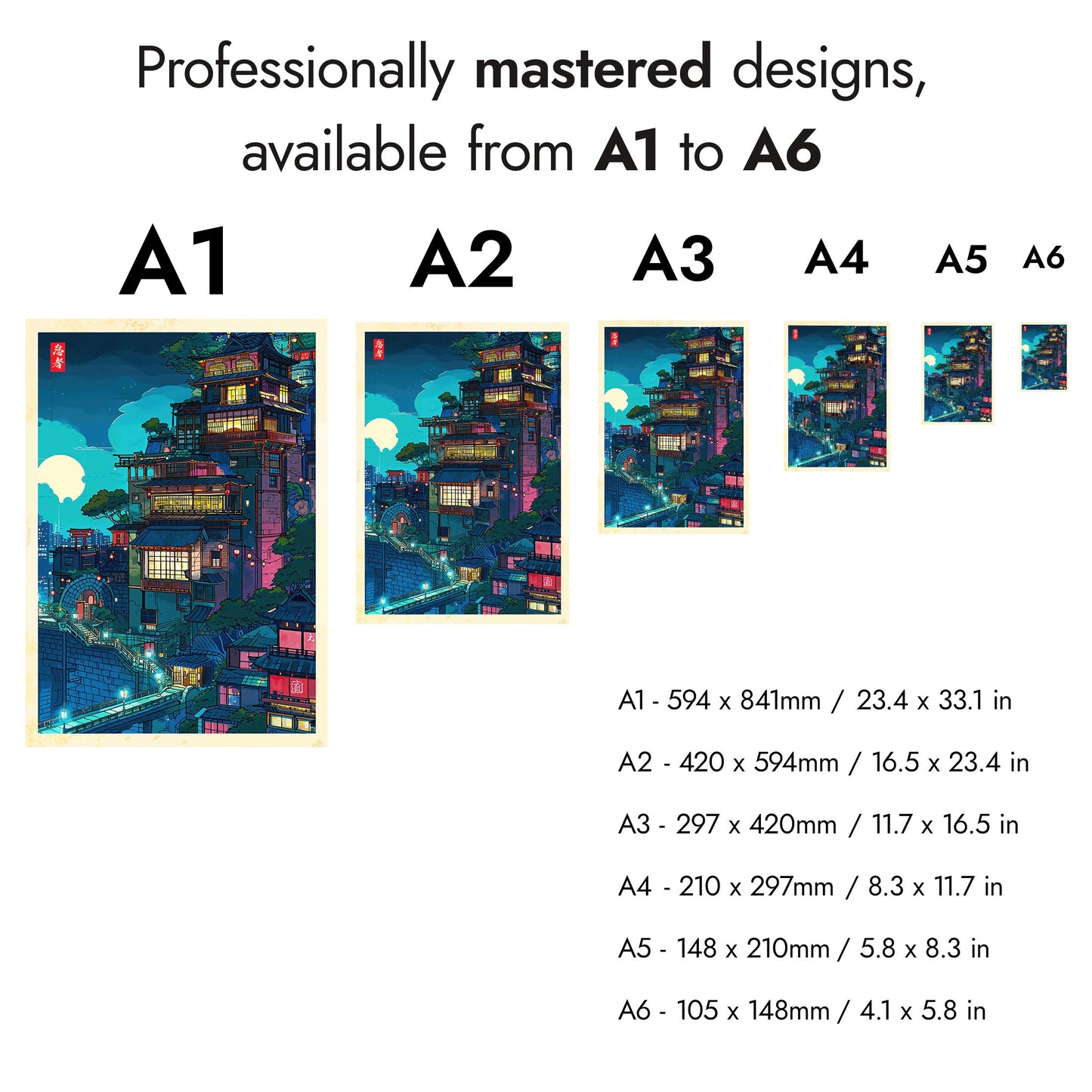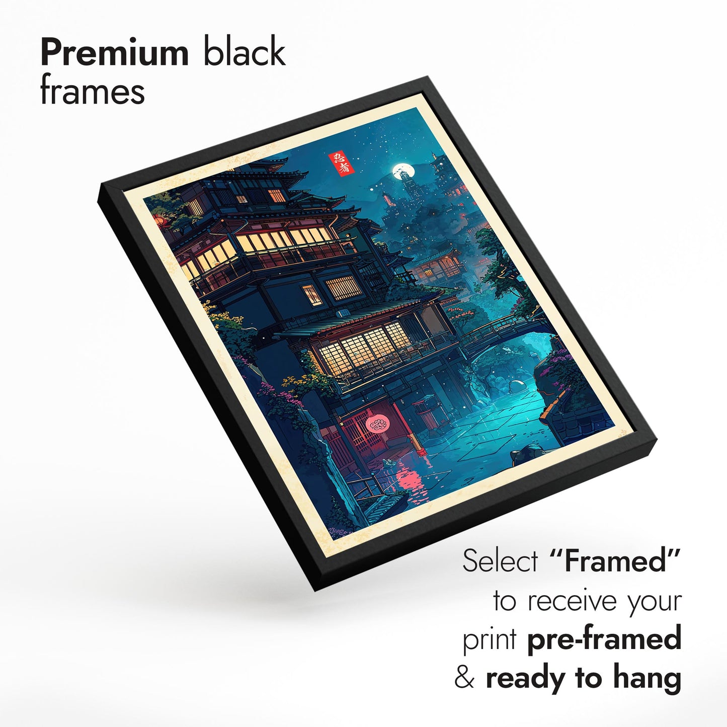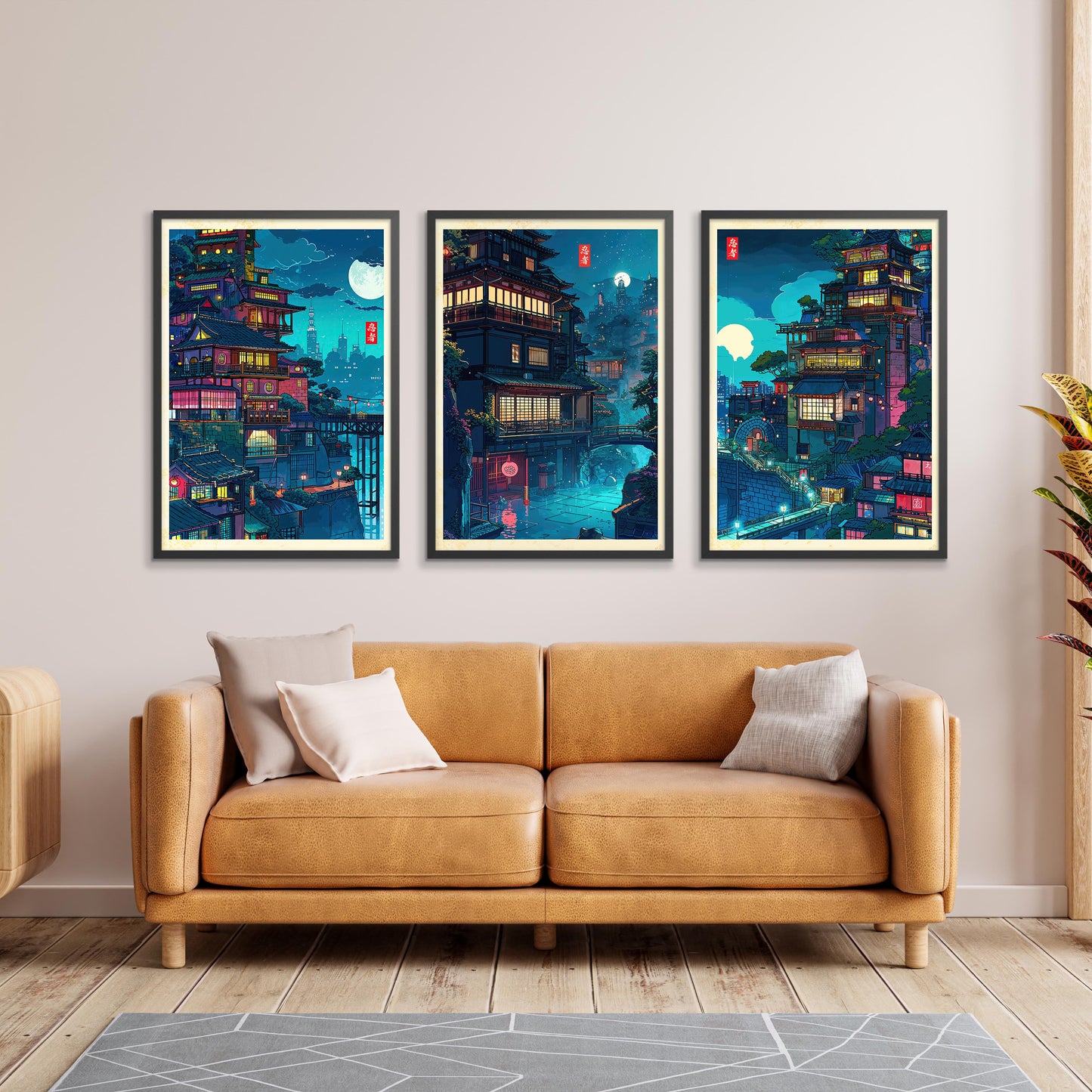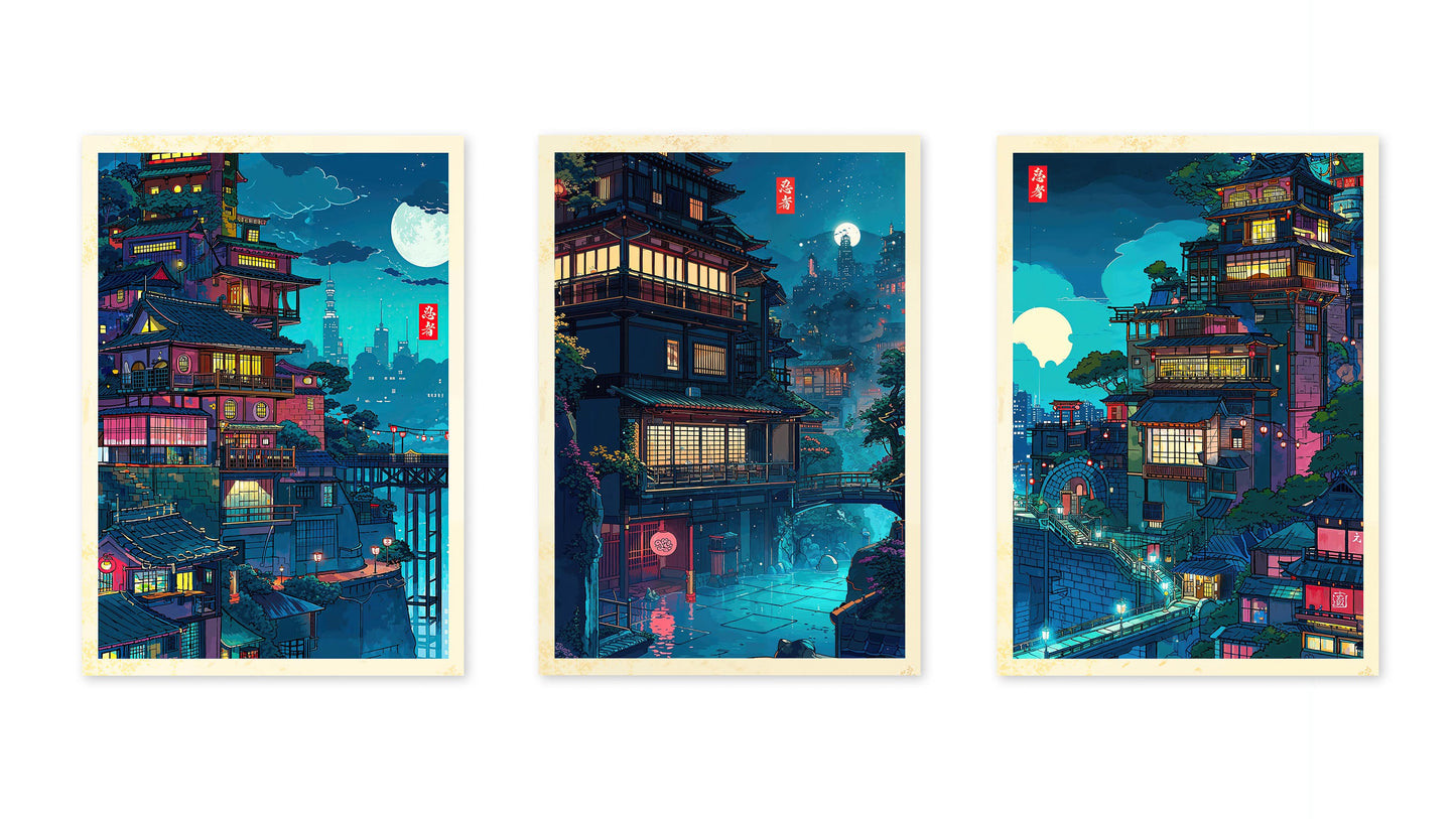 This Anime City Woodblocks poster set vividly depicts a serene Japanese cityscape at night, with vibrant neon lights shimmering in the rain-soaked streets. The intricate woodblock-style illustration captures traditional teahouses and temples under the glow of a full moon, blending graphic and anime influences to create a captivating visual experience. Ideal for fans of Japanese architecture and atmospheric night scenes.