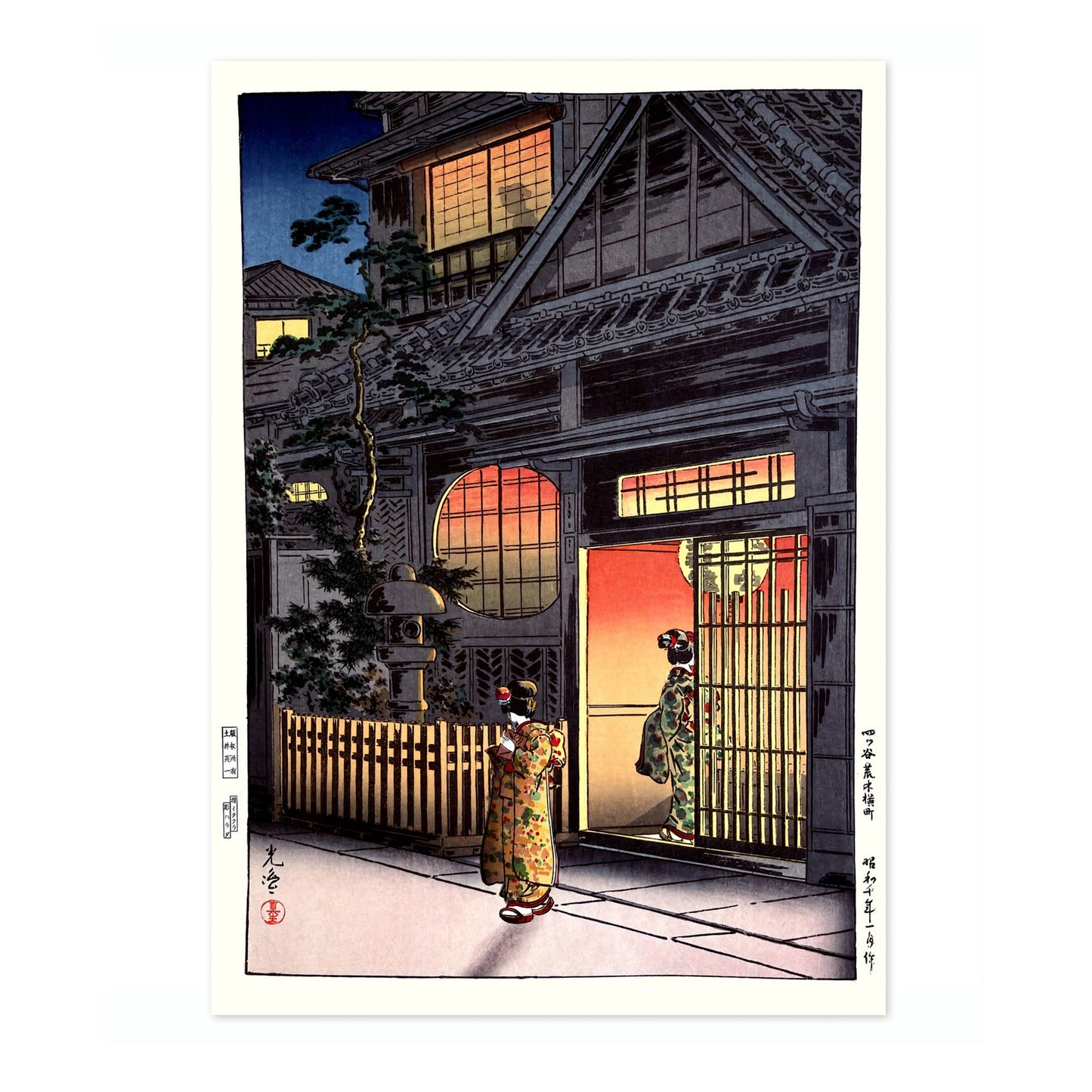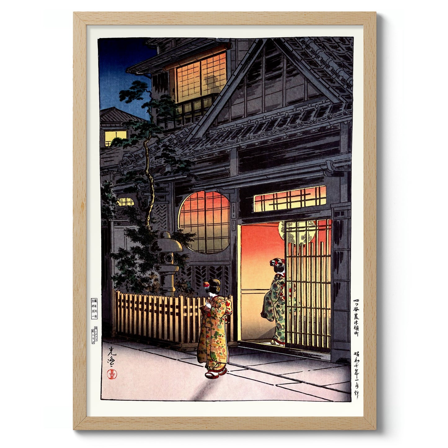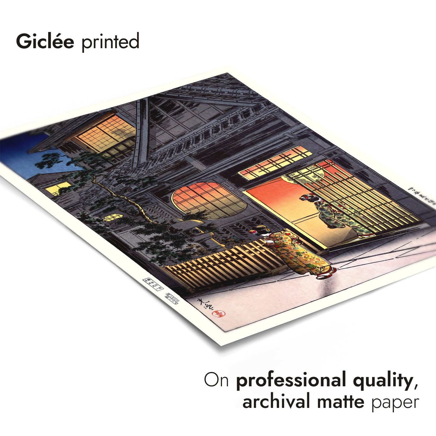 This art print, titled "Araki Street in Yostuya" by Tsuchiya Koitsu, intricately captures the serene nighttime ambiance of Japanese architecture in a woodblock style. Featuring warm beige and grey tones, the poster depicts elegantly dressed figures under a softly glowing streetlamp, highlighting traditional Japanese nightlife. Ideal for those seeking a cultural and architectural essence in wall art.
