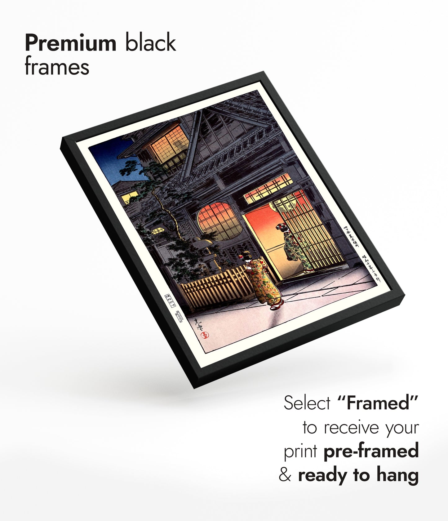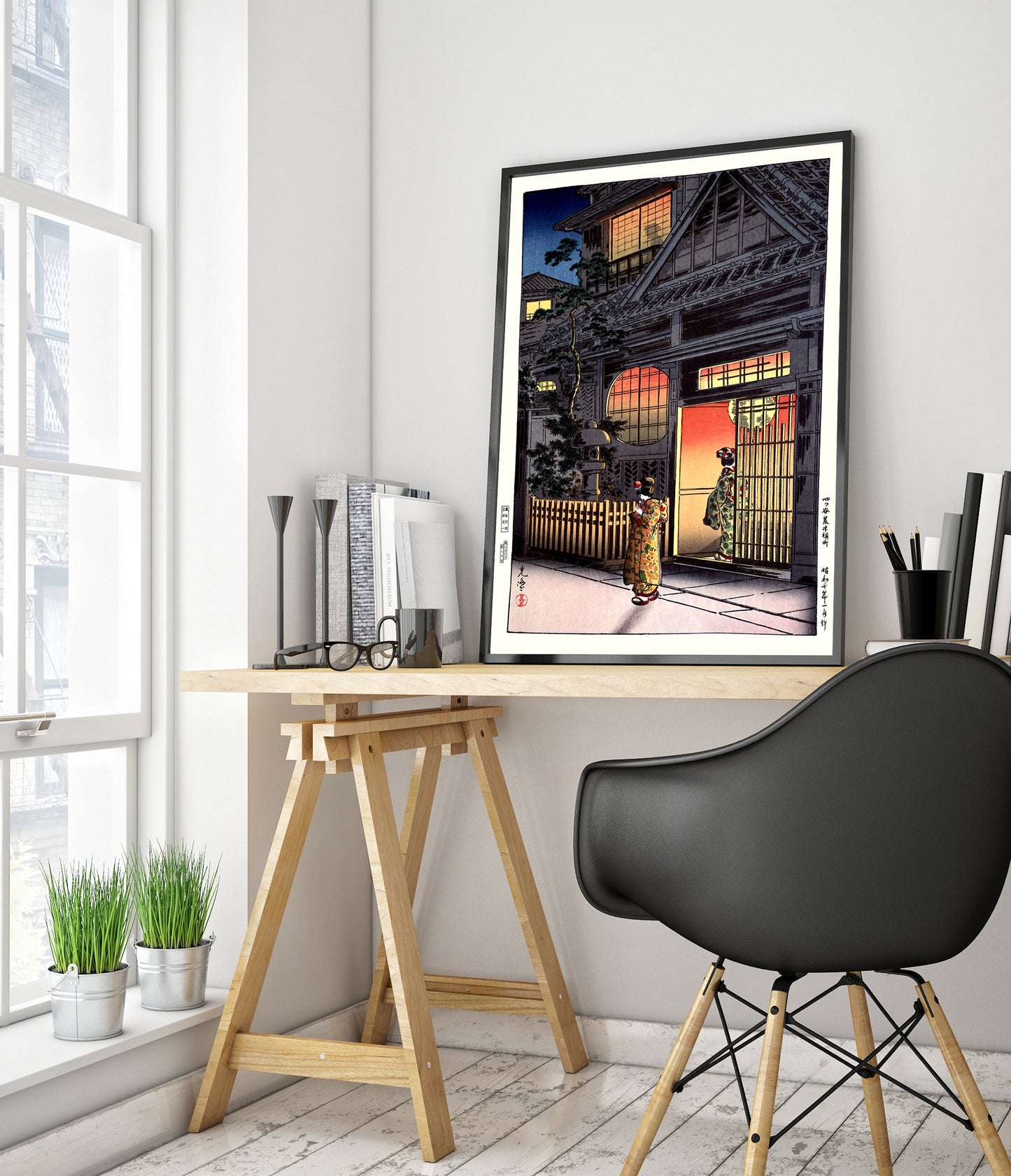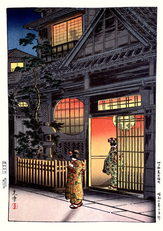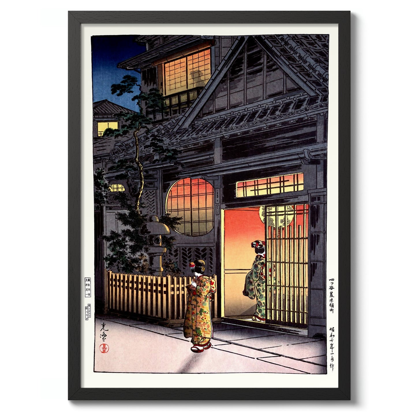 This art print, titled "Araki Street in Yostuya" by Tsuchiya Koitsu, intricately captures the serene nighttime ambiance of Japanese architecture in a woodblock style. Featuring warm beige and grey tones, the poster depicts elegantly dressed figures under a softly glowing streetlamp, highlighting traditional Japanese nightlife. Ideal for those seeking a cultural and architectural essence in wall art.