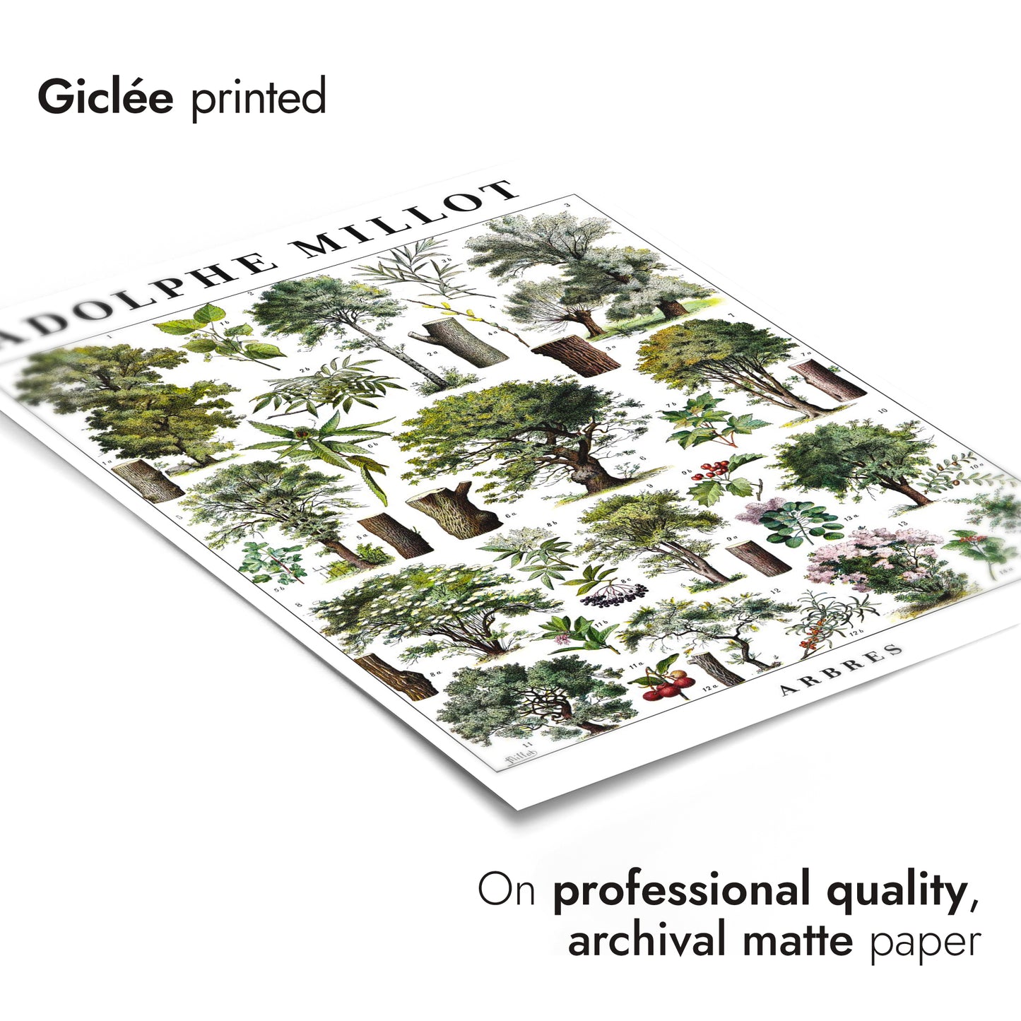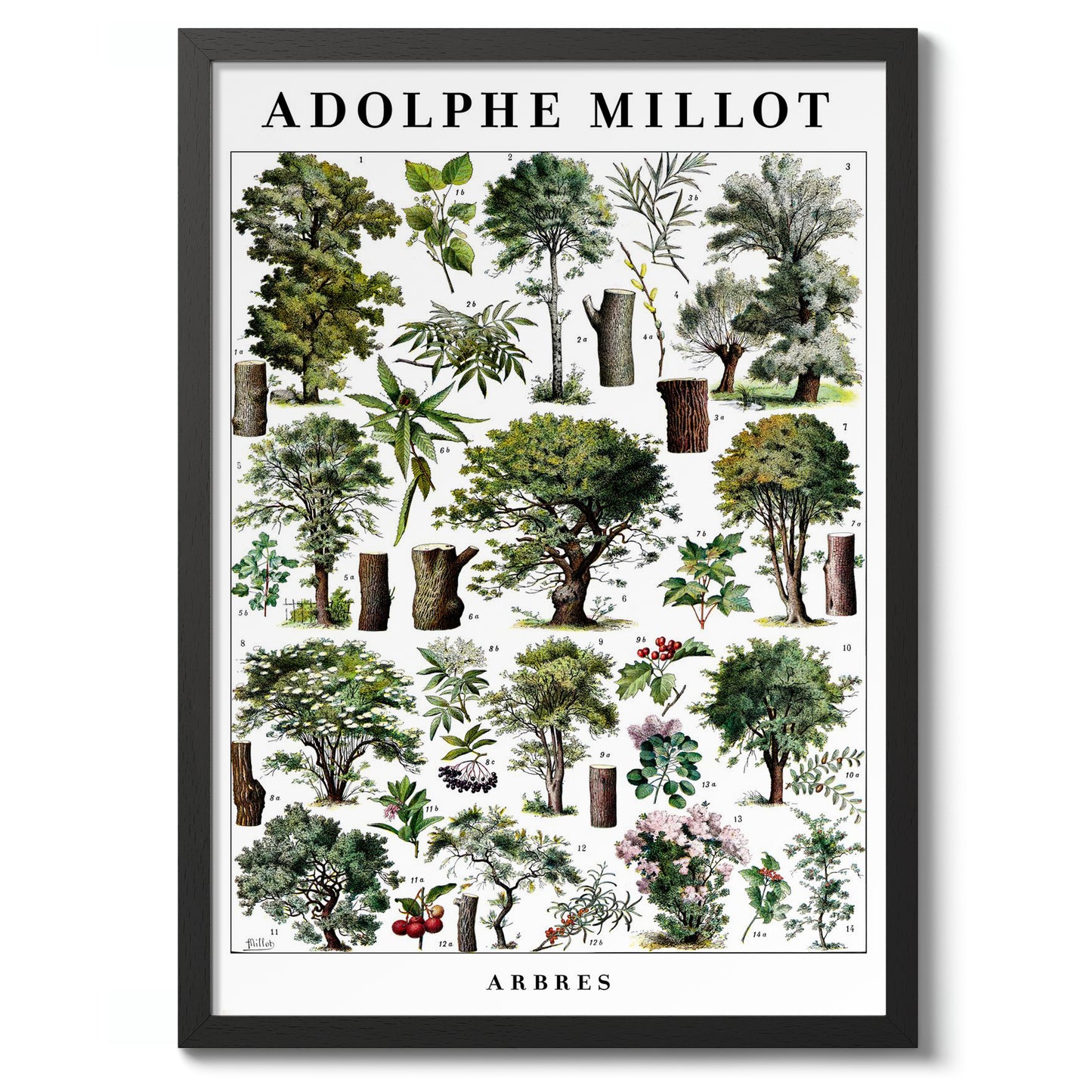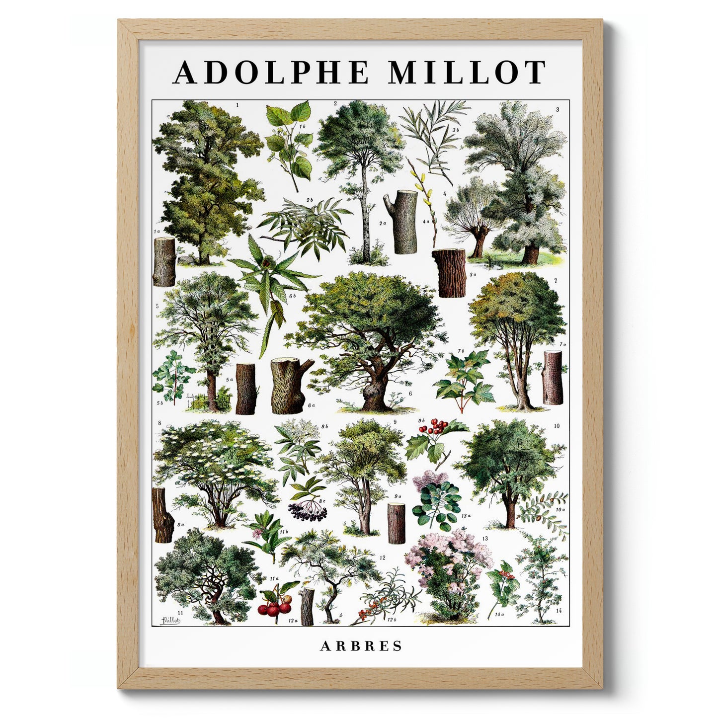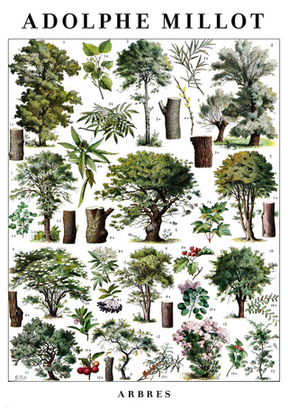 This vintage botanical poster, "Arbres" by Adolphe Millot, presents a meticulously illustrated array of diverse trees. Showcasing detailed tree structures and foliage, it serves as a scientific study in greens and browns. Ideal for nature enthusiasts, this art print embodies the timeless beauty of botanical studies, perfect for adding a touch of vintage charm to any space.