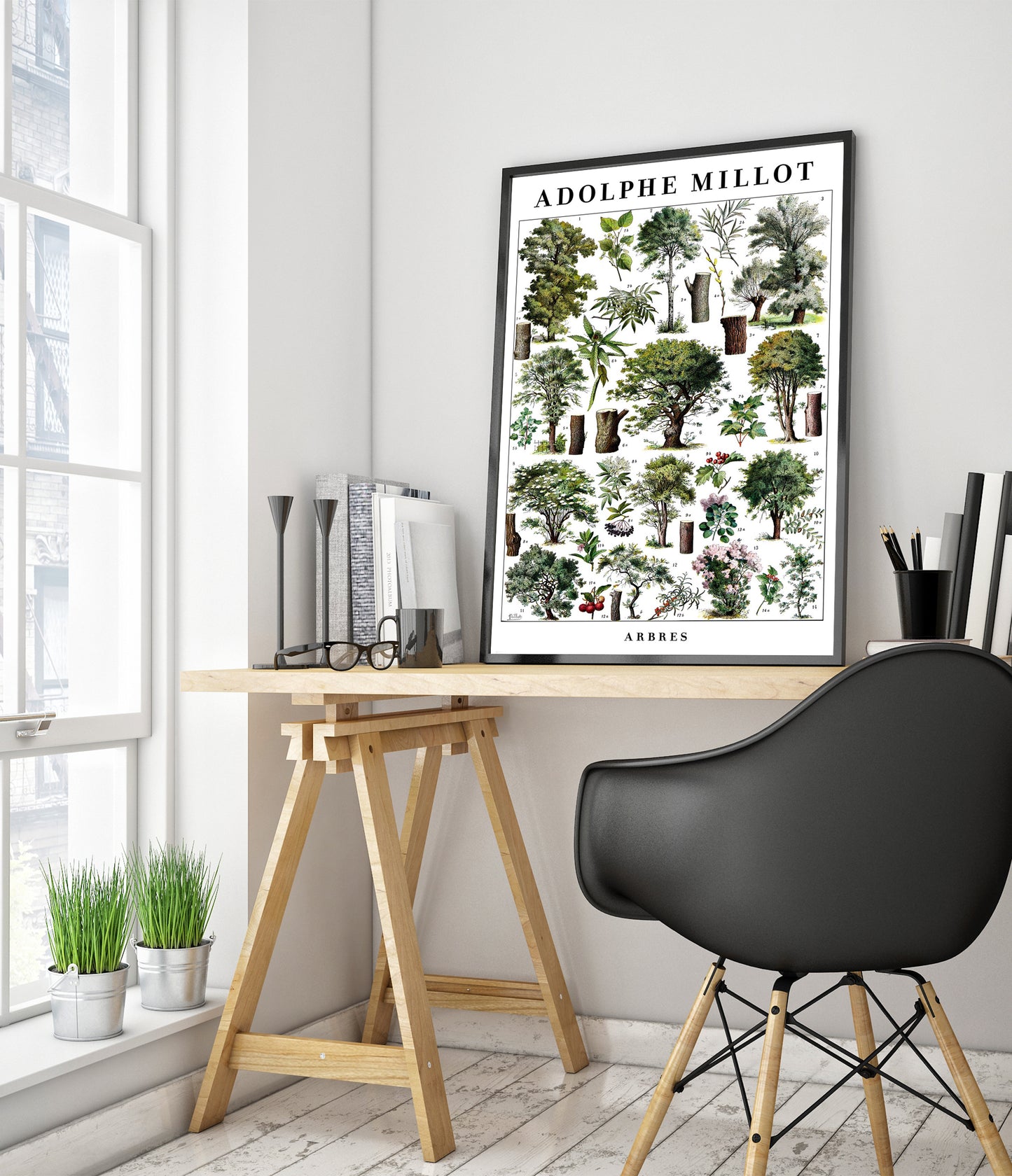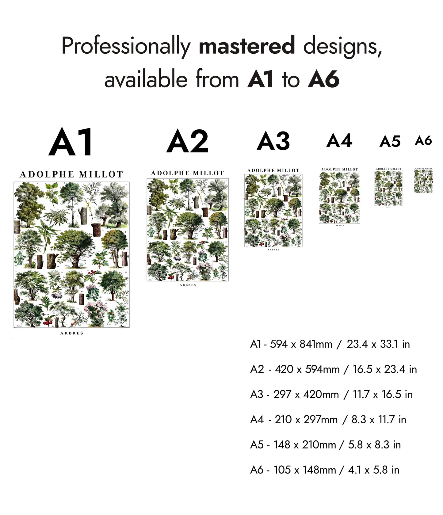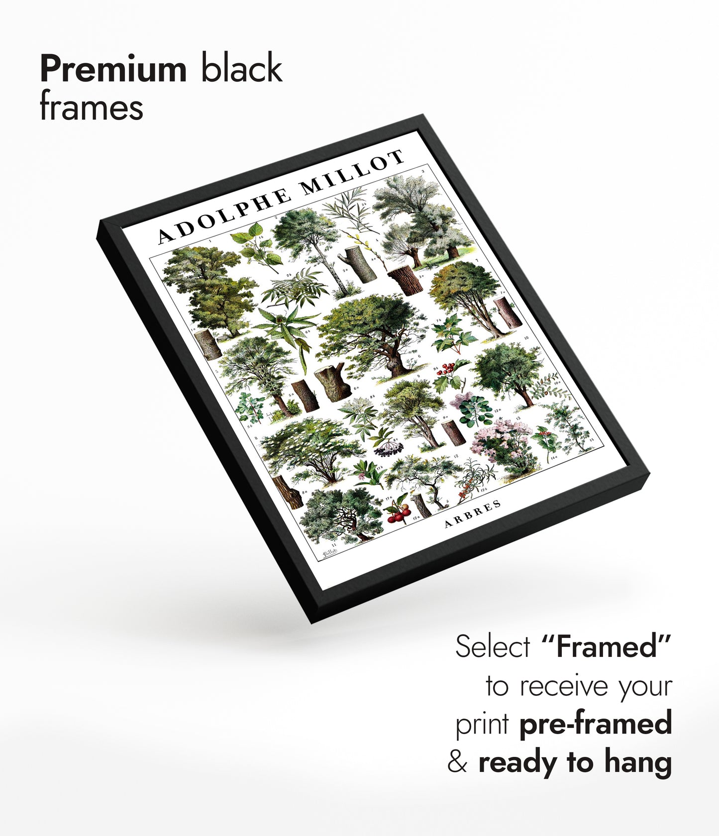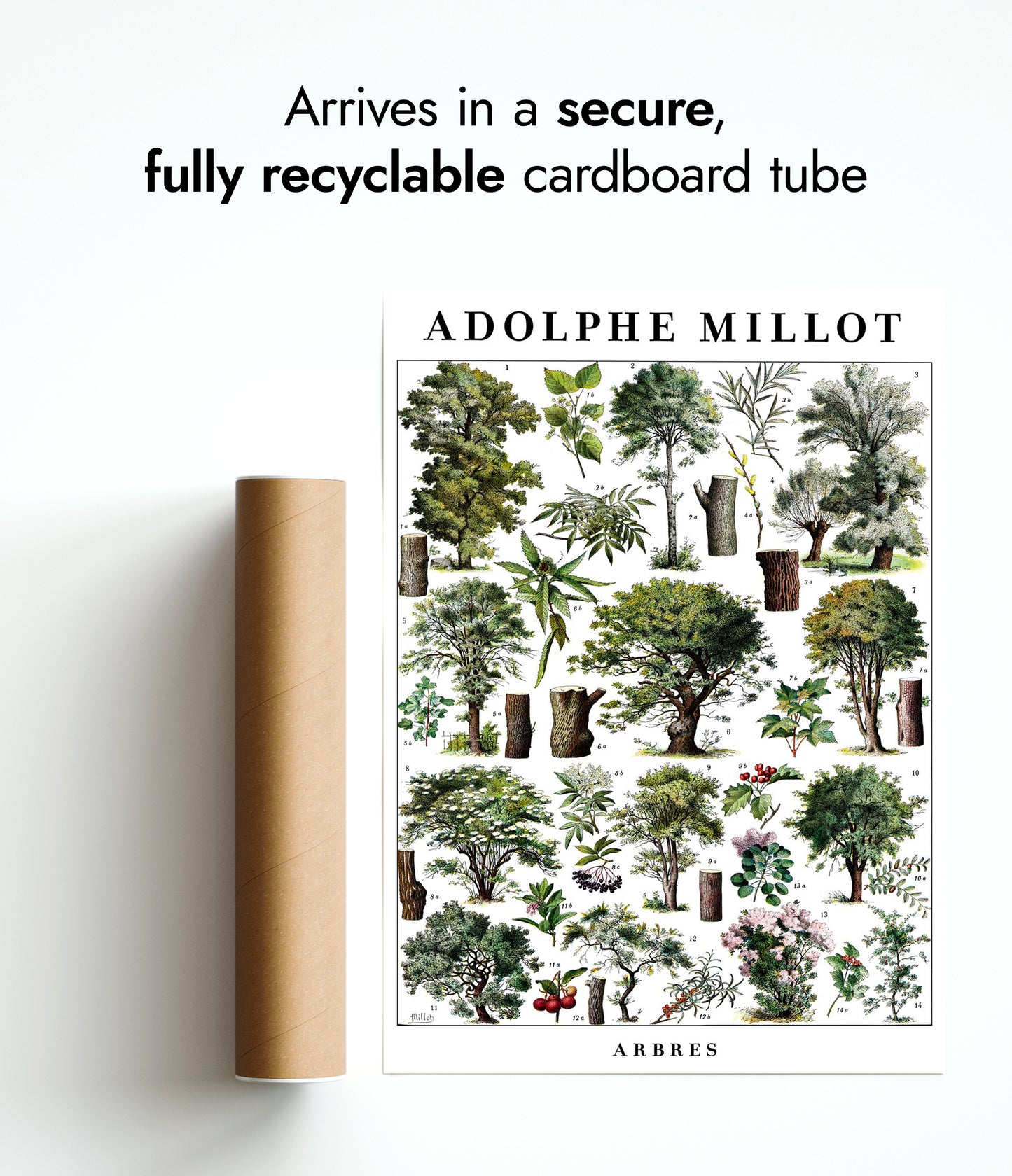 This vintage botanical poster, "Arbres" by Adolphe Millot, presents a meticulously illustrated array of diverse trees. Showcasing detailed tree structures and foliage, it serves as a scientific study in greens and browns. Ideal for nature enthusiasts, this art print embodies the timeless beauty of botanical studies, perfect for adding a touch of vintage charm to any space.