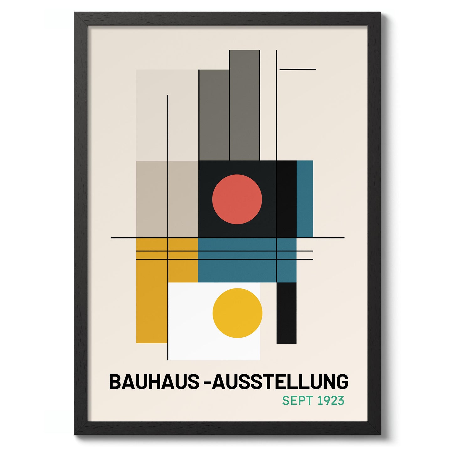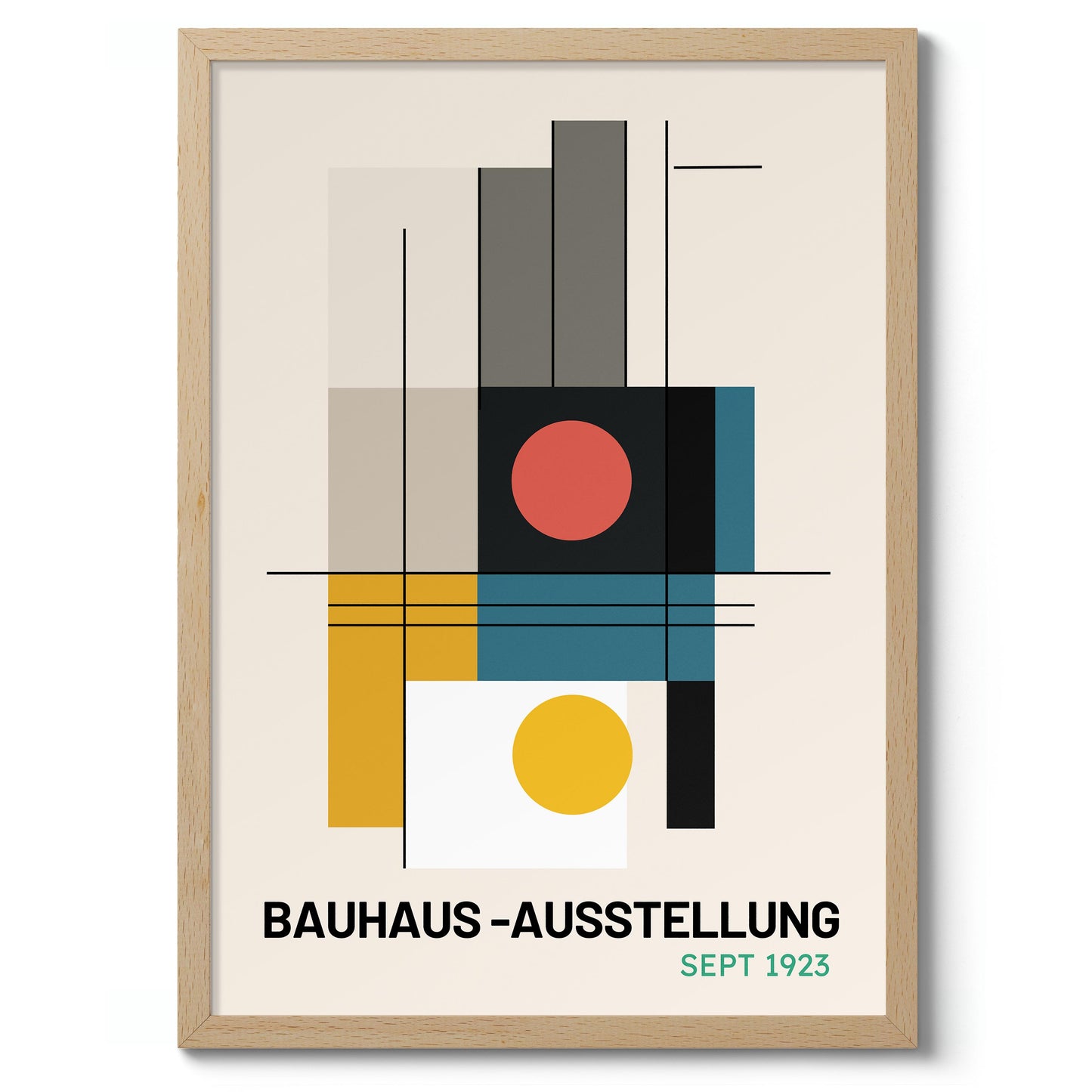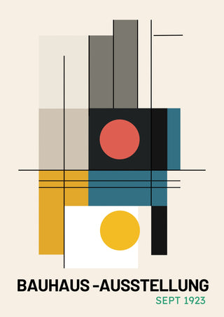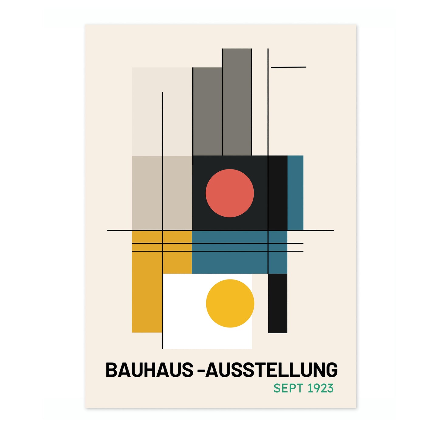 The "Architectural Construction" poster is a striking Bauhaus-inspired art piece featuring geometric shapes in a harmonious composition. Bold circles and squares in primary colours are layered over a neutral background, accentuated by precise linework. Celebrating the Bauhaus exhibition of September 1923, this mid-century graphic print embodies abstract and architectural themes, perfect for modern spaces.