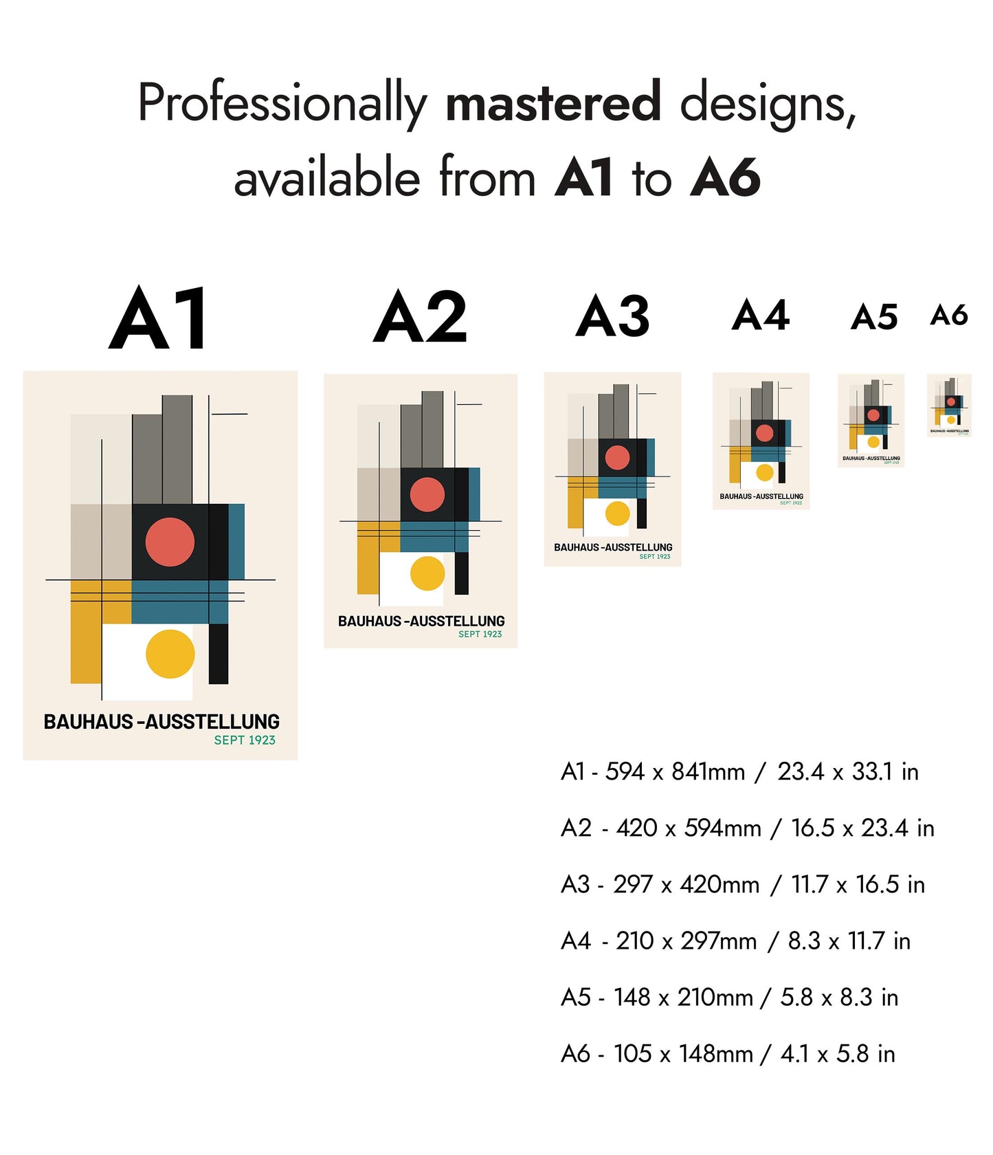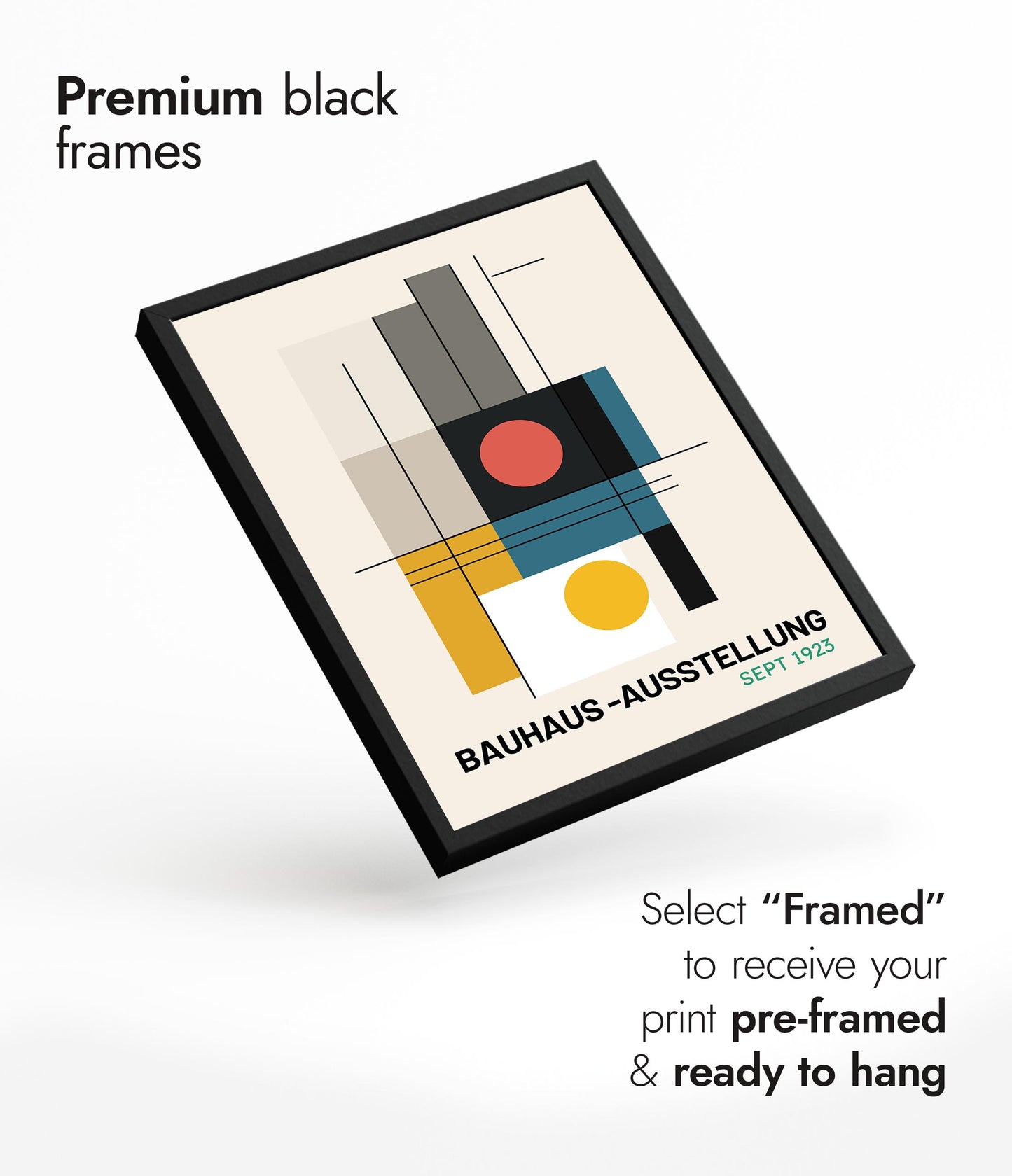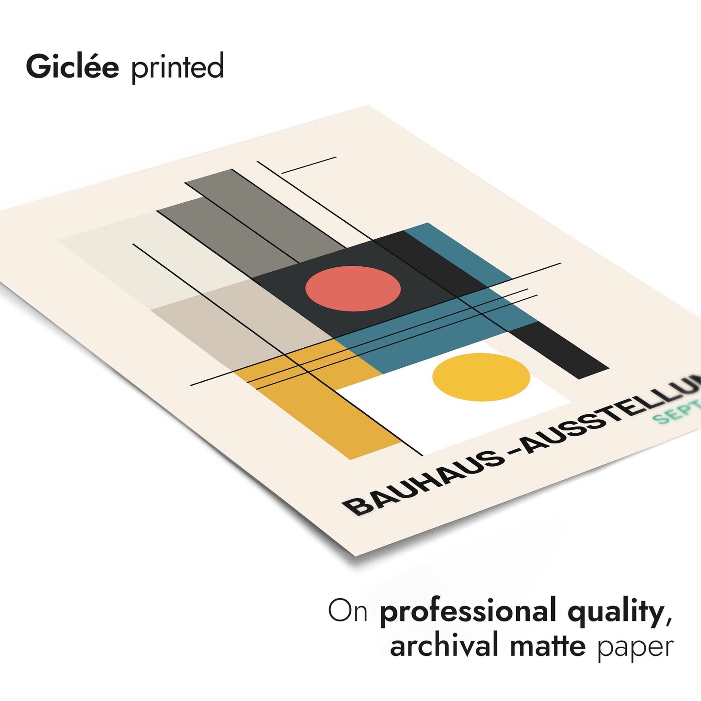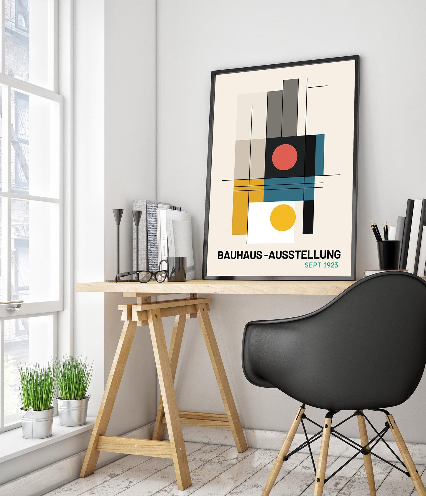 The "Architectural Construction" poster is a striking Bauhaus-inspired art piece featuring geometric shapes in a harmonious composition. Bold circles and squares in primary colours are layered over a neutral background, accentuated by precise linework. Celebrating the Bauhaus exhibition of September 1923, this mid-century graphic print embodies abstract and architectural themes, perfect for modern spaces.