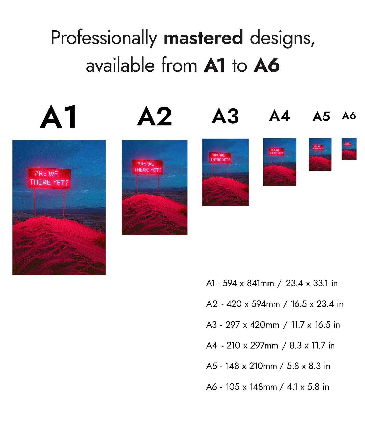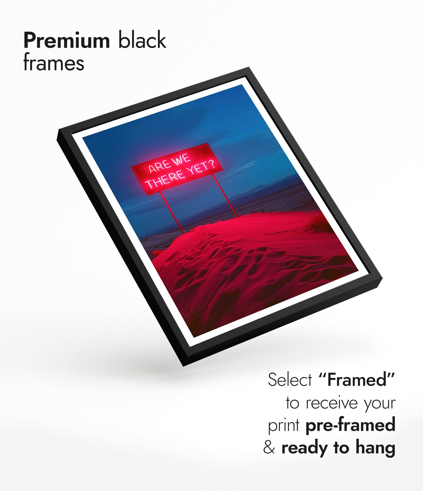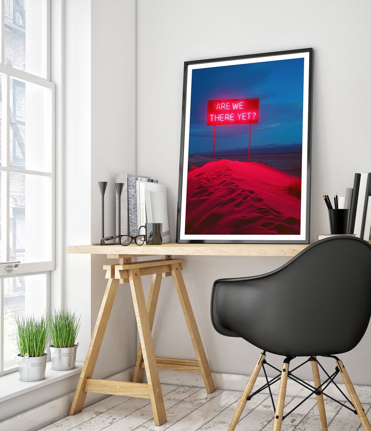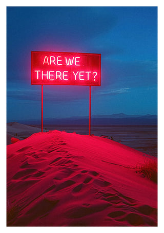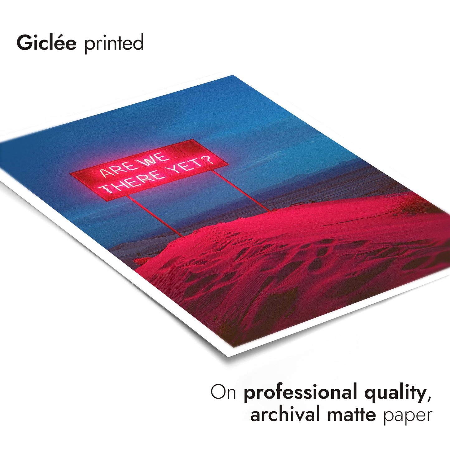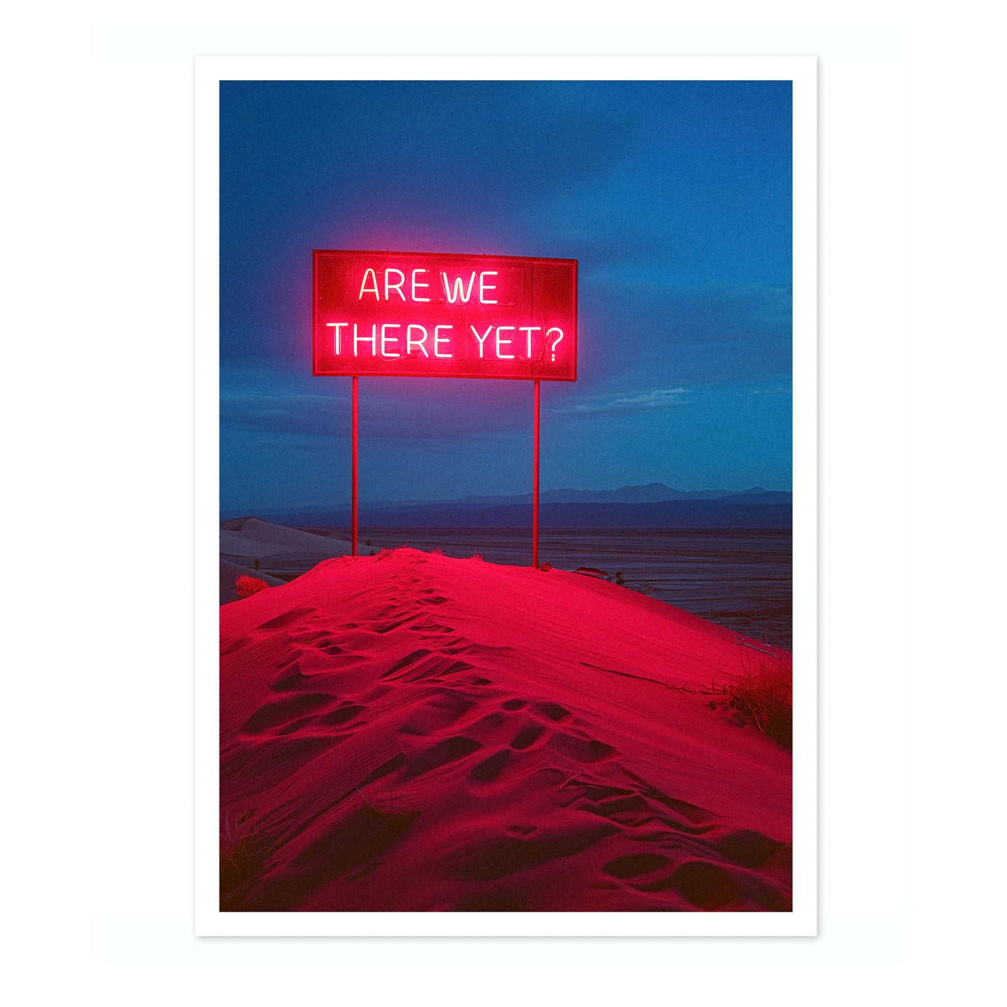 This "Are We There Yet?" poster showcases a striking neon sign against the backdrop of a darkening desert valley. The vibrant red glow of the sign contrasts dramatically with the deep blues of the twilight sky, creating a captivating and modern photographic artwork. Ideal for fans of neon photography and contemporary art, this print brings a unique and thought-provoking visual element to any space.