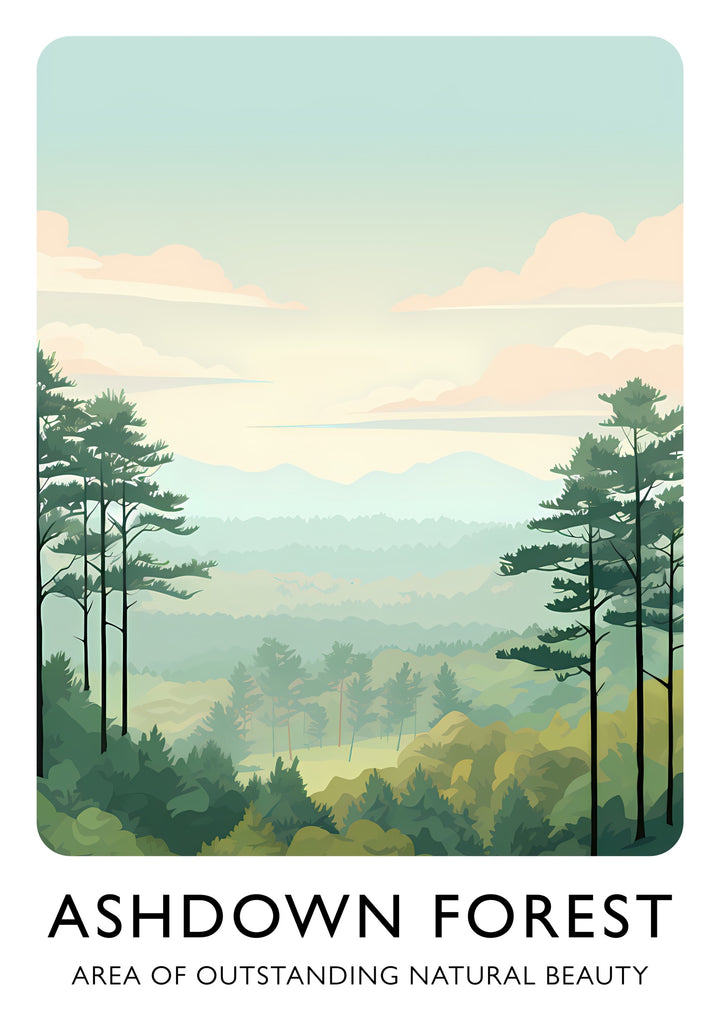 This Ashdown Forest poster beautifully captures the serene landscape of this Area of Outstanding Natural Beauty in Sussex, England. Featuring lush greenery, tall conifers, and soft clouds against a pastel sky, this illustration evokes tranquility and nature's charm. Ideal for nature enthusiasts, this graphic portrait highlights the picturesque allure of one of the UK's cherished forests.