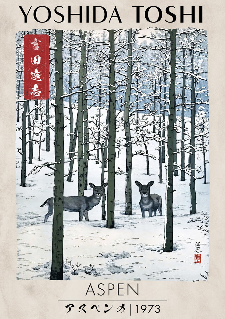 "Aspen" by Toshi Yoshida is a traditional Japanese woodblock poster capturing a serene winter landscape. The portrait features two deer standing amidst snow-covered aspen trees, evoking tranquility and natural beauty. The clear blue sky contrasts with the snowy ground, enhancing the overall visual impact. Ideal for nature and animal lovers, this artwork brings a touch of winter serenity to any space.