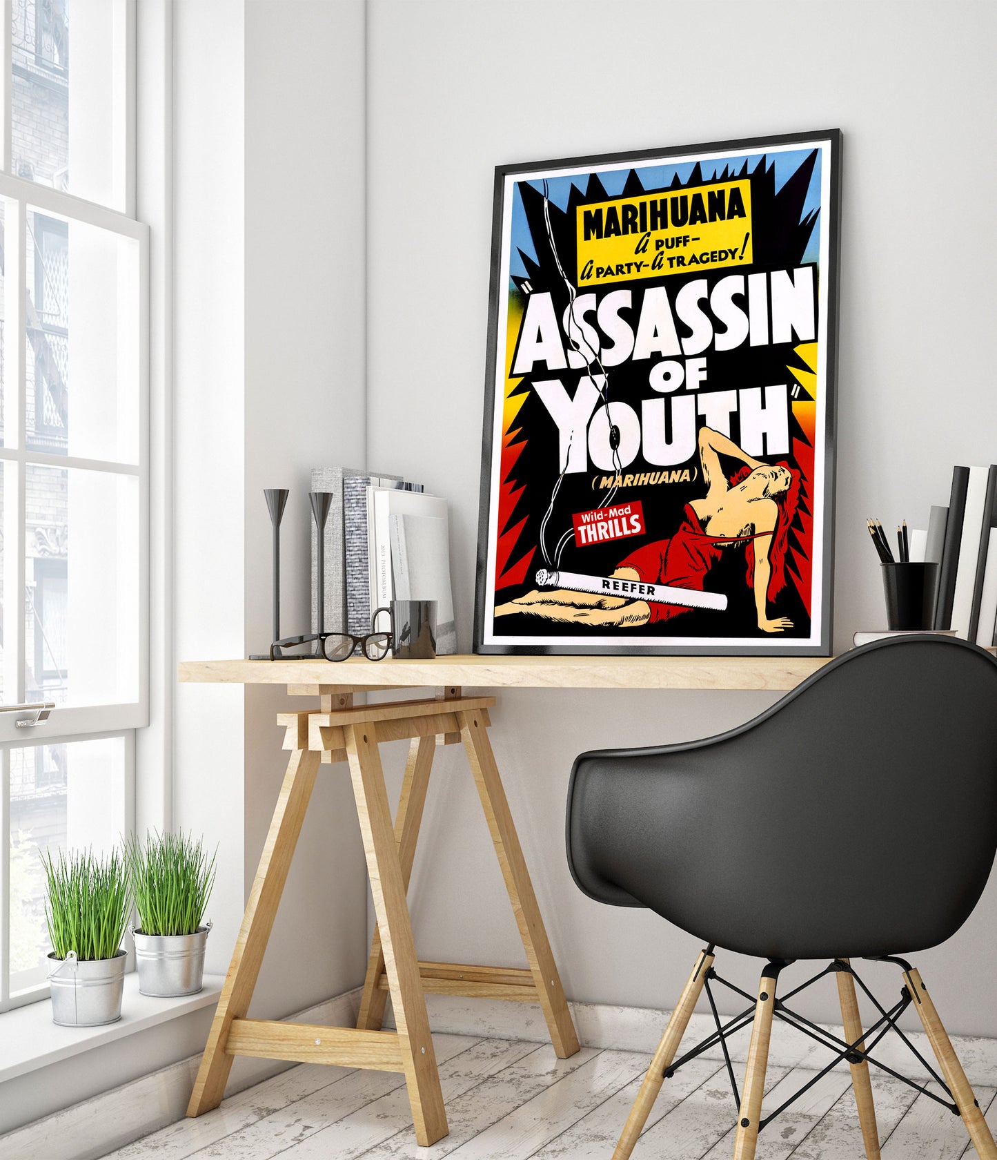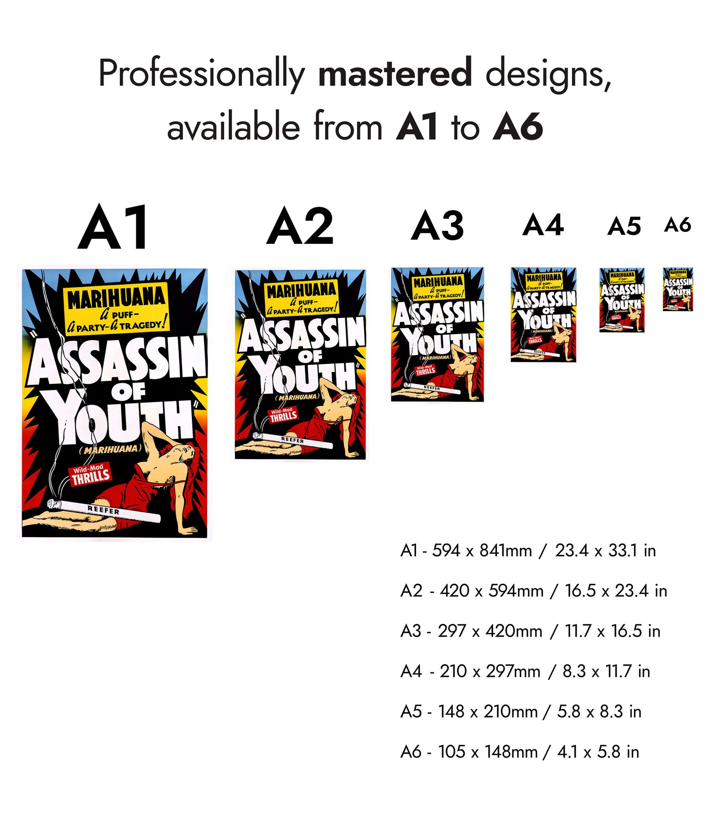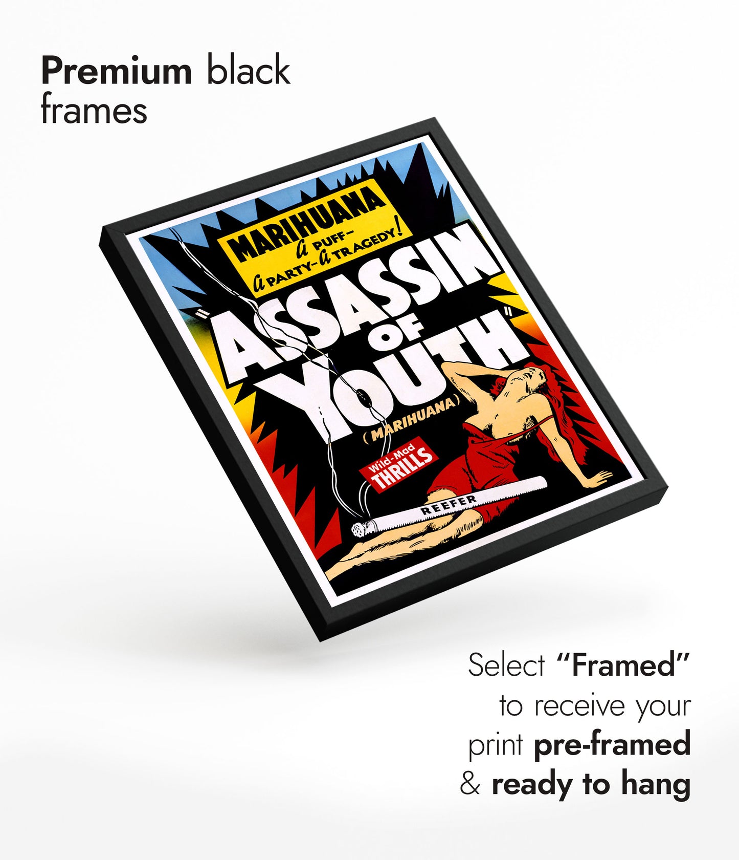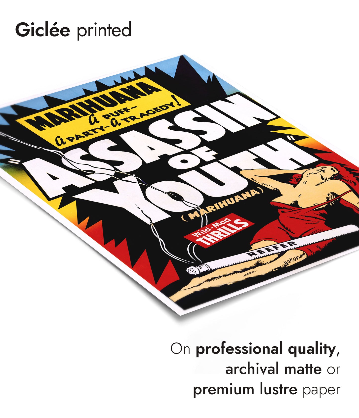 The "Assassin of Youth" poster features a vintage propaganda illustration from the mid-20th century. The artwork depicts a woman in red, lying provocatively with bold, eye-catching typography. The theme focuses on marijuana and its wild, tragic effects, highlighted by phrases like "Wild-Mad Thrills". This eye-catching poster is perfect for enthusiasts of retro aesthetics and pop art.