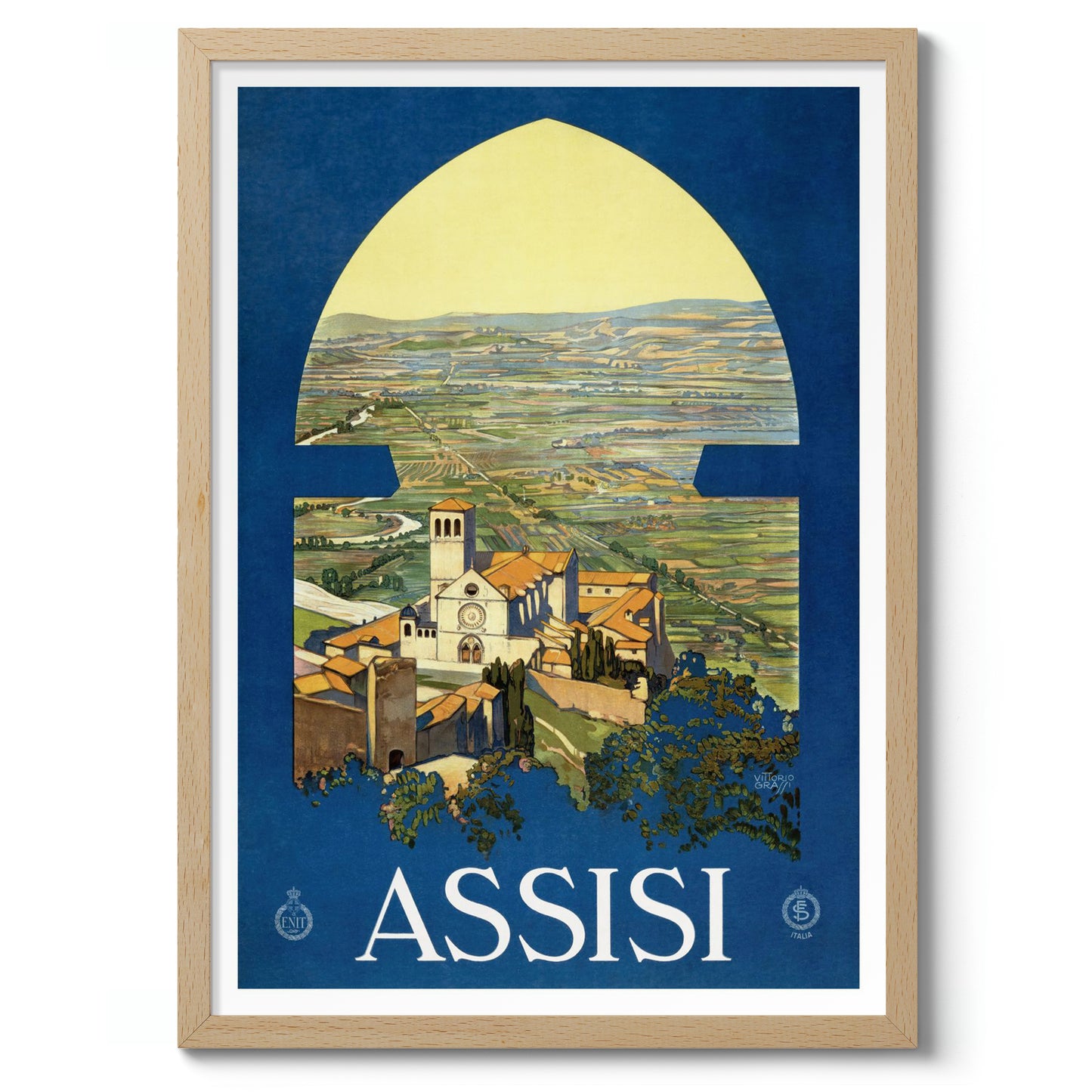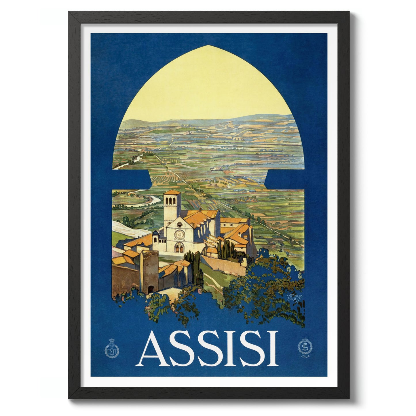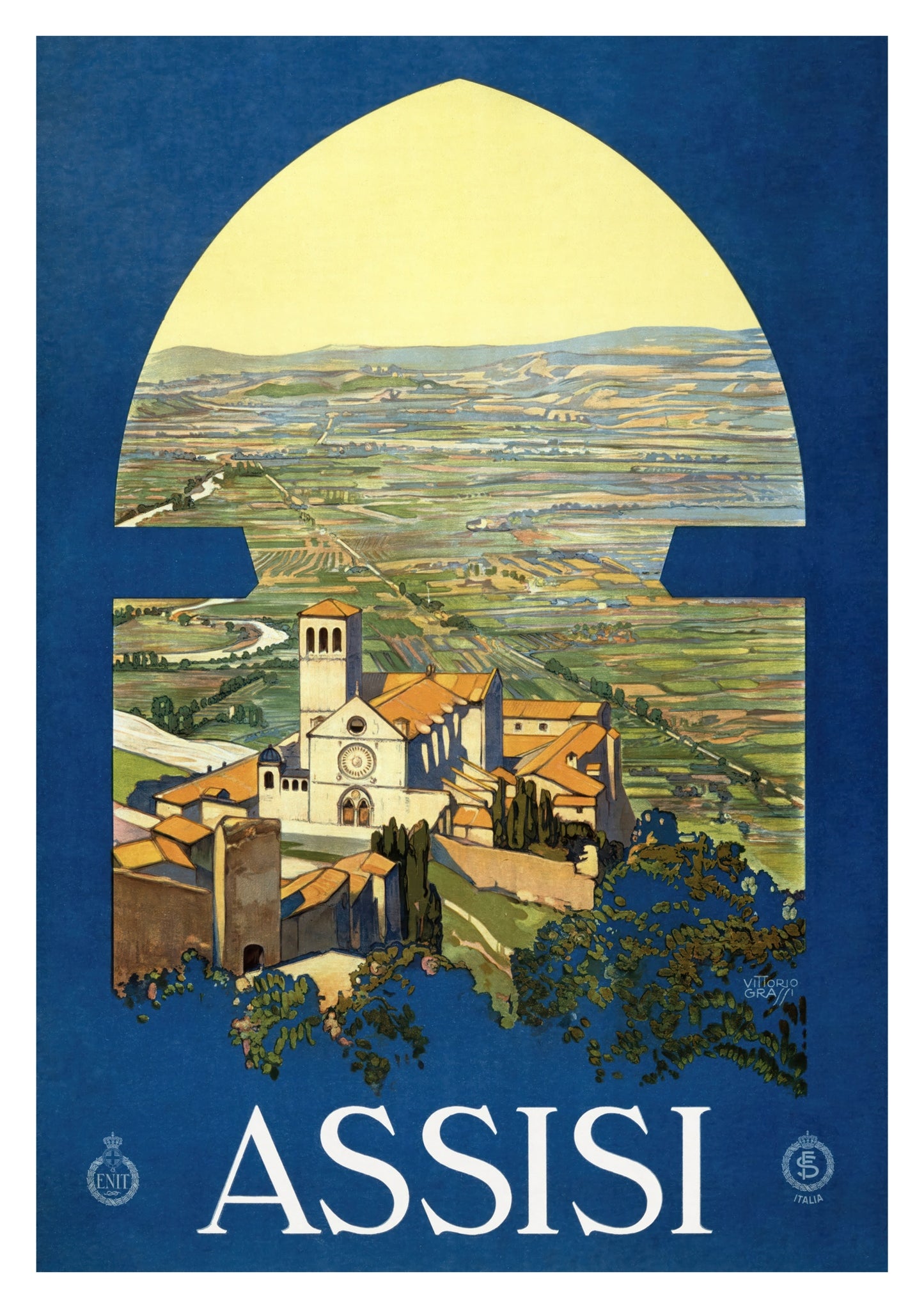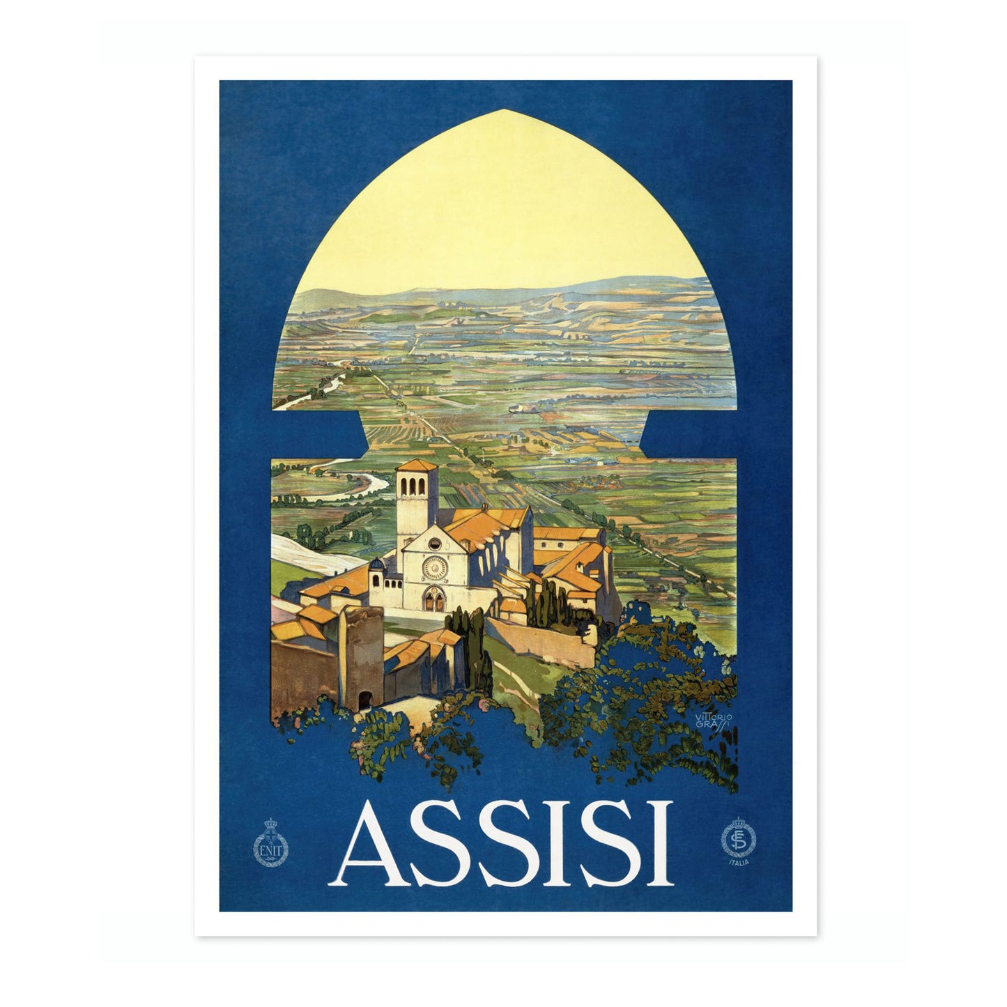 This vintage Assisi travel poster captures the serene Italian countryside through an arched window, highlighting the picturesque town and its iconic church. Dominated by rich blue and lush green tones, the illustration evokes a timeless sense of discovery and tranquility. Perfect for those drawn to classic travel art and the charm of Italy's landscapes, this poster enchants with its nostalgic depiction.