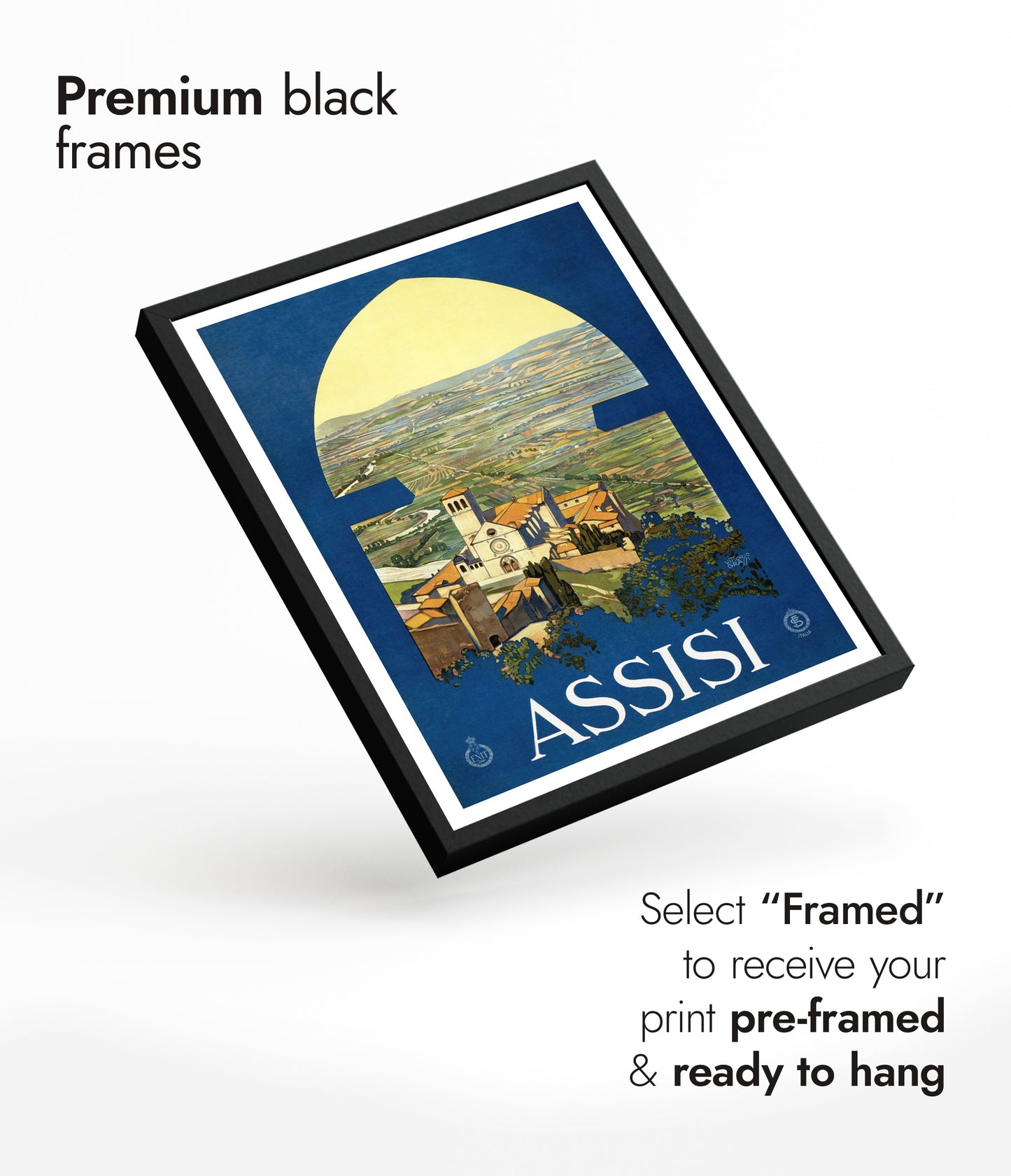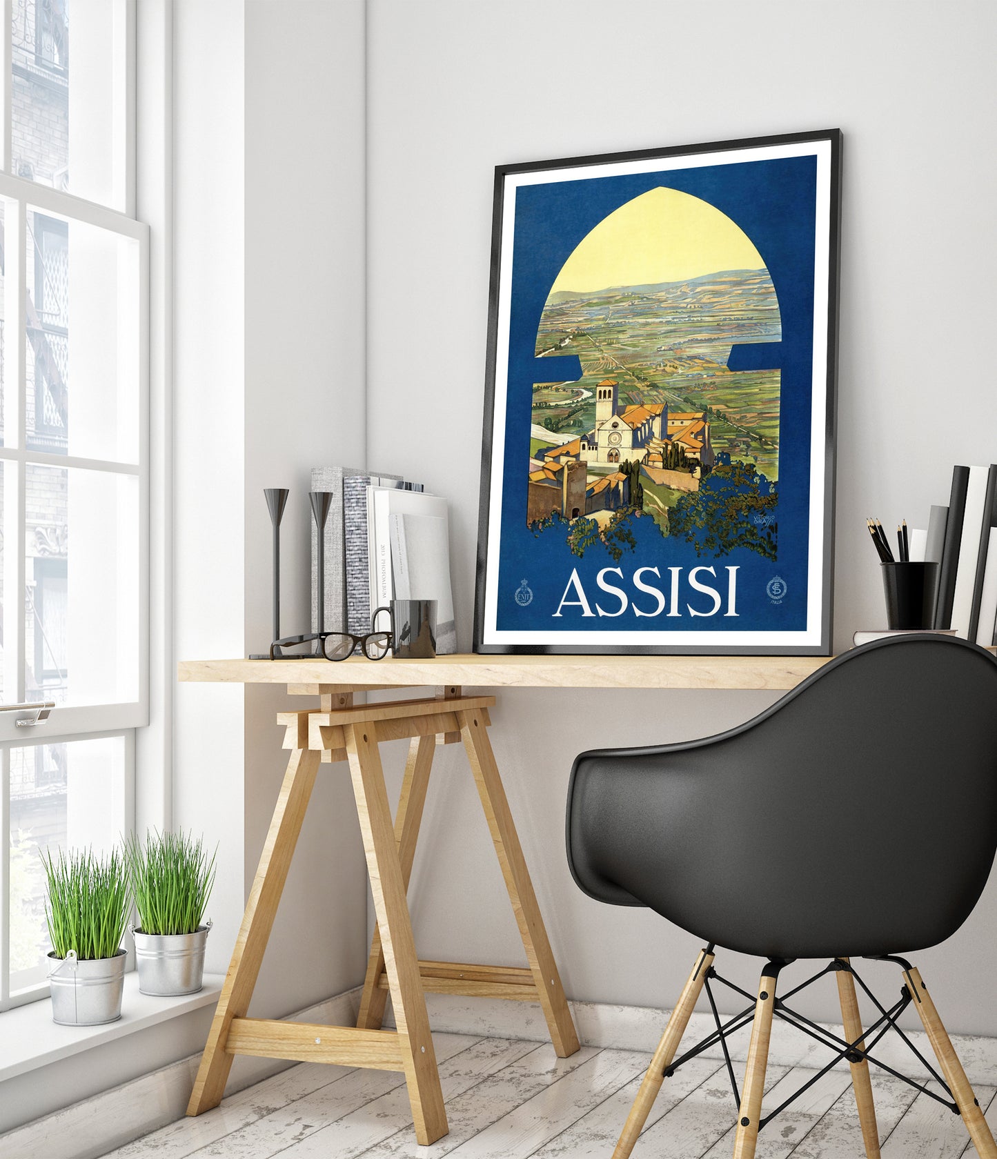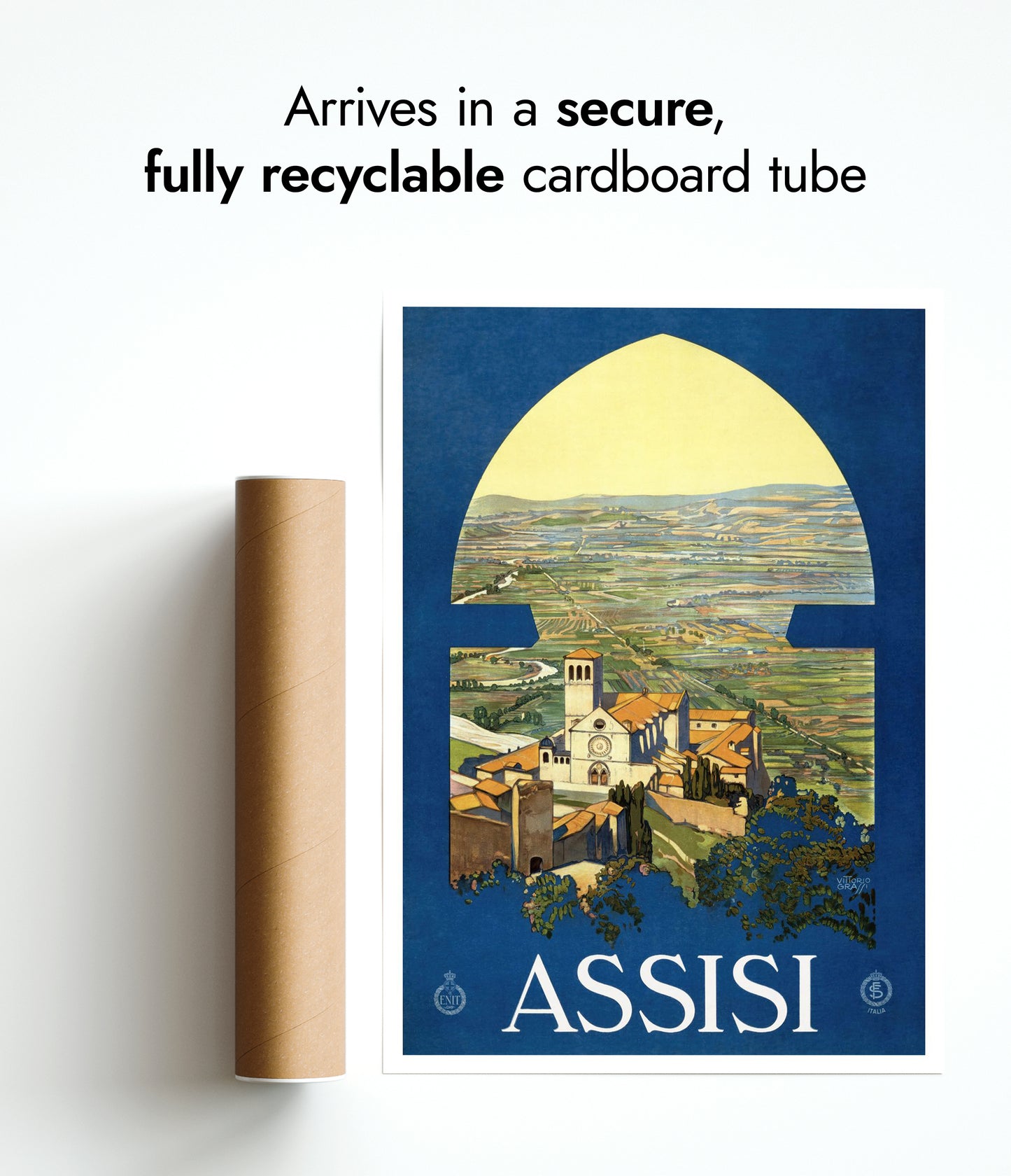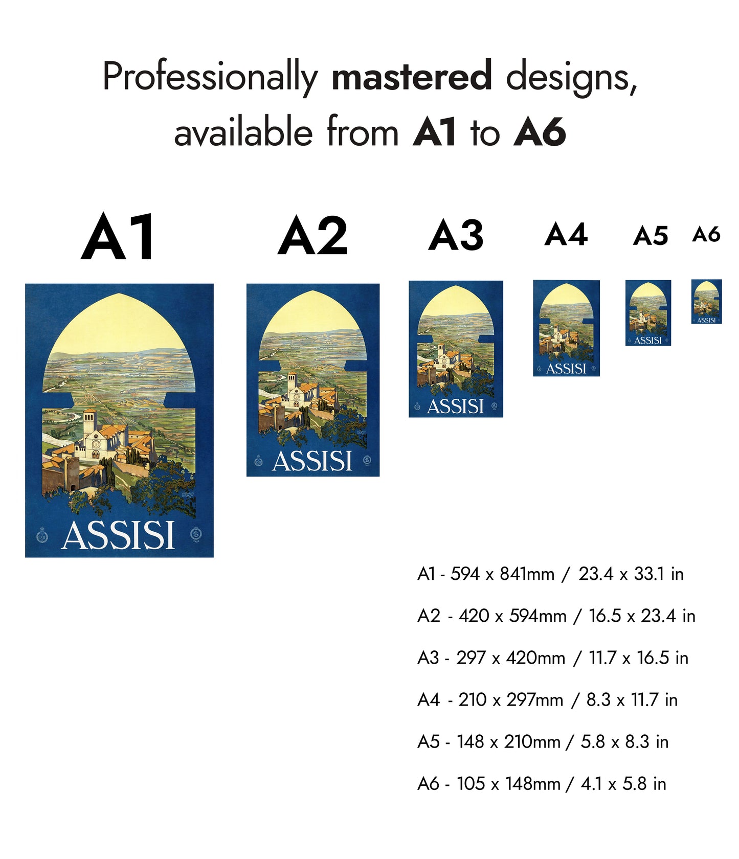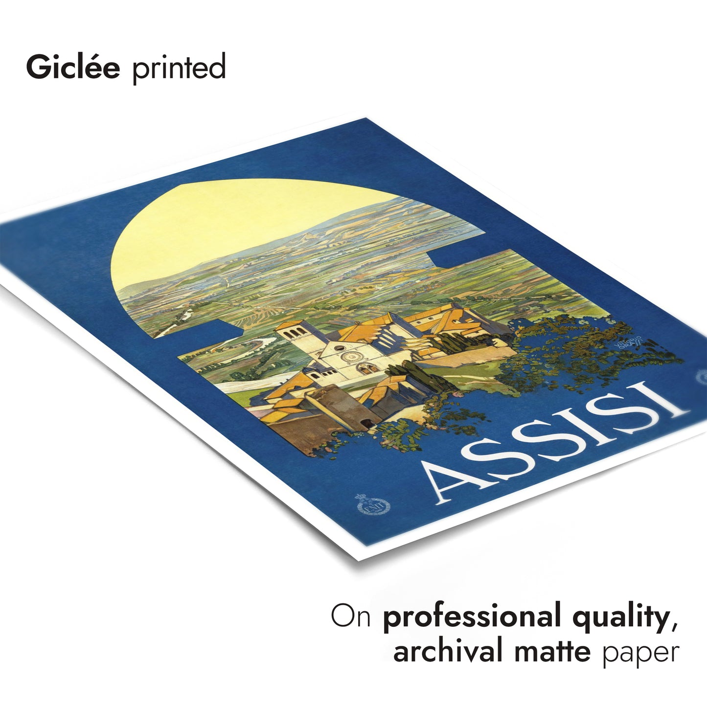 This vintage Assisi travel poster captures the serene Italian countryside through an arched window, highlighting the picturesque town and its iconic church. Dominated by rich blue and lush green tones, the illustration evokes a timeless sense of discovery and tranquility. Perfect for those drawn to classic travel art and the charm of Italy's landscapes, this poster enchants with its nostalgic depiction.