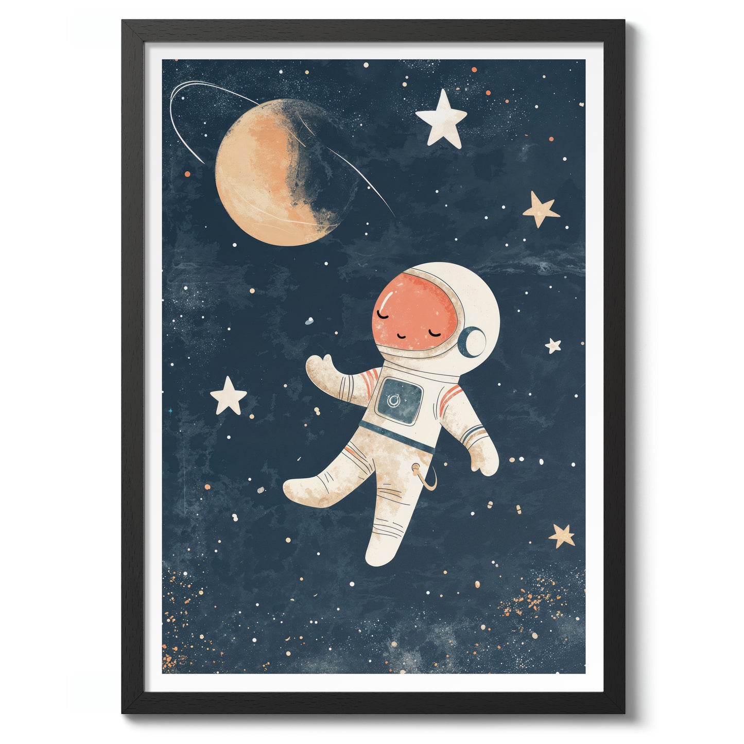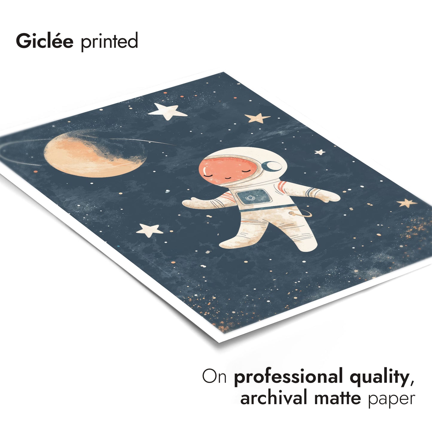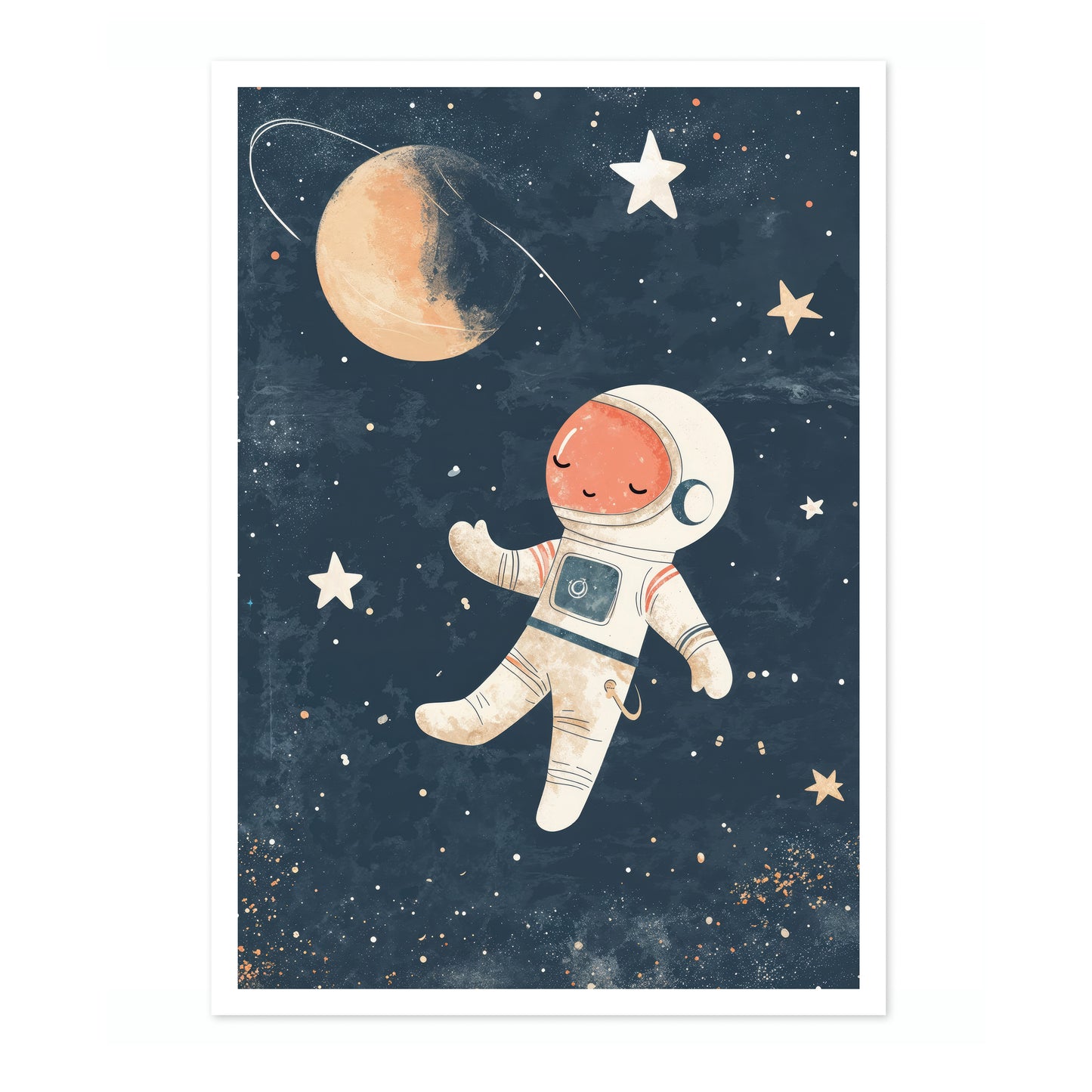 This charming "Astronaut" poster features an adorable illustration of a peaceful astronaut floating serenely in a star-filled galaxy. Perfect for nursery wall decor, the vibrant space-themed design includes stars, a planet, and a distant moon against a dark, cosmic backdrop. Ideal for creating an inspiring and dreamy environment for children who admire space and exploration.