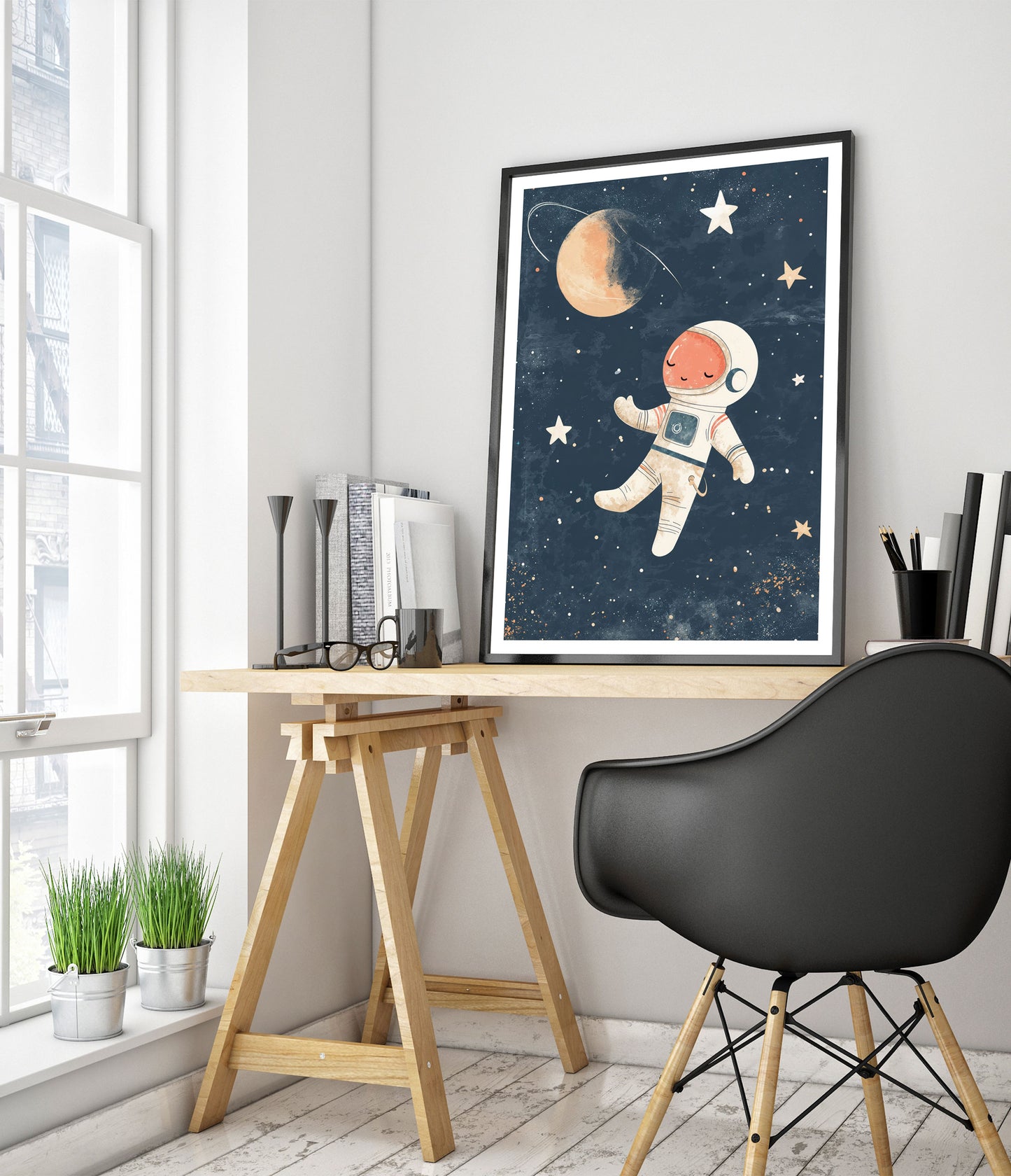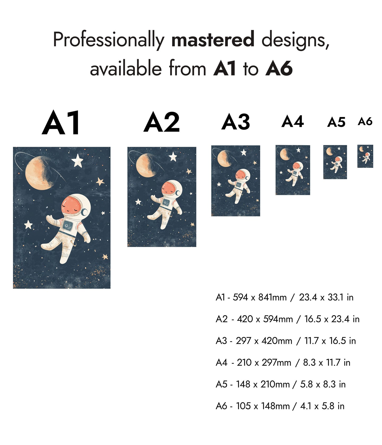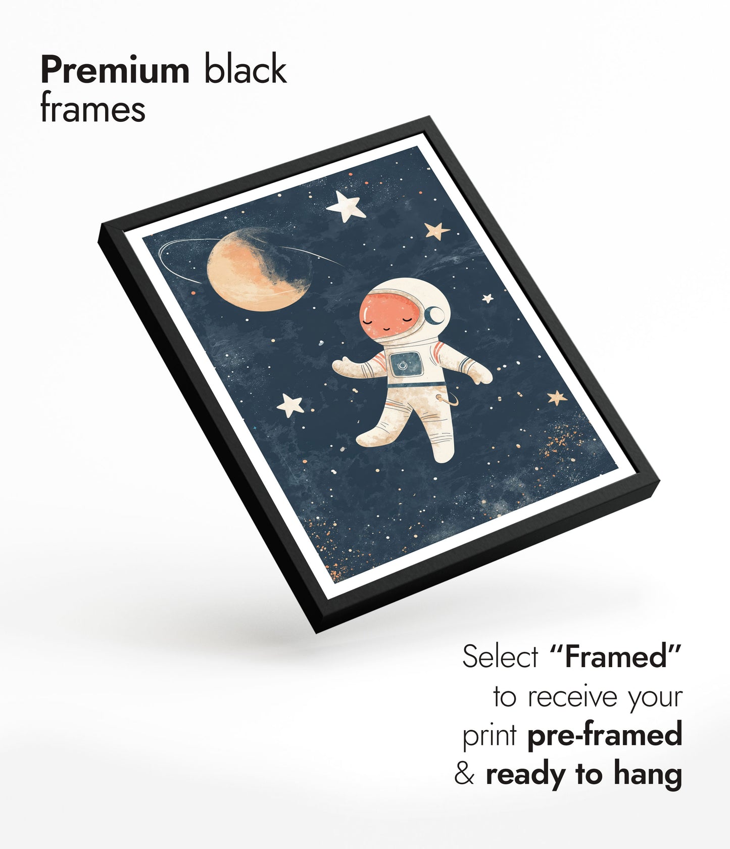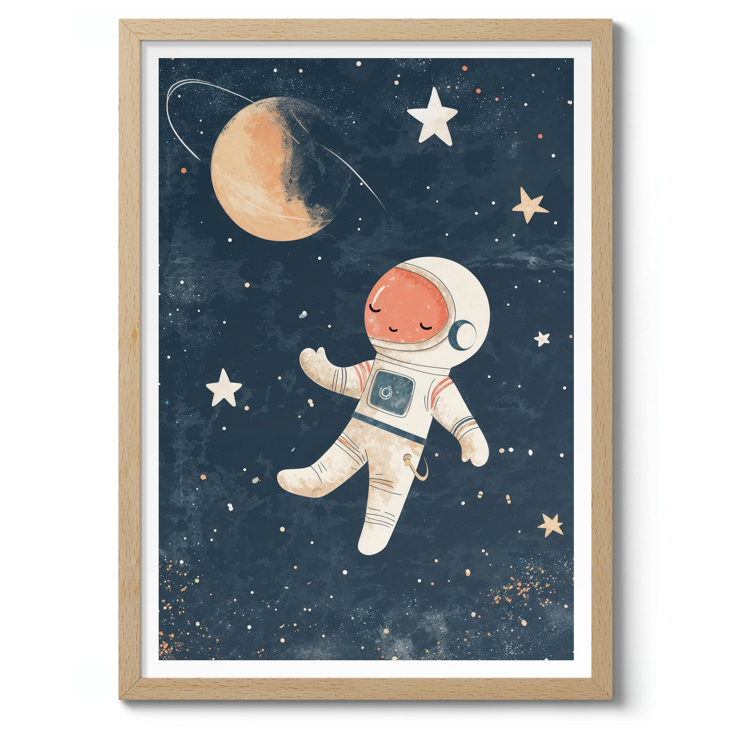 This charming "Astronaut" poster features an adorable illustration of a peaceful astronaut floating serenely in a star-filled galaxy. Perfect for nursery wall decor, the vibrant space-themed design includes stars, a planet, and a distant moon against a dark, cosmic backdrop. Ideal for creating an inspiring and dreamy environment for children who admire space and exploration.