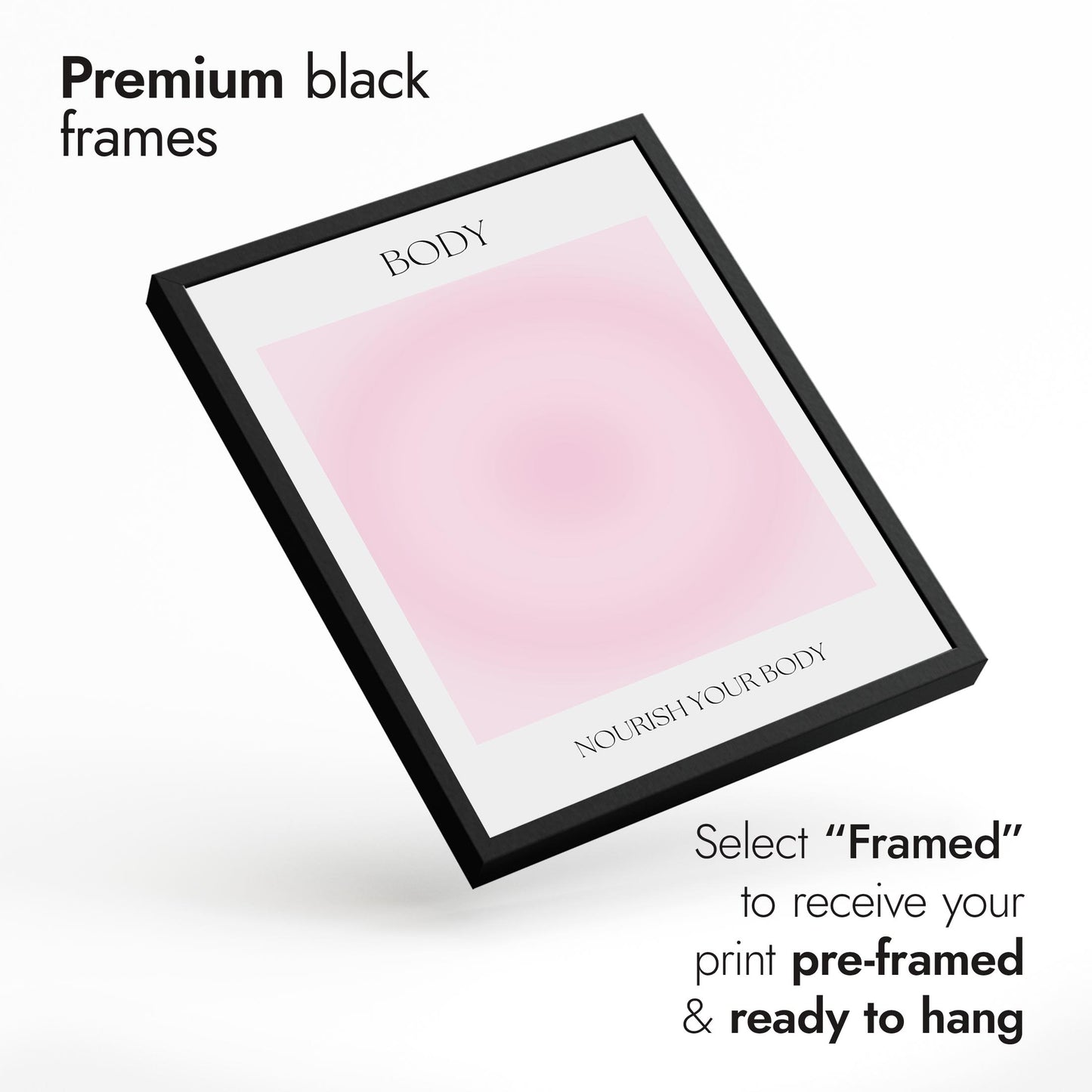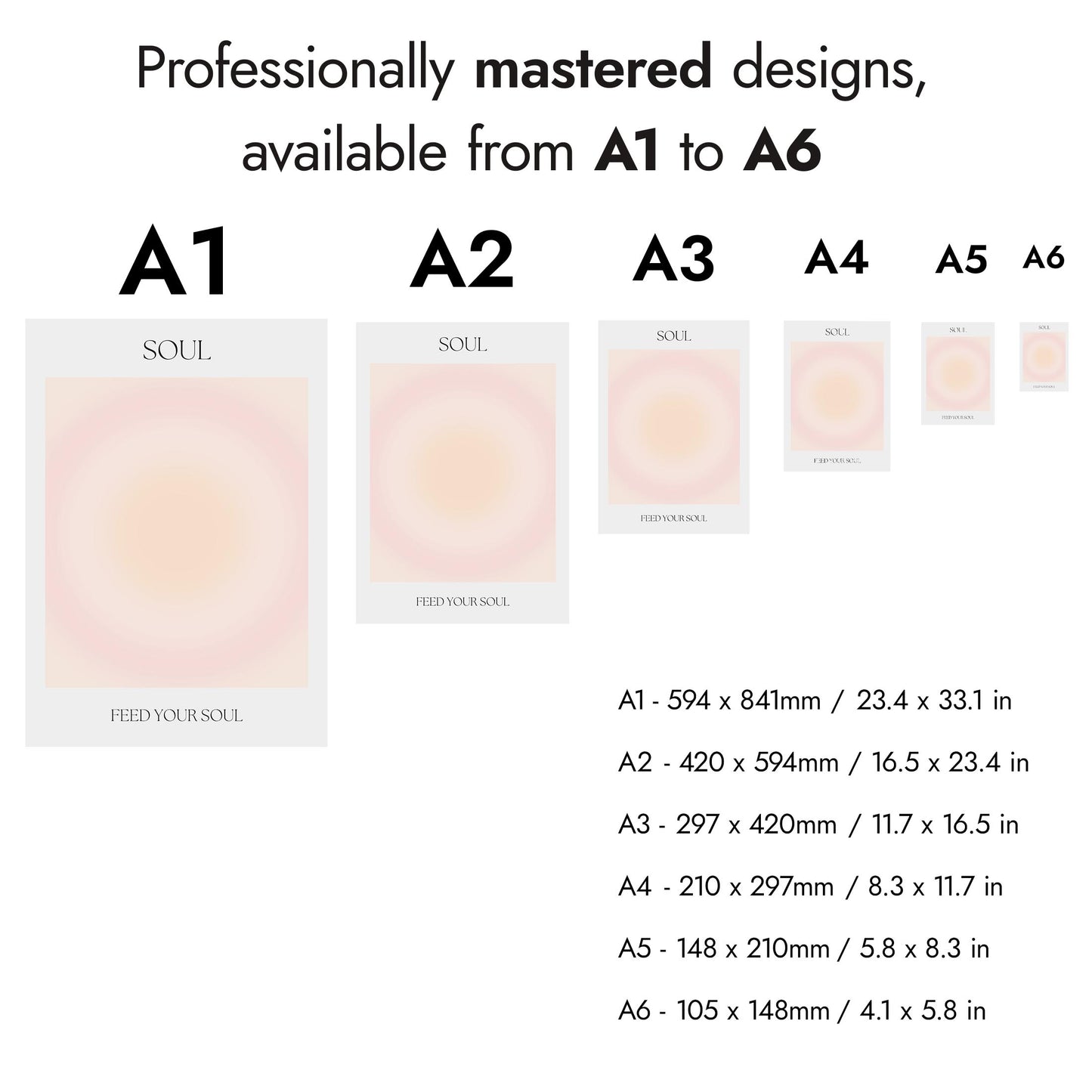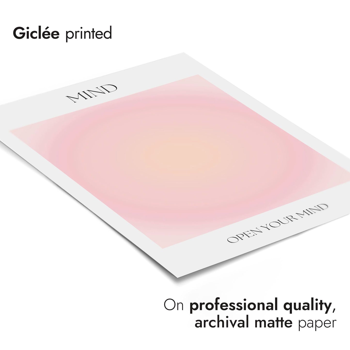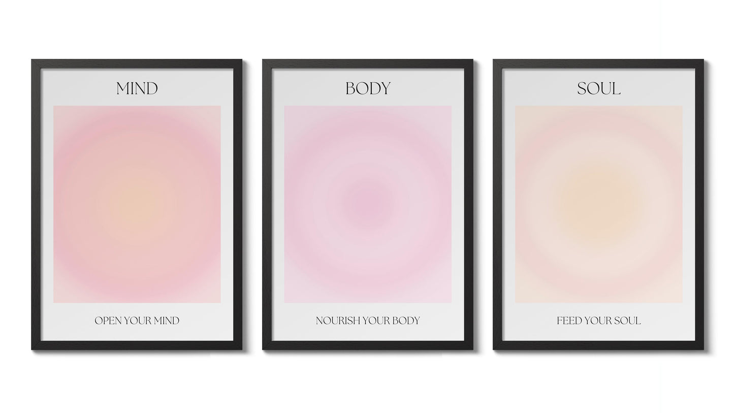 The "Aura Affirmations" poster trio elegantly combines modern abstract art with spiritual themes. Each piece features a calming gradient of pink and orange circles, labeled "Mind," "Body," and "Soul," with affirmations below, creating a harmonious visual experience. This graphic poster set infuses spaces with positive vibes, serving as a serene reminder to nourish your inner being. Perfect for lovers of minimalist, abstract decor.