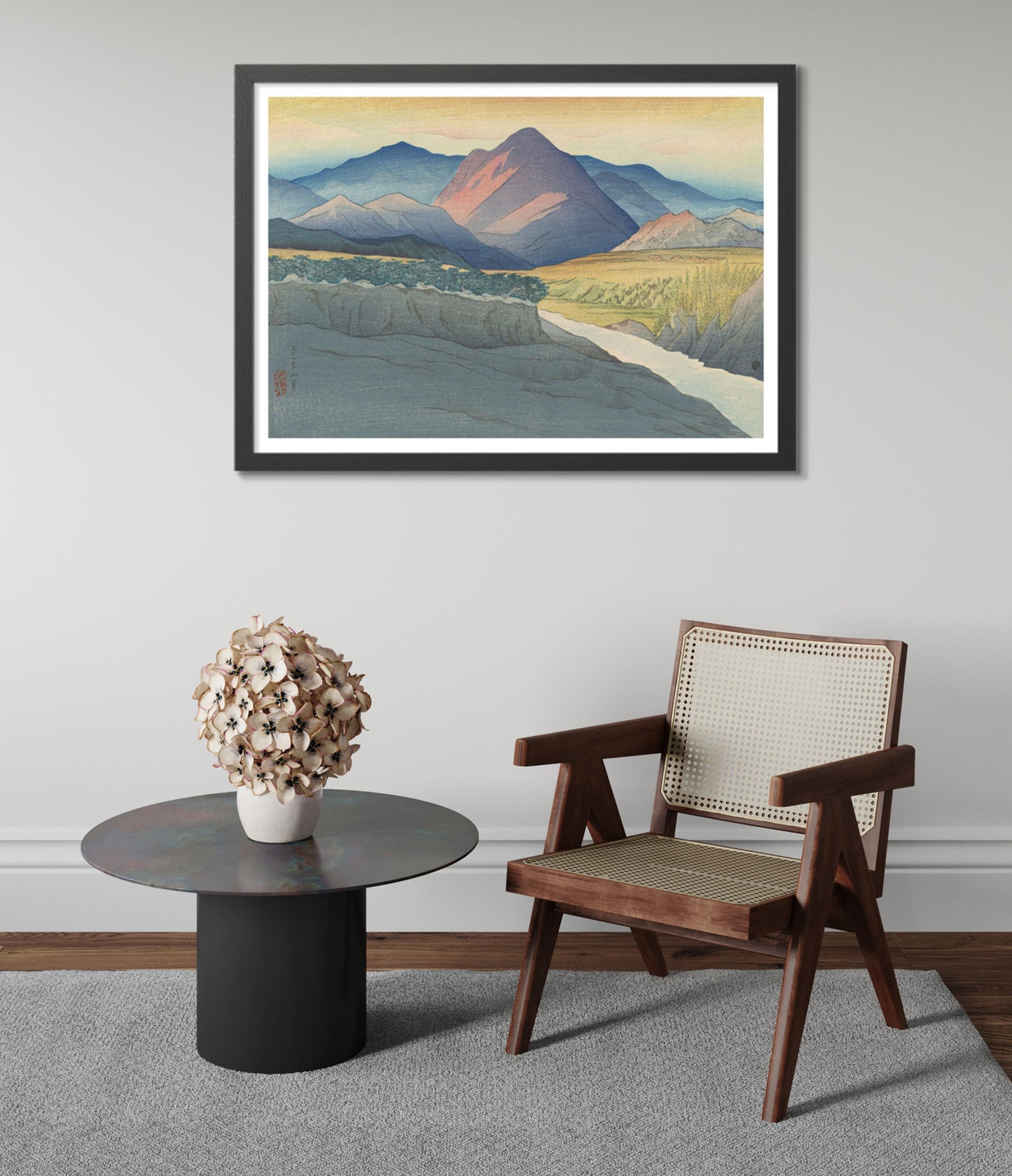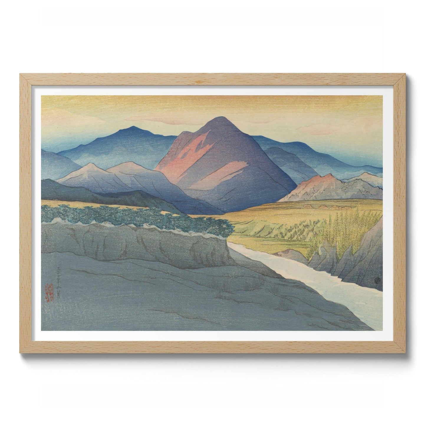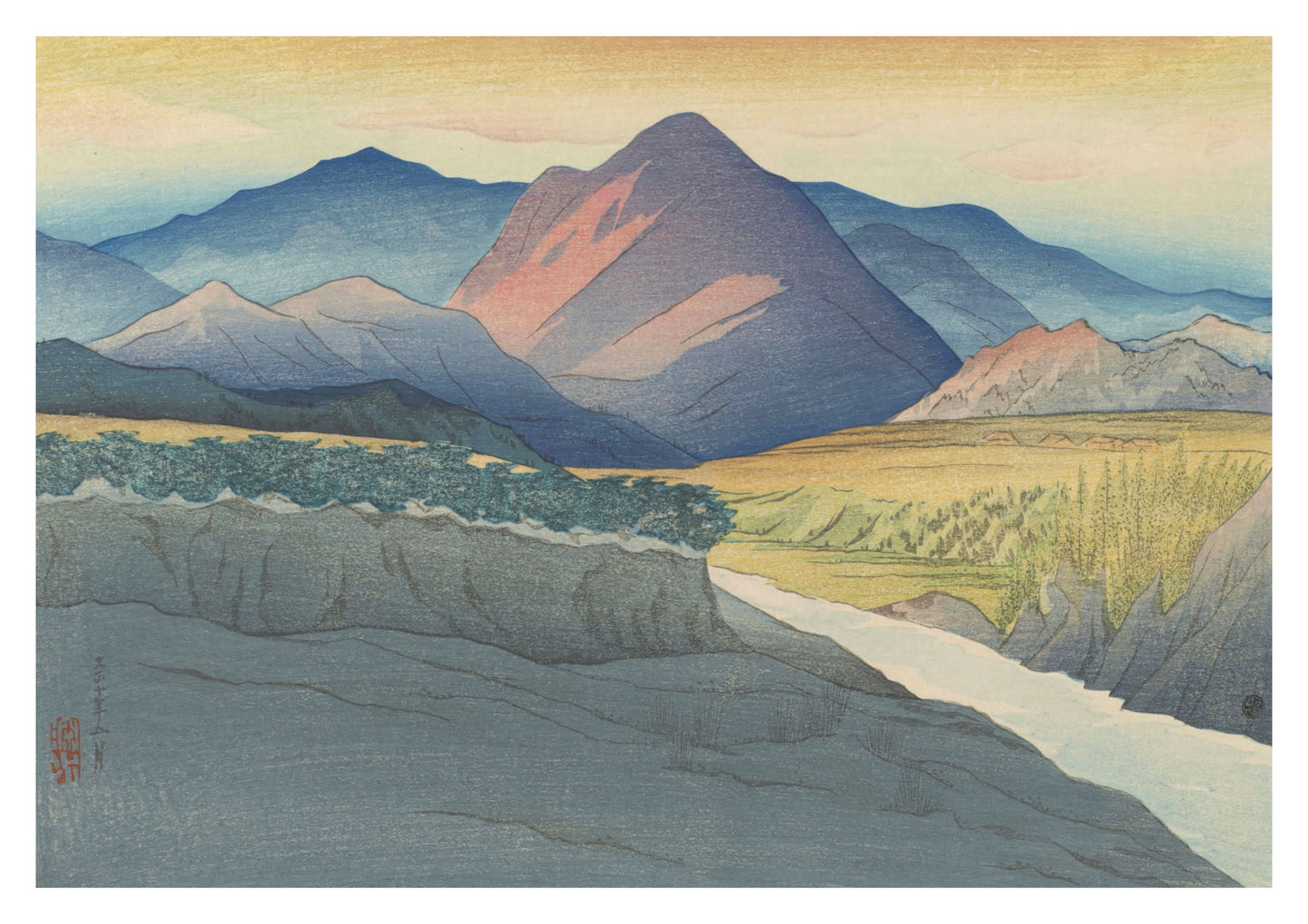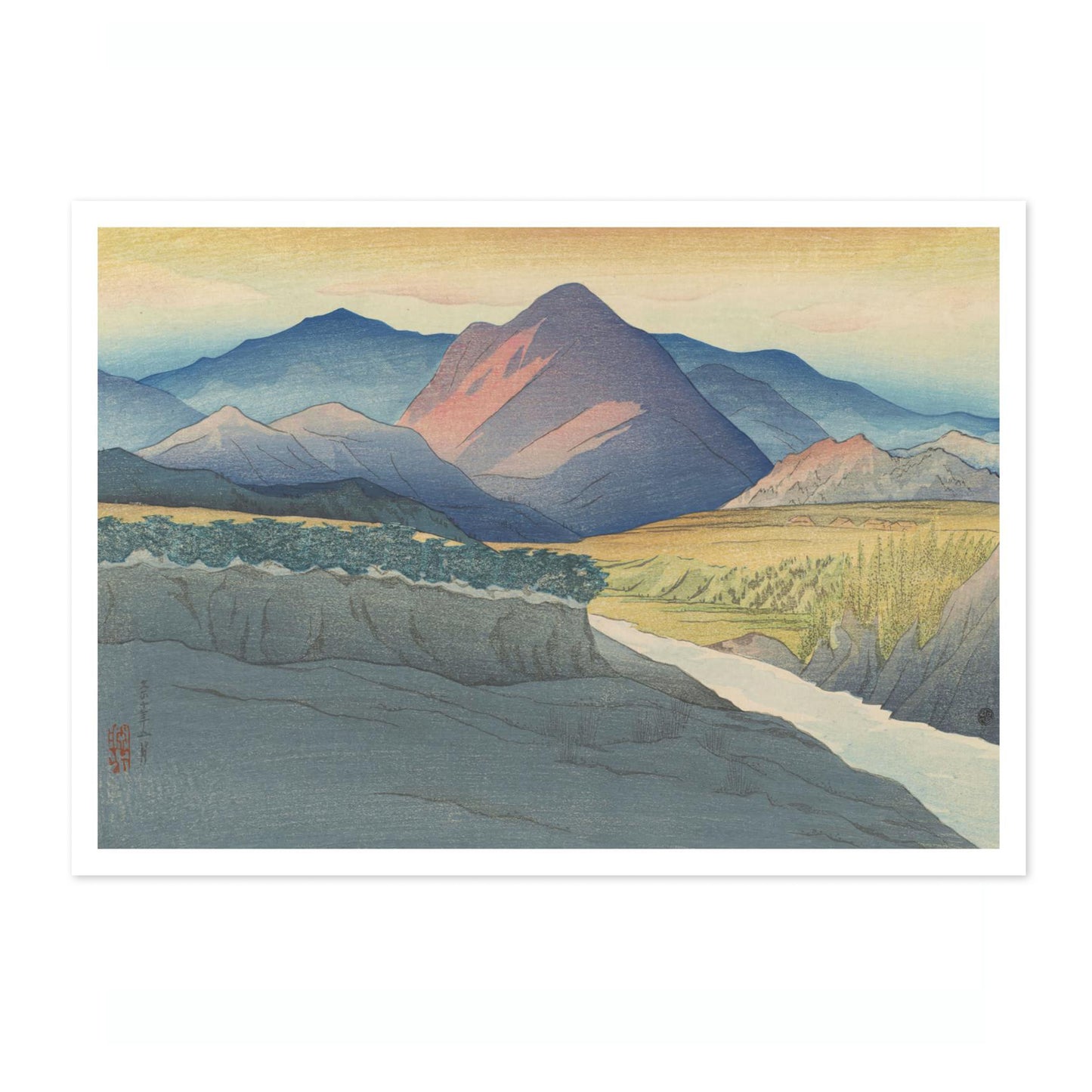 "Autumn Sunset" is a captivating poster featuring Shinsui Ito's traditional woodblock artistry from 1921. This serene composition showcases the vibrant hues of an autumn sunset, casting warm orange and green tones over majestic mountains, a flowing river, and expansive fields. The harmonious blend of nature embodies the classic Ukiyo-E and Shin-Hanga styles, making it an exquisite addition to any decor.