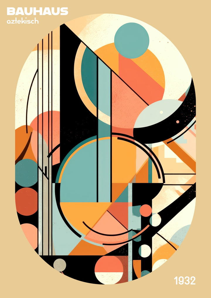 The "Aztekisch #2" Bauhaus poster from the Mid-Century collection features a vibrant array of abstract geometric shapes. Dominated by circles and intersecting lines in earthy tones and muted pastels, the design epitomizes the Bauhaus movement's aesthetic. This graphic portrait is ideal for anyone who appreciates modern, minimalistic artwork with a historical touch.